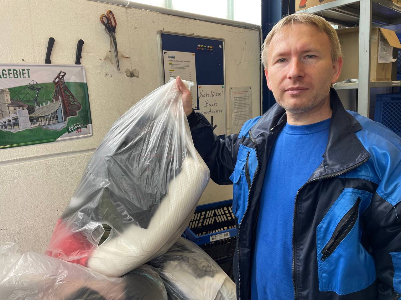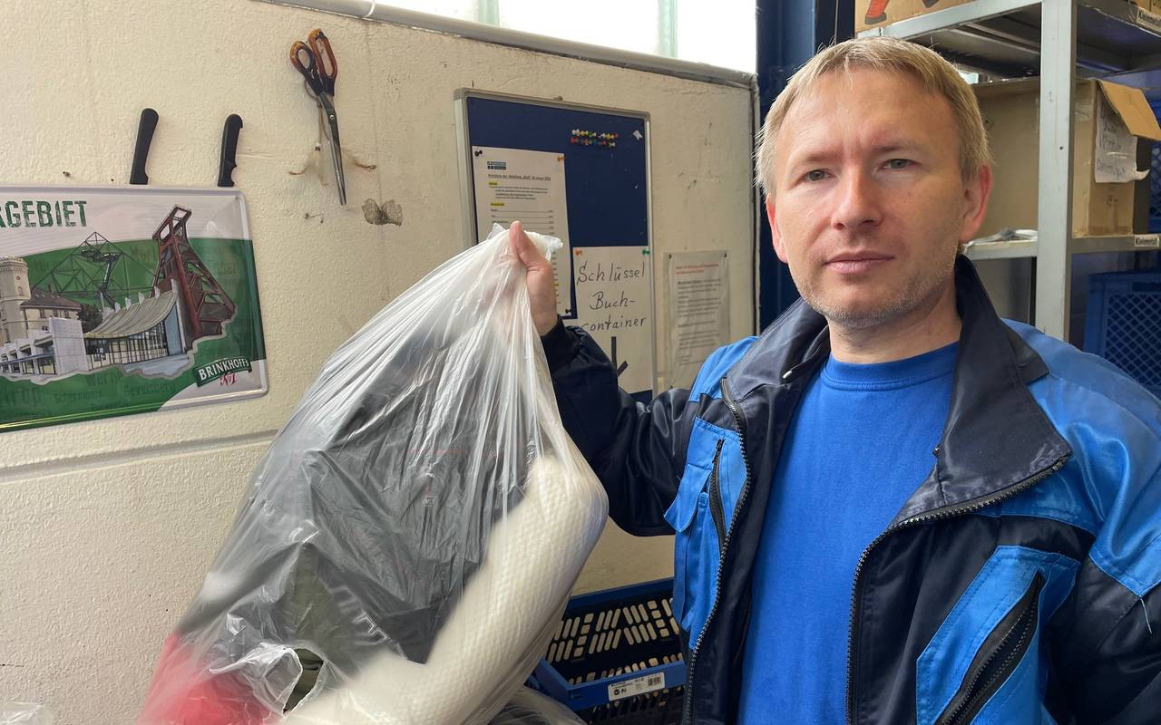 Bei der Neuen Arbeit an der Langemarckstraße trifft Radio Essen-Stadtreporter Timm Schröder den Fahrer des Textilmobils. Stefan kommt von seiner Tour durch Freisenbruch zurück. Eine App navigiert ihn zu den einzelnen Adressen, bei denen er Altkleiderspenden abholen darf. Heute ist die Ausbeute nicht ganz so groß. Zusammen mit einem Kollegen packt er die vollen Säcke auf einen großen Tisch in der Ablieferung. Hier übernimmt Pamela. Sie nimmt jedes Kleidungsstück einzeln in die Hand und überprüft sehr genau, ob es noch zu gebrauchen ist oder in die Weiterverwertung von Remondis geht. Die eine oder andere Überraschung ist dabei inklusive. Zu den guten Sachen gehört auch eine kleine Kinderjeans. Sie landet jetzt in der Kiste mit dem Schild: Kinder/Winter. Da bleibt sie aber nicht lange. Kurze Zeit später angelt sich Katja die Kinderhose aus der Kiste. Sie gehört zum Verkaufsteam des Sozialkaufhauses auf der anderen Seite des Gebäudes. Auch sie schaut sich das Kleidungsstück nochmal genauer an, befestigt ein Preisschild daran und hängt es an den passenden Ständer. Für 1,50 Euro soll sie später mal verkauft werden und damit ein zweites Leben bekommen.