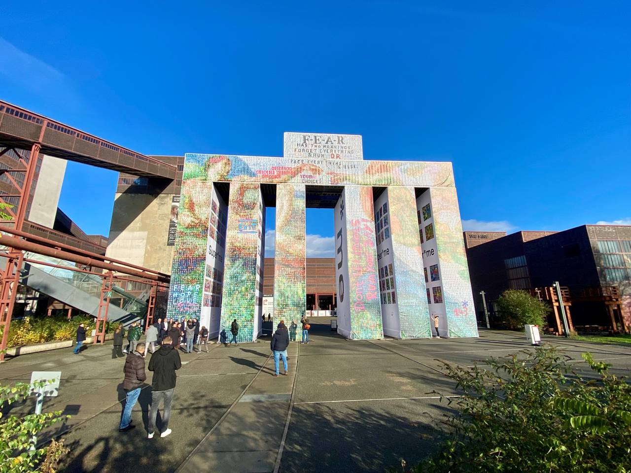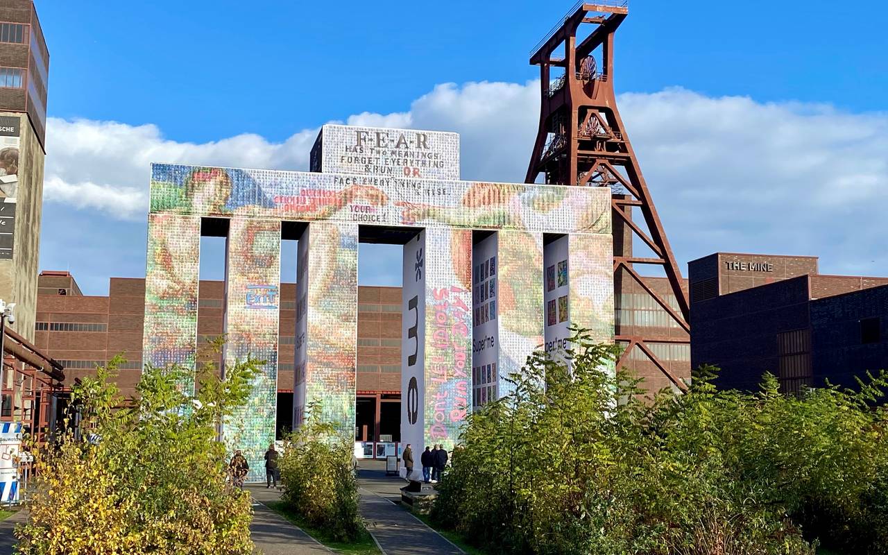 Das Kunstwerk in Essen heißt "Global Gate", angelehnt an "Berlin Gate", denn so nennen Besucher aus aller Welt das Brandenburger Tor. Am Montag (18. November) wurde es offiziell eröffnet. Eine Seite des Kunstwerks ist schon mit LKW-Folie überzogen, auf der bunte Motive zu sehen sind. Eine Woche später wird auch die Rückseite mit LKW-Folie überzogen. Auf der Folie sind QR-Codes. Wer sie scannt, bekommt kurze Filme und Infos zum Thema Demokratie zu sehen. Damit wollen die Macher der Kunstaktion mehr Jugendliche und auch mehr junge Erwachsene auf Zollverein holen. Die offizielle Eröffnung des Kunstwerkes am 18. November, wurde parallel zur Eröffnung der KI Biennale auf Zollverein gelegt. Die KI Biennale findet alle zwei Jahre in Essen statt. Eine Woche lang sprechen Experten aus der Politik und der Wirtschaft über künstliche Intelligenz in der Industrie, in der Medizin und in der Kunst.