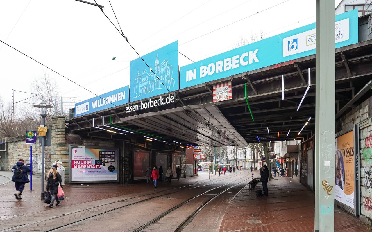 Das Eingangstor zur Marktstraße in Essen-Borbeck hat ein neues Gesicht. Der Schriftzug "Willkommen in Borbeck" hängt ab sofort an der Brücke des S-Bahnhofs und soll Gäste, aber auch die Menschen in Borbeck selbst, zum Schlendern und Shoppen im Stadtteil einladen. Auf dem Schild sind außerdem die Silhouetten des Schloss Borbeck, der Kirche St. Dionysius und der Dampfbierbrauerei abgebildet. Alle diese Sehenswürdigkeiten gehören zu Borbeck.
