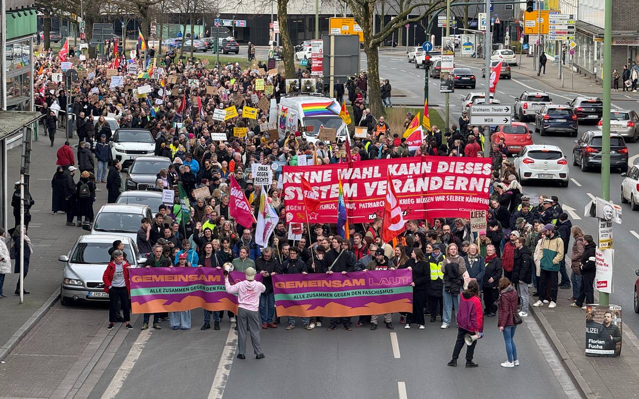 Die Essener Polizei spricht von 8.500 Teilnehmerinnen und Teilnehmern in der Spitze. Das deckt sich mit den Beobachtungen unseres Stadtreporters. Außerdem habe es laut Polizei keine besonderen Vorkommnisse gegeben. Die Zahl der Teilnehmenden ist damit geringer als bei der letzten Demo Anfang Februar: Damals waren ungefähr 15.000 Menschen gekommen - nur 3.000 waren damals angemeldet. Jetzt waren 8.000 Menschen zu der Demonstration angemeldet. Organisiert wurde die Demonstration vom Essener Bündnis "Gemeinsam laut" - das Bündnis hatte die Proteste rund um den AfD-Parteitag letztes Jahr organisiert. Kurzzeitig hat die Demonstration für Einschränkungen auf den Straßen gesorgt, größere Staus gab es deswegen aber nicht. Die Route führte quer durch die Innenstadt am Grillo-Theater und dem Rathaus vorbei. Die Stimmung bei der Demonstration war dabei relativ ausgelassen - trotz der Sorgen, die sich viele von ihnen wegen der politischen Situation machten, haben uns viele Teilnehmende erzählt.