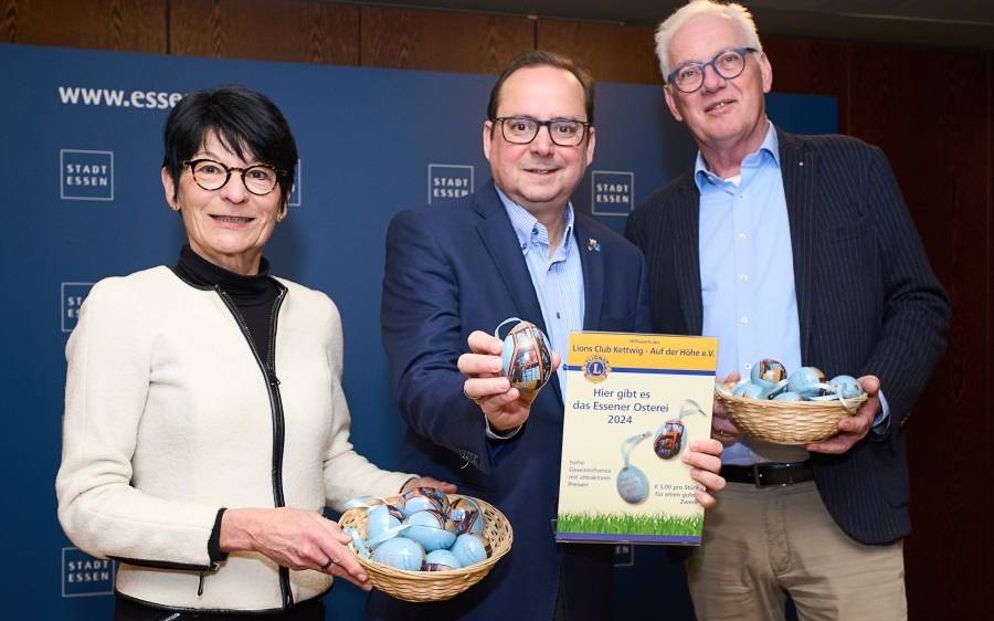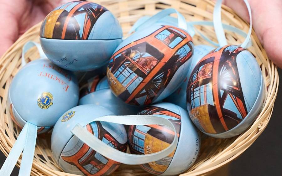 Der Lionsclub Kettwig auf der Höhe verkauft in diesem Jahr ganz spezielle Ostereier für den guten Zweck hier bei uns in Essen. Die 4000 hochwertigen Plastikeier haben ein großes Bild von der Zeche Zollverein und eine Schlaufe, um sie zum Beispiel an einen Osterstrauch zu hängen.
