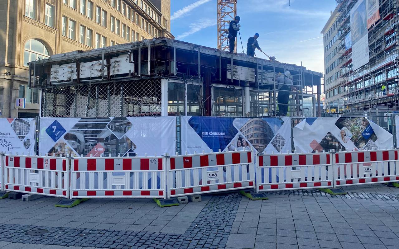 Der alte Pavillon auf dem Willy-Brandt-Platz in Essen wird gerade abgebaut. Er soll durch einen eleganten Neubau, mit großen Fenstern ersetzt werden. So soll auch der Blick in die Kettwiger Straße frei bleiben. Der neue Pavillon soll "Königstreppe" heißen, passend zum neuen Namen des ehemaligen Kaufhauses, dem "Königshof". Das ehemalige Kaufhof-Haus wird gerade sehr aufwändig kernsaniert. Der alte Pavillon wäre neben dem eleganten "Königshof" und dem historischen Handelshof ein unübersehbarer Schandfleck. Deshalb kommt er jetzt weg.
