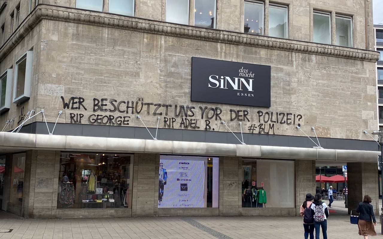 Seit heute Morgen prangt an einer Fassade am Willy-Brandt-Platz ein schwarzer Schriftzug. Da steht: "Wer schützt uns vor der Polizei?" Und weiter: "RIP George RIP Adel B. #BLM". Die Polizei ermittelt jetzt unter anderem wegen Sachbeschädigung.