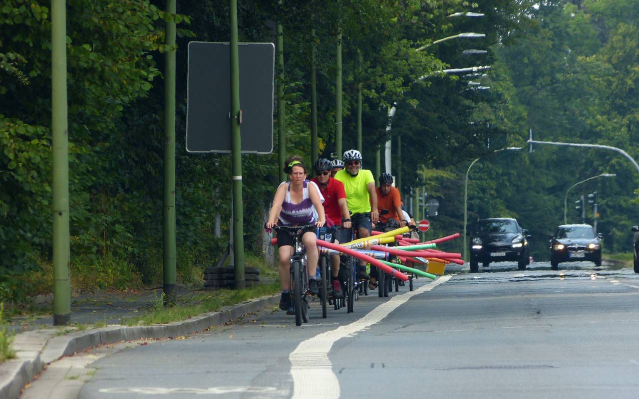 Eine Fahrrad-Gruppe fährt zusammen mit Poolnudeln durch den Essener Norden. Die Poolnudeln schnallen sie quer auf ihren Gepäckträger. Die Aktion soll für mehr Abstand zwischen Autos und Fahrrädern sorgen.