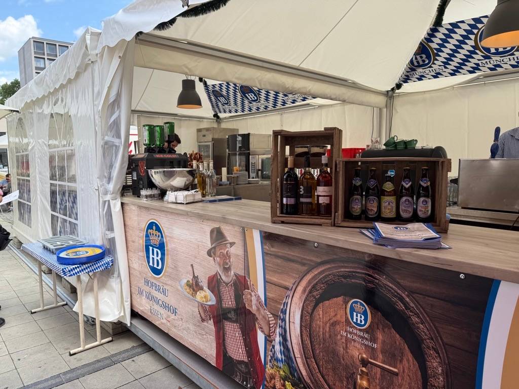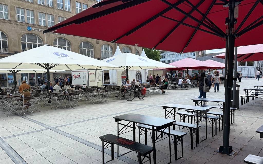 In der Essener Innenstadt hat am Dienstag (15. Juli) ein neuer Biergarten direkt auf dem Willy-Brandt-Platz eröffnet. Schon am Montag (14. Juli), um 17 Uhr hat Betreiber Lars Becker – bekannt durch das Lokal „Der Löwe“ am Kopstadtplatz – in kleiner Runde auf die Eröffnung angestoßen. Schon da waren einige Tische besetzt. Ab Dienstag (15. Juli) könnt Ihr täglich ab 12 Uhr auf den rund 350 Sitzplätzen essen und trinken. Im Pop-up-Biergarten gibt’s klassisches bayerisches Essen: zum Beispiel Käsespätzle, Ochsensemmel oder frisch gegrilltes Hähnchen – dabei kostet kein Gericht mehr als 15 Euro.