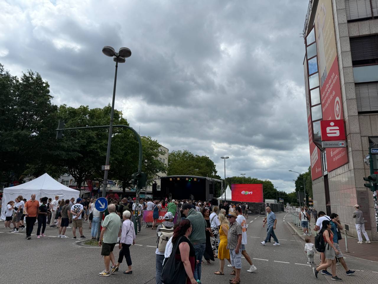 Die Stimmung beim Projekt Rüttenscheid war sehr entspannt, obwohl es ziemlich voll war. Die Bühnen haben viele Leute angelockt und auch Menschen, die an der Rü wohnen, haben ihren Balkon kurzerhand zur DJ-Bühne umfunktioniert. Dazu gab es viel Leckeres zu Essen und zu Trinken - das kühle Bier war dabei für viele das Highlight. Der gesperrte Kilometer der Rü war auf jeden Fall sehr gut besucht, besonders voll war es vor der Radio Essen Pop-Bühne, der Powerstage an der Martinstraße und der Lila Bühne direkt auf der Rü. Viele haben sich mit ihren Freundinnen und Freunden auf ein Getränk getroffen - und auch das Wetter hat perfekt zu so einem Fest gepasst!