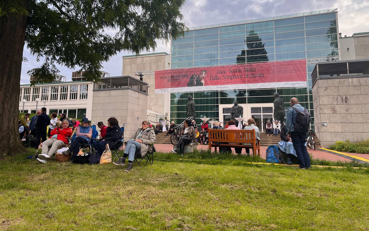 Zwischen Baumkronen und Gehwegen standen Samstagabend auch noch Lautsprecher im Stadtpark in Essen. Die übertönten am Abend das Vogelgezwitscher und spielen die Übertragung aus der Philharmonie. Anne-Sophie Mutter und das Dallas Symphony Orchesta spielten am Abend ab 20 Uhr ihr Stück. Wer nicht in der Philharmonie selbst die Musik genossen hat, konnte es am Abend bei einem kleinen Spaziergang durch den Stadtpark. Auf der Wiese vor der Philharmonie konnten es sich die Besucher auf Liegestühlen gemütlich machen. Einige brachten auch Ihre eigenen Decken und Camping Stühle mit und genießen den Abend mit Freuden oder Familie. Für die Stärkung zwischendurch konnte man an den Verkaufsständen Trinken und Essen kaufen.