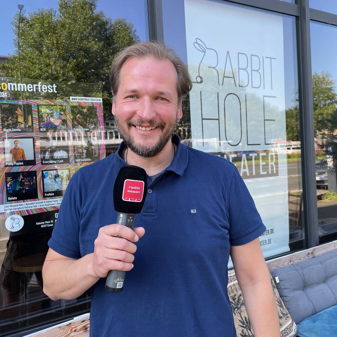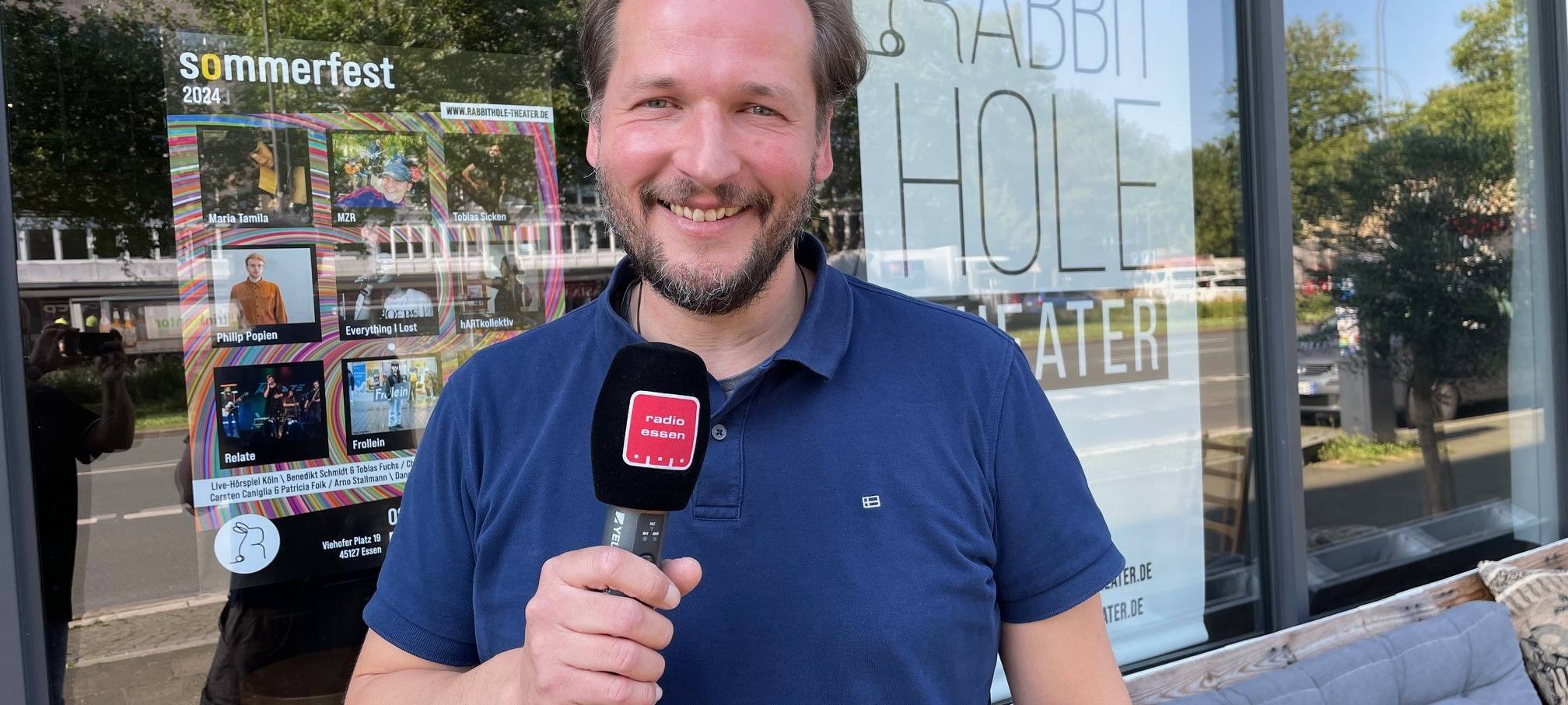 Radio Essen-Stadtreporter Timm Schröder trifft Dominik Hertrich. Er ist der Chef des Rabbit Hole Theaters am Viehofer Platz. Noch sitzen die Beiden allein auf zwei hölzernen Barhockern im Zuschauerraum des Mini-Theaters. Ab Freitag (2. August) wird sich das ändern. Dann werden sich 40 Besucher vor der kleinen Bühne drängeln, vielleicht auch mal 50, wenn alle den Bauch einziehen. Das allein ist schon schräg, aber es kommt noch dicker. Alle 25 Acts müssen zum Auf- und Abbau durch den Zuschauerraum. Für viele Besucher ist schon das sehenswert, erzählt Dominik Hertrick im Radio Essen-Interview.