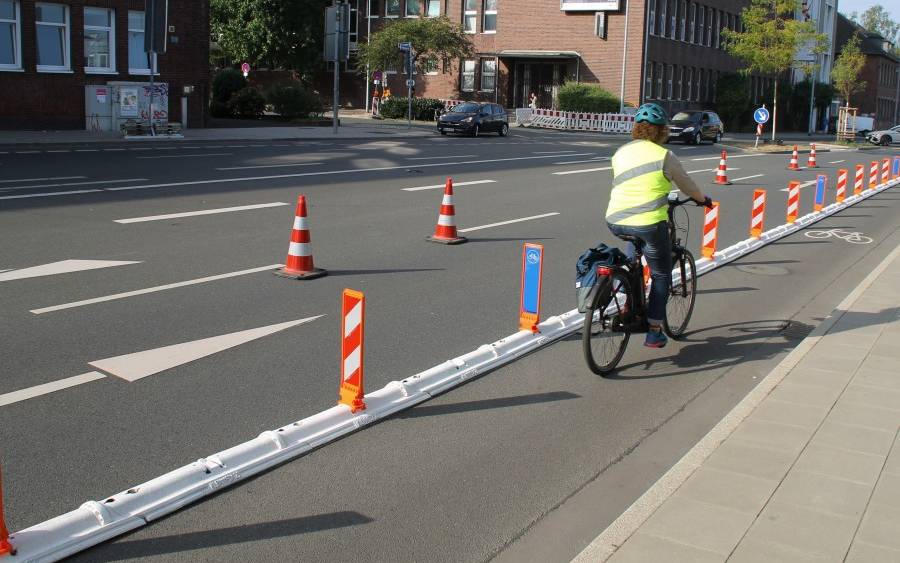 Die Stadt Essen testet im Westviertel, wie sie die Straßen für Radfahrer sicherer machen kann. Es wurden weiße Plastikschienen auf der Frohnhauser Straße montiert.