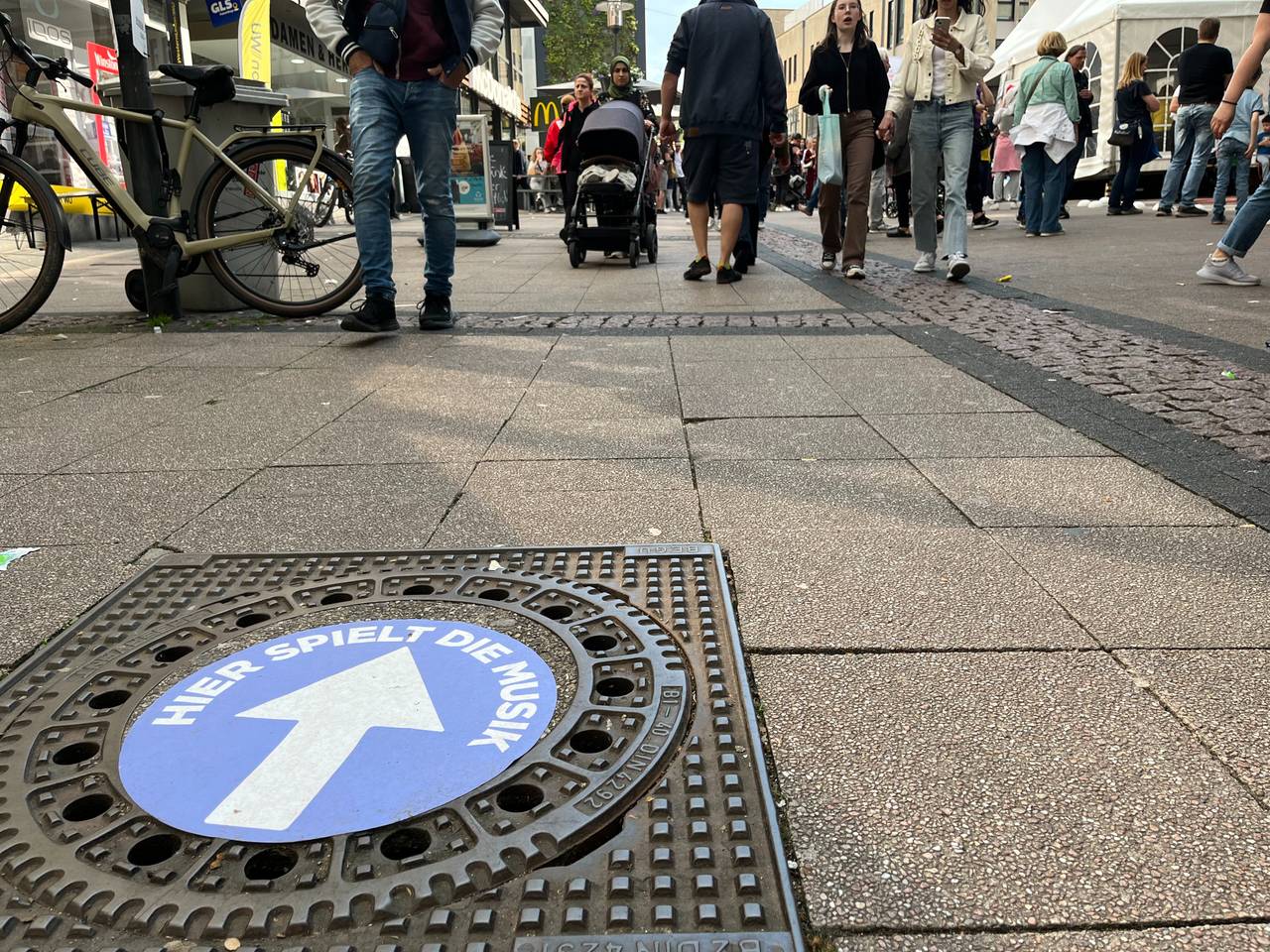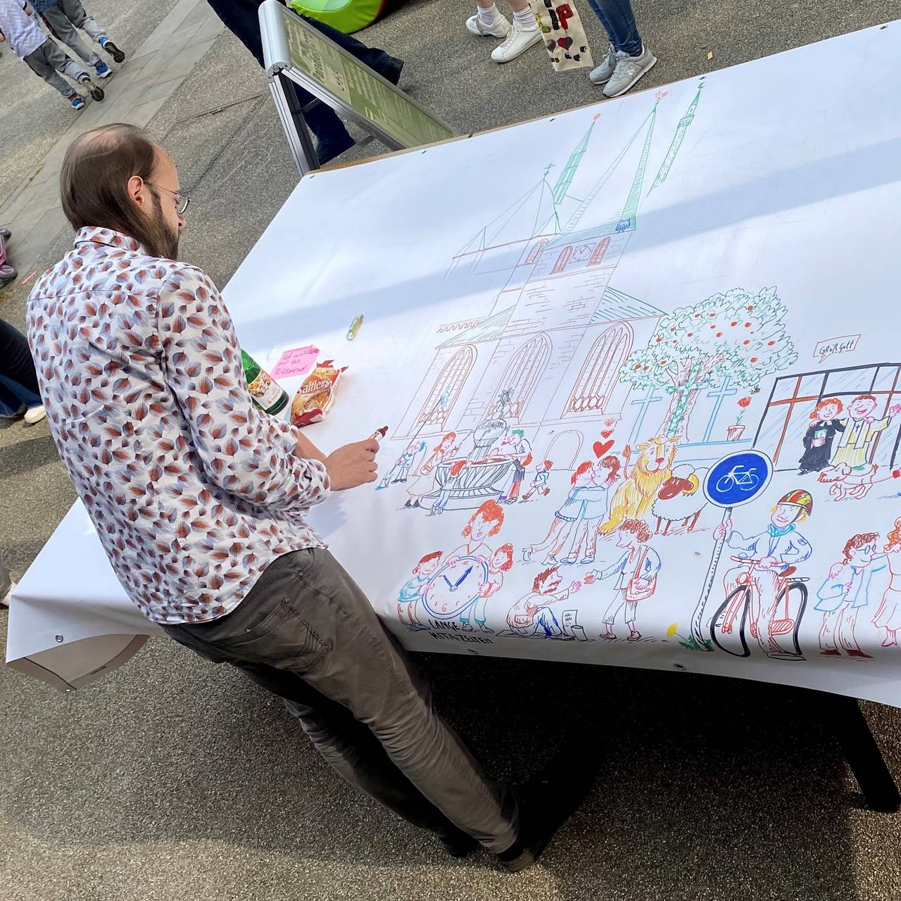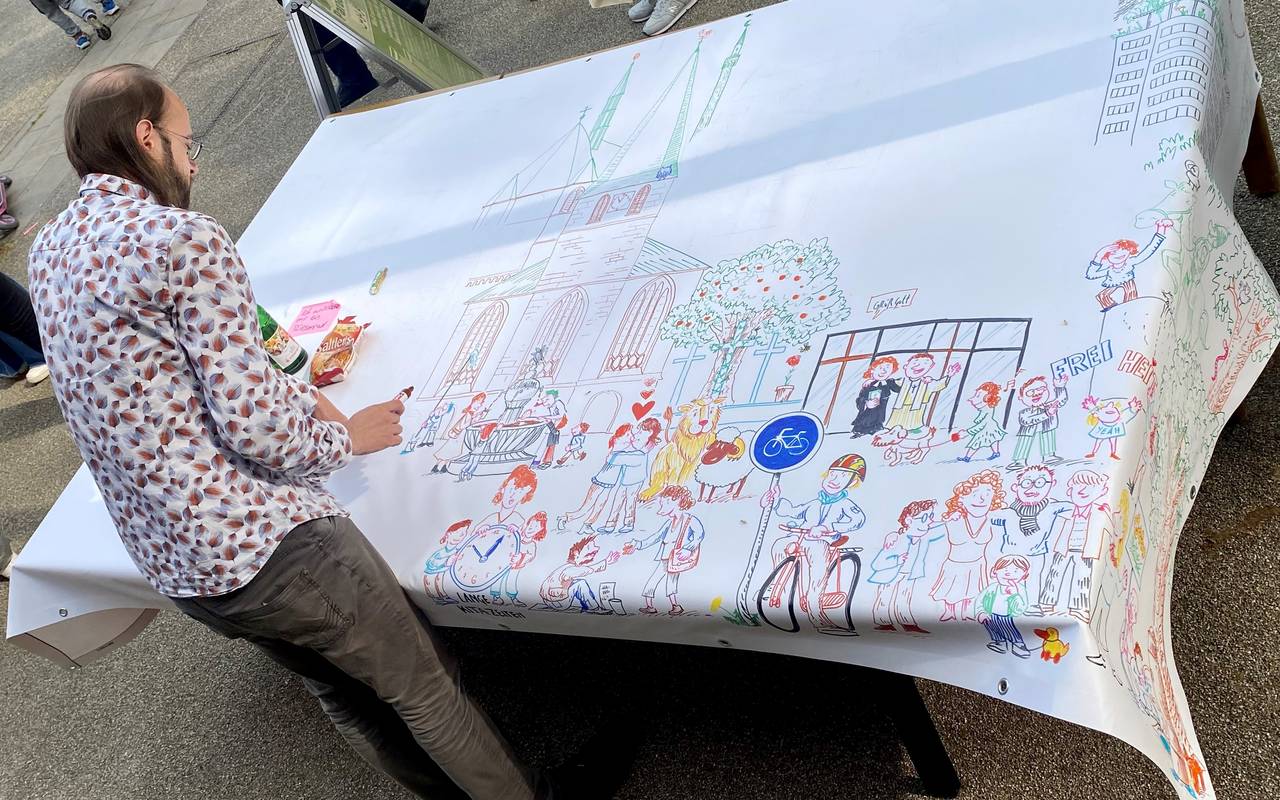 Im Domhof hat der Künstler Jesse Krauss das ganze Wochenende am Wimmelbild "Essen das Paradies" gemalt. Unter der Überschrift "Essen das Paradies" entsteht ein Bild, in dem Essen grüner und sozialer werden soll. Die Ideen der Besucher hat er mit eingebaut. Dazu gehört auch ein Schokoladenbrunnen mitten in der Innenstadt.