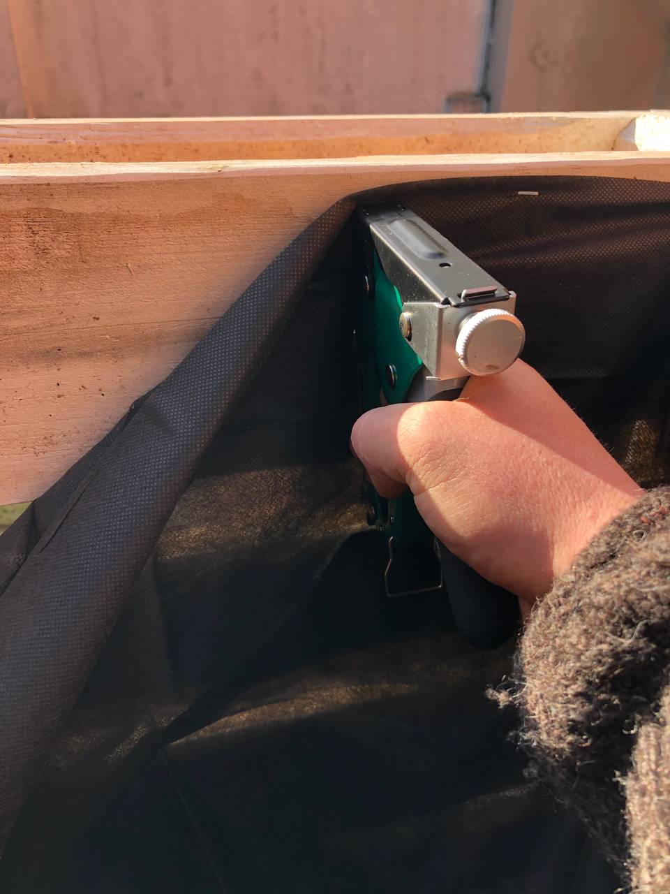 Für die beste Versorgung Eurer Pflanzen auch von unten ist eine clever gemischte Füllung Eures Hochbeets wichtig. Fangen wir aber ganz unten an: Zunächst tragt Ihr die oberste Schicht Rasen da ab, wo Ihr euer Hochbeet hinstellen wollt. Dann stellt Ihr genau da vier (oder mehr) Europaletten aufrecht so aneinander, dass die oberen, dichteren Seiten, also die mit mehr Holzbrettern, nach Innen schauen und soetwas wie ein Becken ergeben. An den Ecken verschraubt Ihr die mit langen Schrauben und einem Akkuschrauber. Damit nichts rausfällt, verkleidet Ihr das Beet von Innen mit Folie, einem Vließ oder einer Kokosmatte - dabei hilft ein Handtacker. Wer auf Nummer Sicher gehen will, dichtet das Hochbeet unten noch mit einem Gitterzaun ab, damit keine Wühlmäuse Eintritt erhalten.