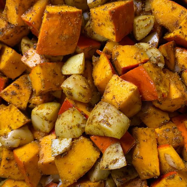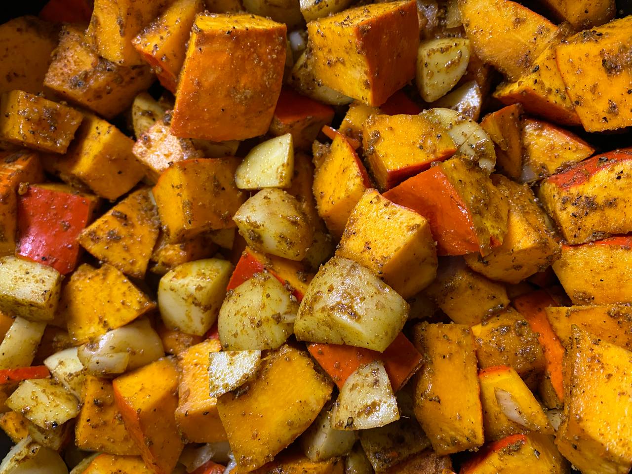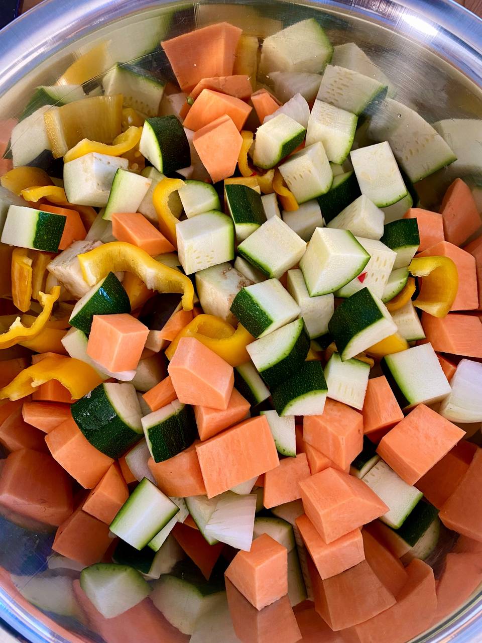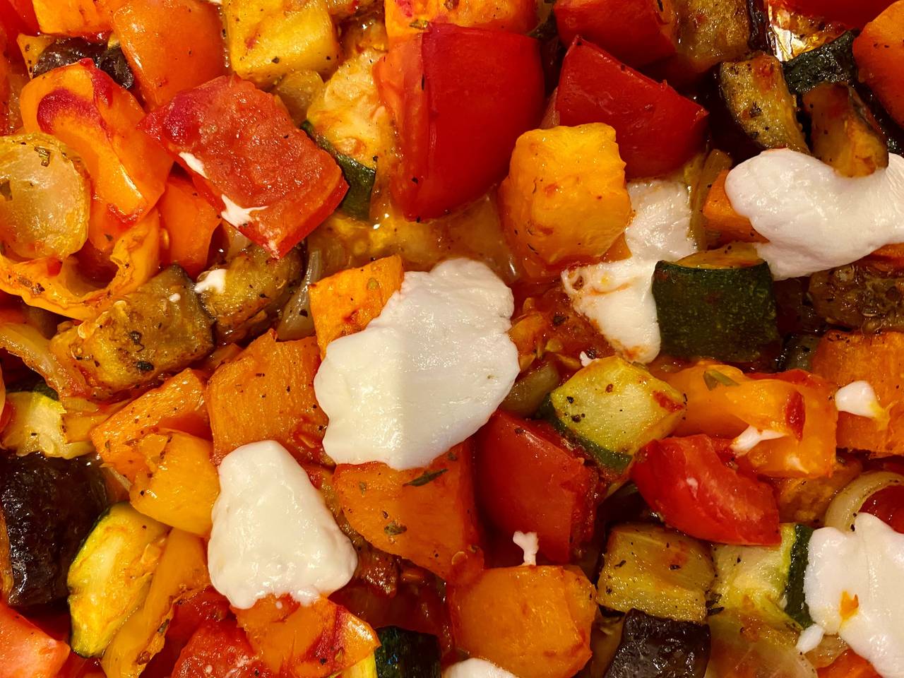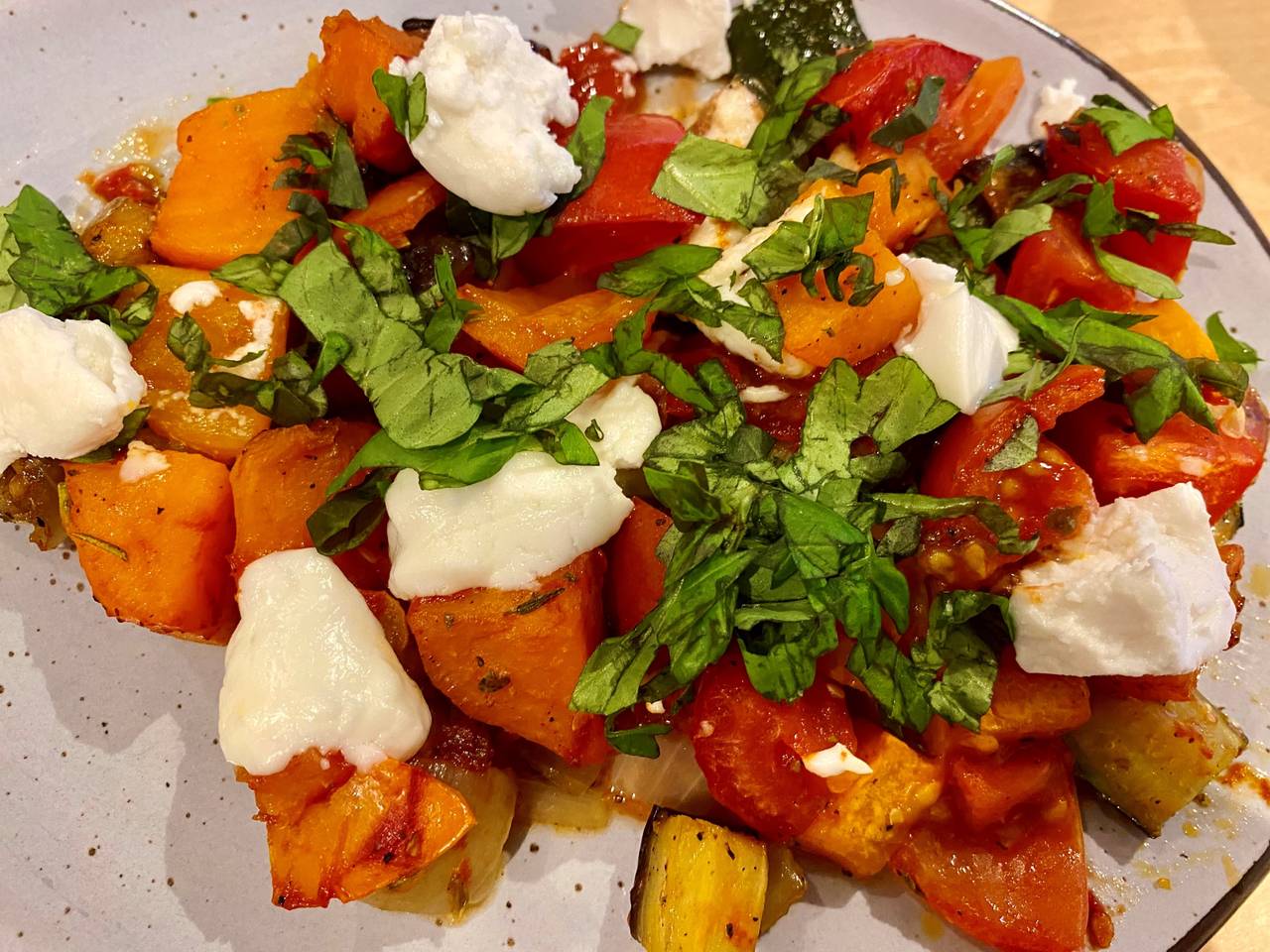 Dazu braucht ihr eine Zucchini, eine Aubergine, zwei Spitzpaprika oder eine große Paprika, eine mittelgroße Süßkartoffel, 2 Zwiebeln, Knoblauch nach Geschmack, ein Kürbis (davon nehme ich aber nur etwa die Hälfte je nach Größe), Thymian, Rosmarin, Oregano, eine frische Chilischote, Tomaten, Tomatenmark, Zitrone und Ziegenfrischkäse. Das Gemüse wird in gleichmäßige Würfel geschnitten und kommt bei 180 Grad für etwa 20 Minuten in den Ofen. Dann kommt der Trick à la Ratatouille mit den Tomaten, was das bedeutet hört ihr hier. Das Gericht ist ein komplettes Mittag- oder Abendessen. Wer mag kann aber noch etwas Brot dazu servieren oder etwas kurz gebratenes Fleisch nach Geschmack. Die Menge könnt ihr verdoppeln oder verdreifachen je nach der Anzahl der Esser. Nur nicht zu viel auf das Blech legen, die Stücke sollten nebeneinander liegen und gleichmäßig durchgaren.