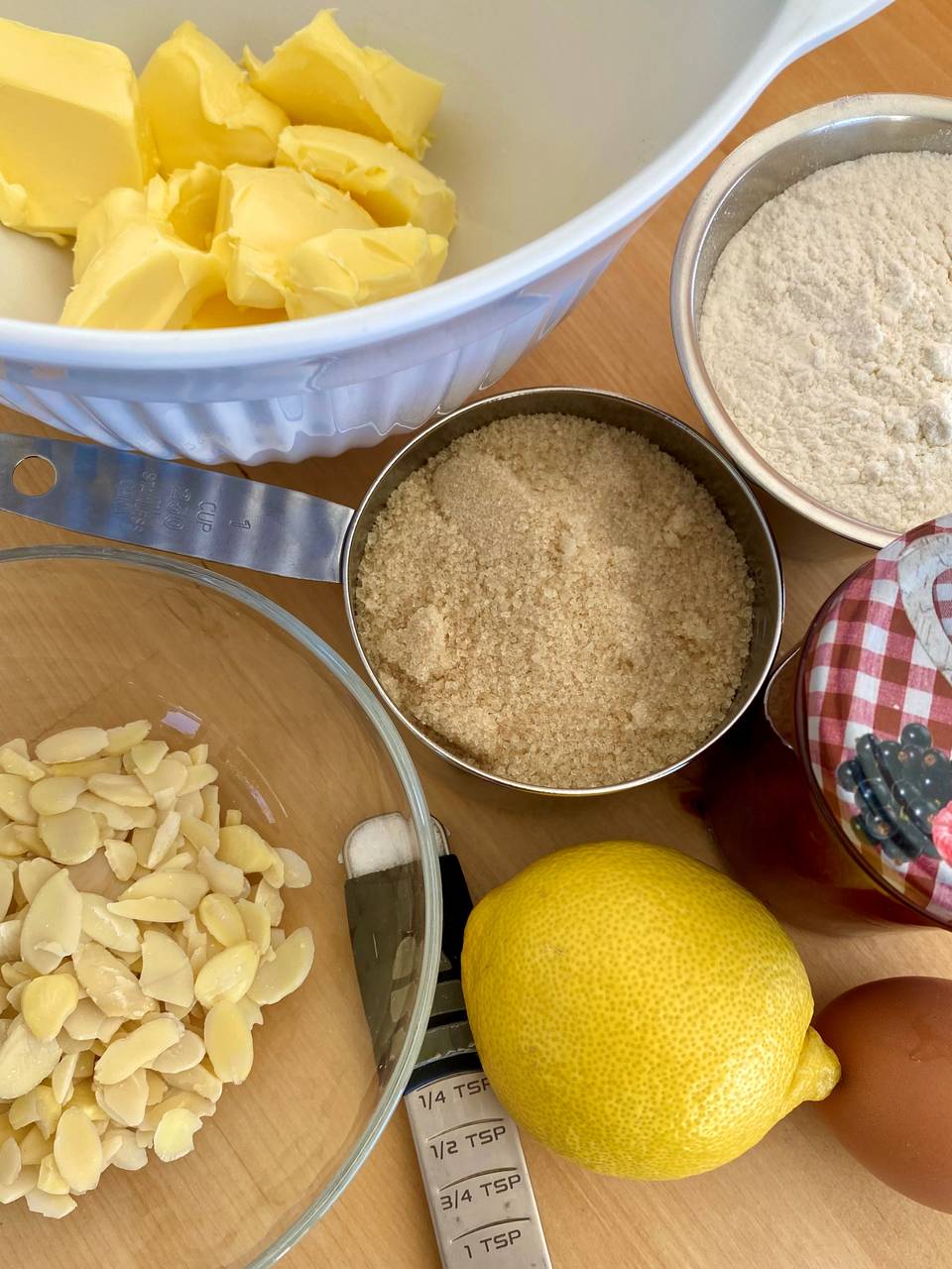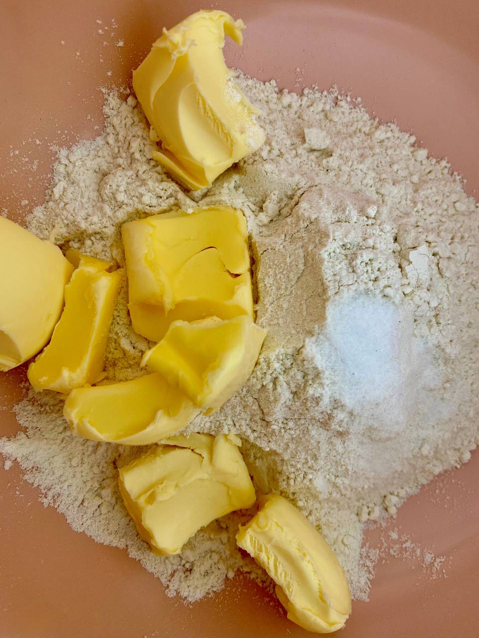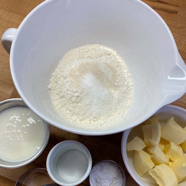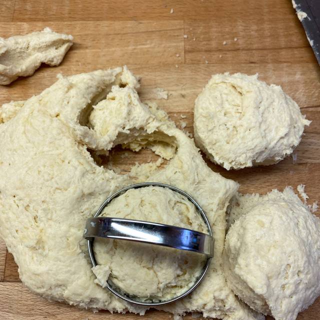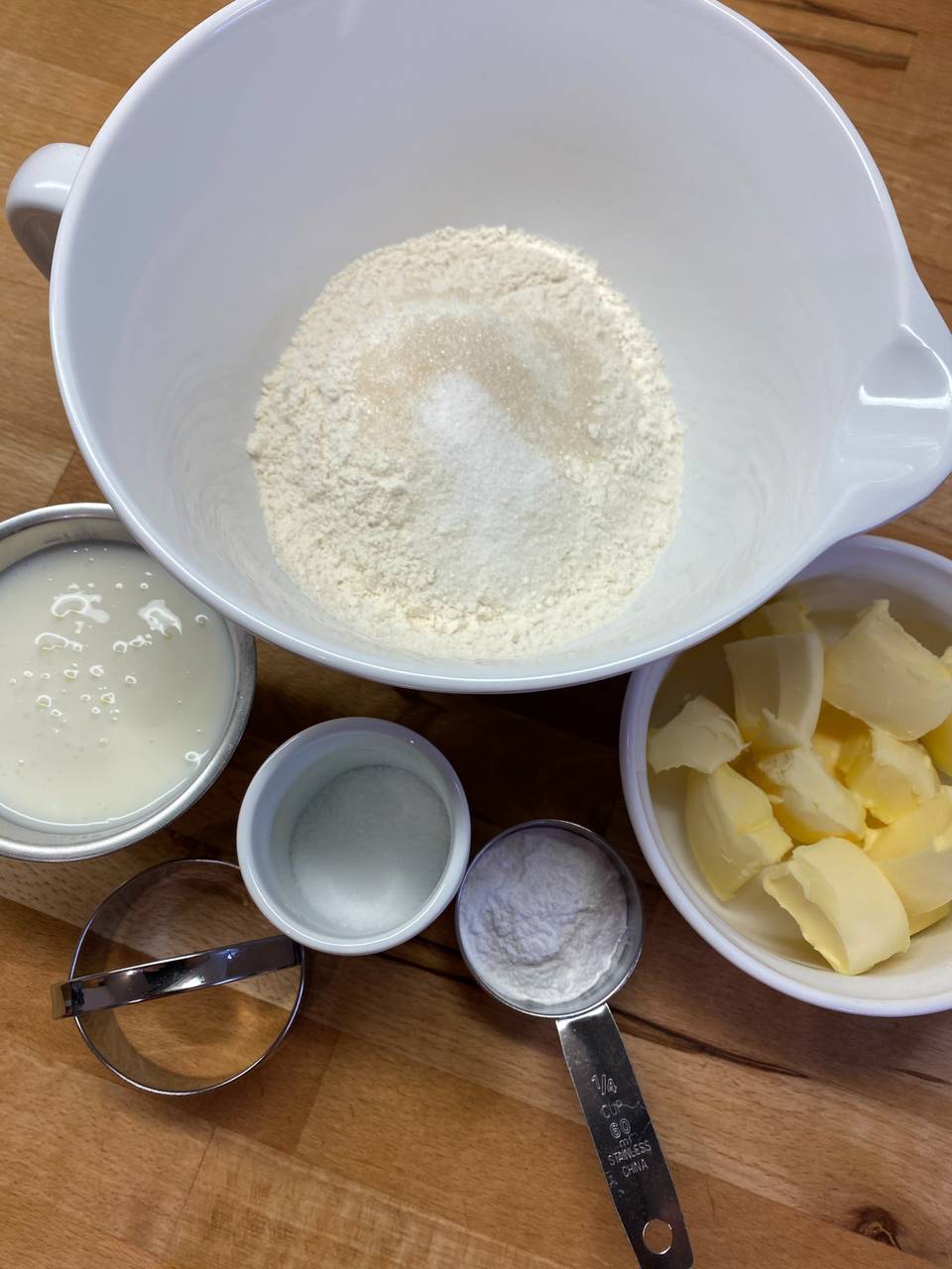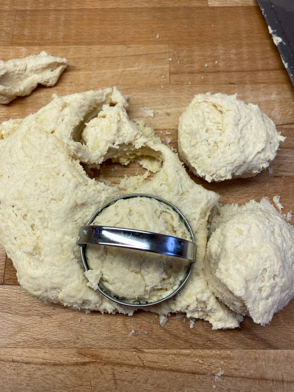 Ihr braucht dafür: 2 1/4 Cup oder 320 Gramm Mehl (möglichst 405 oder 550), 12 großzügige Teelöffel oder 175 Gramm Butter, 1 1/2 Teelöffel Backpulver, 1 Teelöffel Zucker, eine gute Prise Salz, 3/4 Cup oder 175 ml Buttermilch und ein etwa 6 cm großen Ring zum Ausstechen der Biscuits, ihr könnt auch einfach ein Glas nehmen.