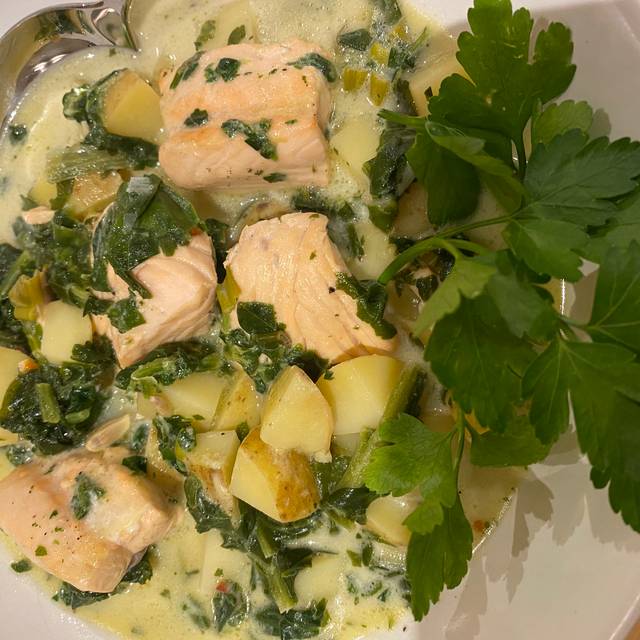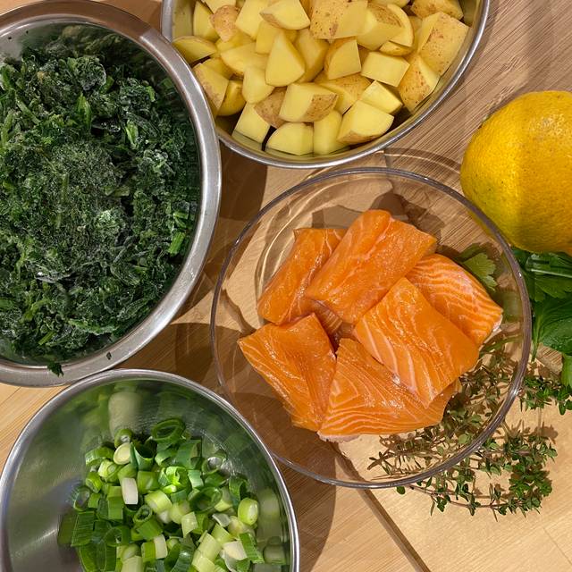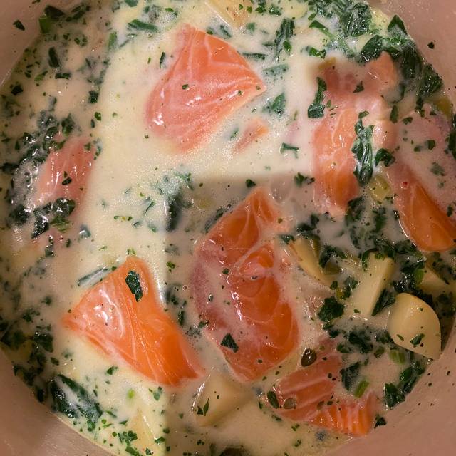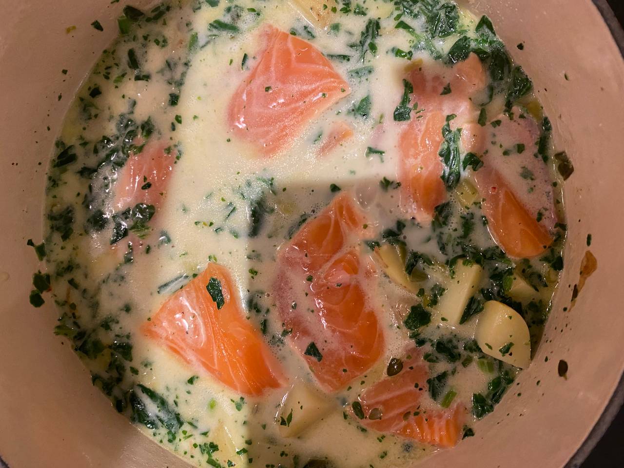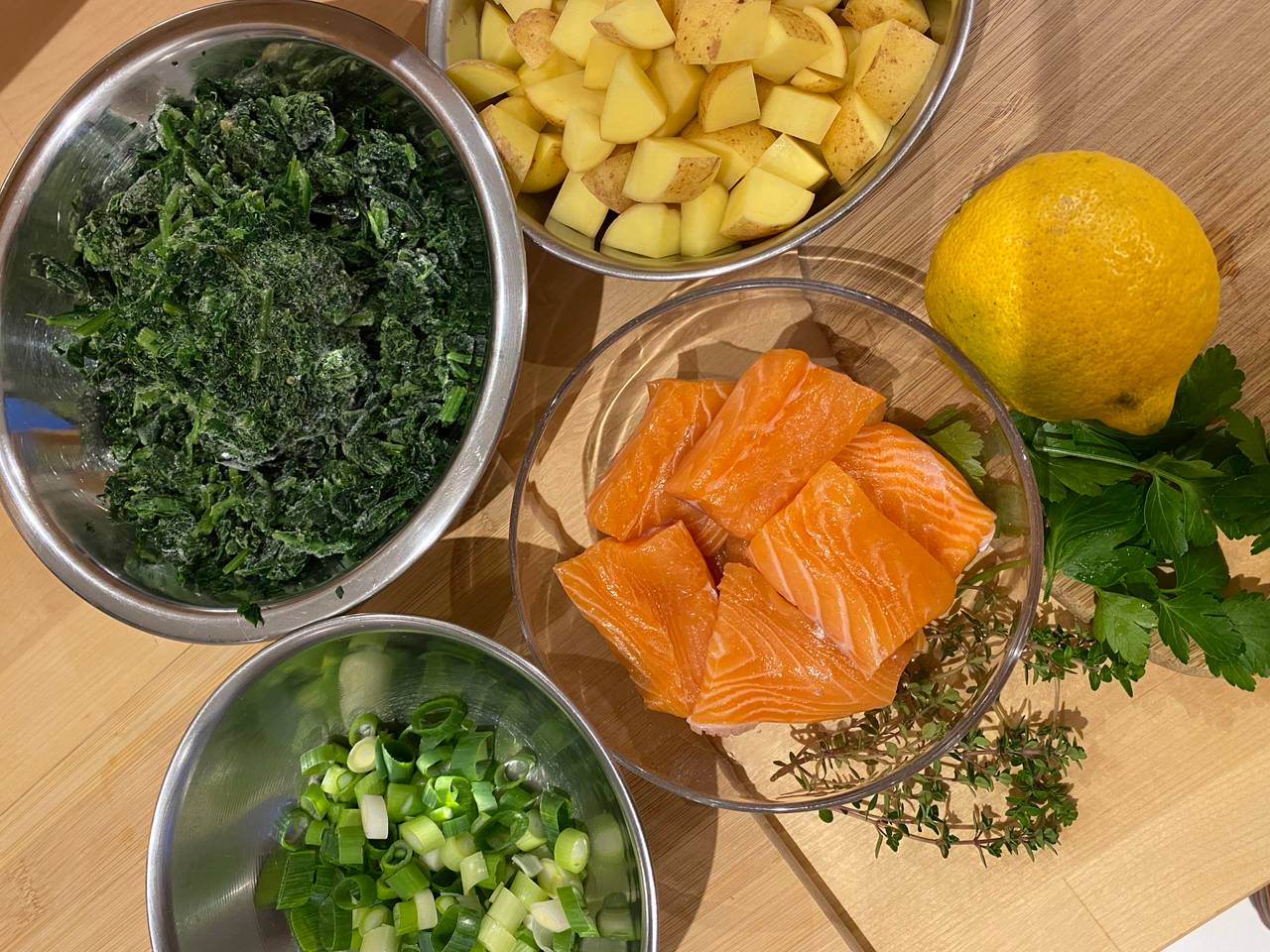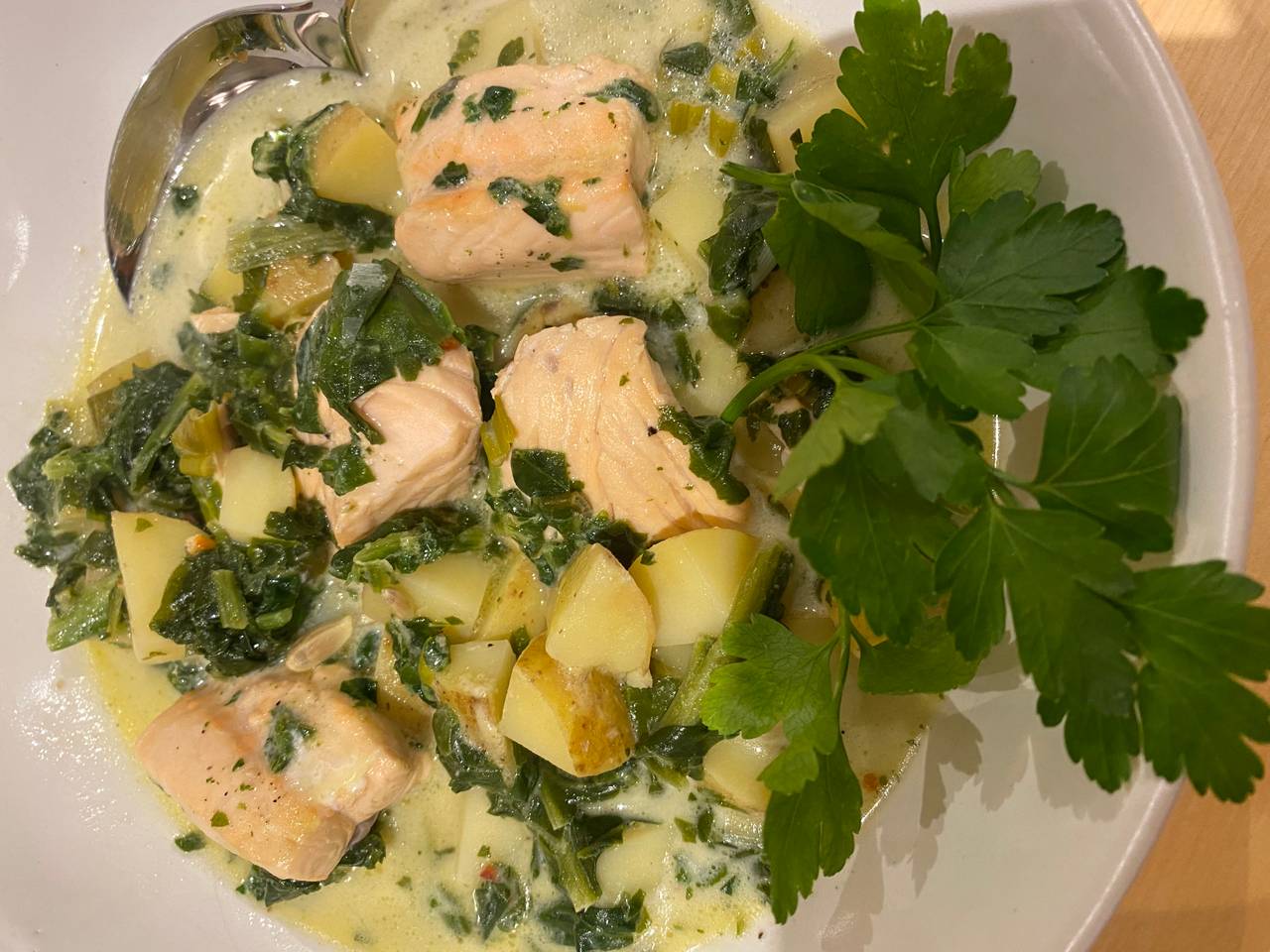 An Ostern gibt es Fisch! Hier mein Rezept für eine Fischsuppe mit Lachs, Spinat und Kartoffeln. Alles Zutaten, die gut zueinander passen, hier aber zu einer Suppe verarbeitet. Für 2 Personen nehme ich etwa 400 Gramm Lachsfilet ohne Haut, 10 kleine Frühkartoffeln, 300 Gramm gehackten Spinat, 1 Frühlingszwiebel oder eine kleine Stange Lauch, 2 Lorbeerblätter, mehrere Zweige Thymian, ein halbes Glas Weißwein, 1 Glas Fischfond, 1 Becher Sahne oder Kochsahne, eine Zitrone, etwas Chili, Salz, Pfeffer, etwas Olivenöl zum Anbraten und etwas Petersilie zum Dekorieren. So kommt das alles zusammen: