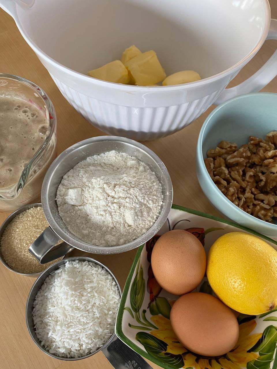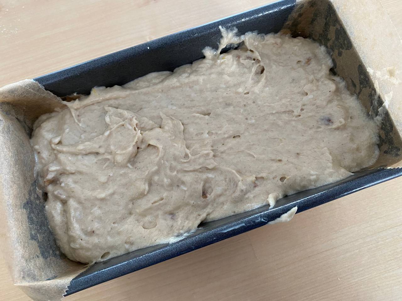 Das sind die Zutaten: 6 Esslöffel weiche Butter, 1/3 Cup brauner Zucker, 2 Eier, 1 1/2 Cup pürierte Bananen, 1 1/2 Cup Mehl (405), 1,5 Teelöffel Backpulver, eine Prise Salz, etwas Vanille, 1 Teelöffel geriebene Zitronenschale, 1 Cup Walnüsse (grob zerbrochen), 1/2 Cup Kokosraspel und eine kleine Kastenform. Die Form ausfetten, den Ofen auf 180 Grad vorheizen und so kommt alles zusammen zu einem herrlich duftenden Banana Nut Bread.