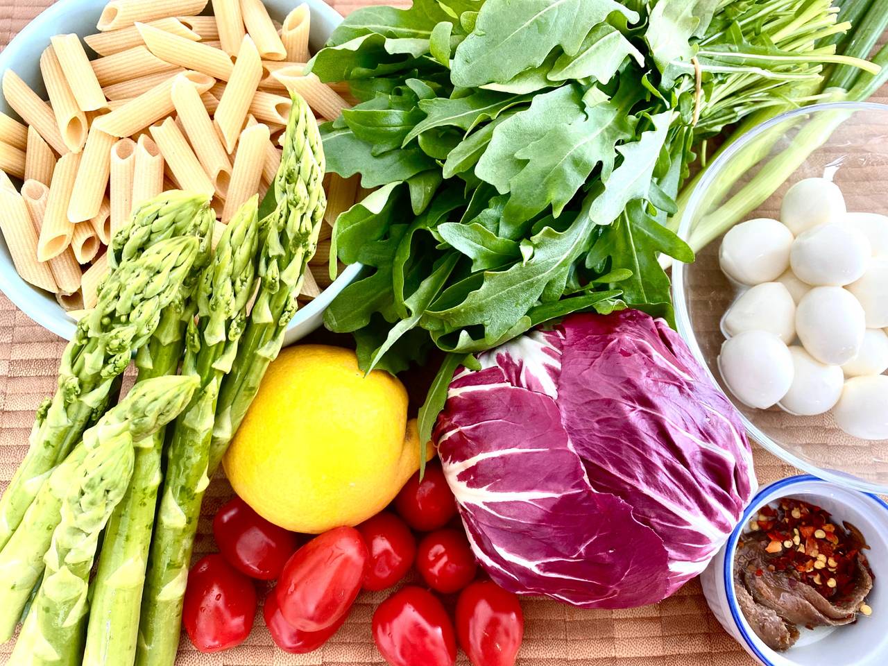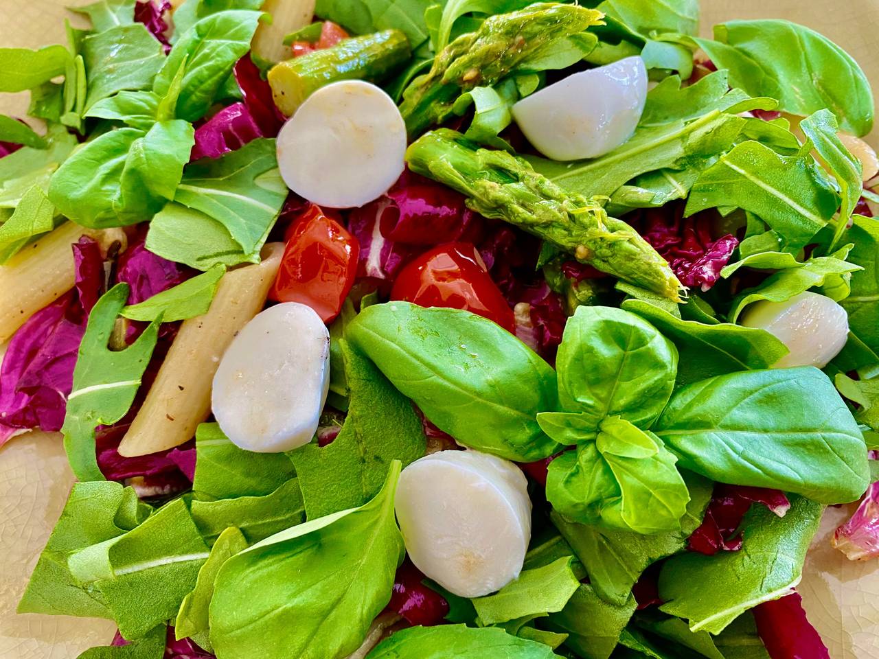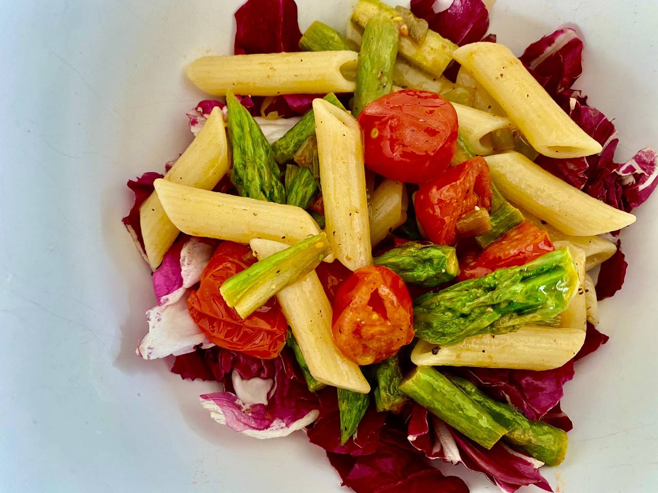 Ein schnelles Mittagessen mit ein bisschen Pasta und viel Salat. Das ist meine Salad Pasta. Ihr könnt das auch gern eurem Geschmack und den Vorlieben in der Familie anpassen. Am besten eignet sich als Basis aber ein Radicchio, der kann etwas Hitze ab und fällt nicht sofort komplett zusammen. Die anderen Zutaten wie der grüne Spargel oder die Tomaten passen einfach gerade prima in die Jahreszeit und geben dem ganzen Salat frische Farbe.