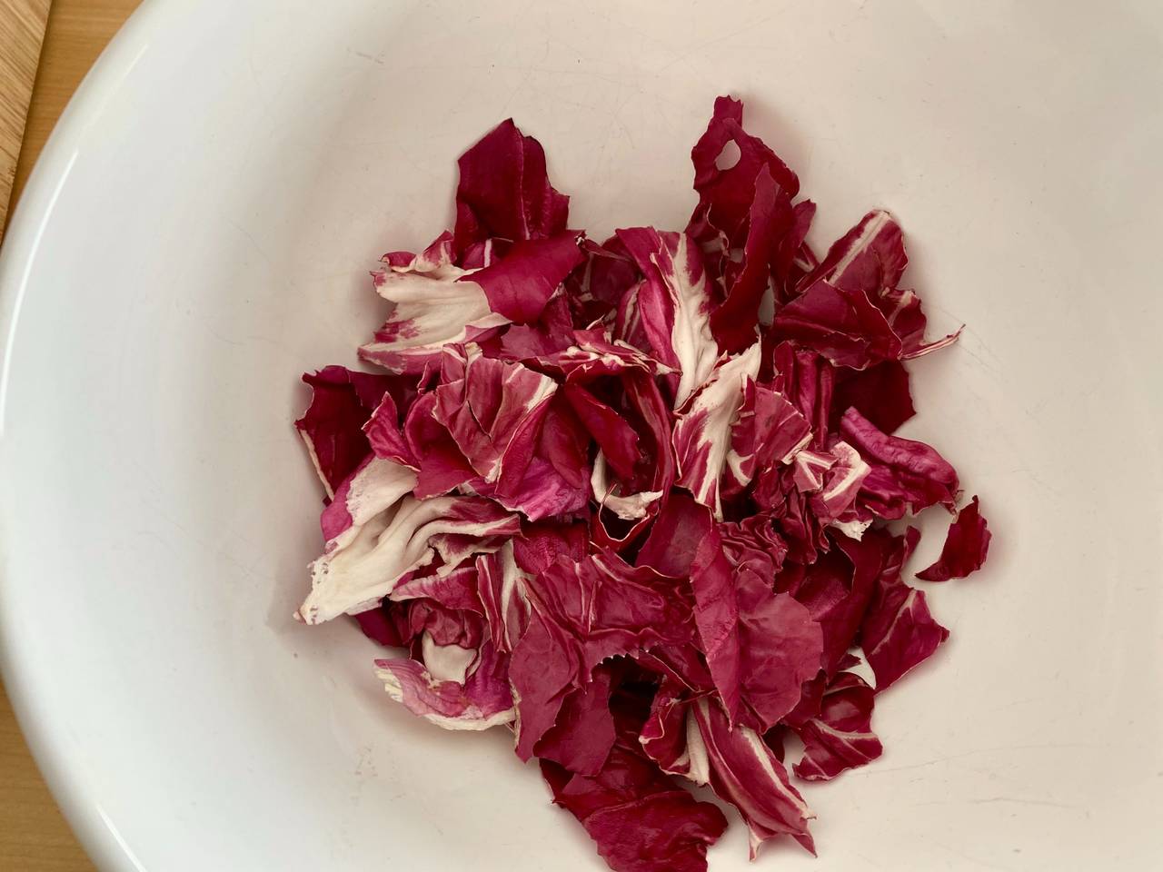 Ihr braucht eine kurze Pasta-Sorte, ich habe einfach Penne genommen, einen Kopf Radicchio, ein Bund Rucola, frisches Basilikum, ein paar kleine Mozzarella-Kugeln, Knoblauch nach Geschmack, ein paar Frühlingszwiebeln, eine Zitrone, mehrere Anchovis-Filets, etwas Butter, Olivenöl und Chiliflocken. So wird aus diesen Zutaten in einer knappen halben Stunde ein Mittagessen oder passt auch auf den Tisch am Abend.