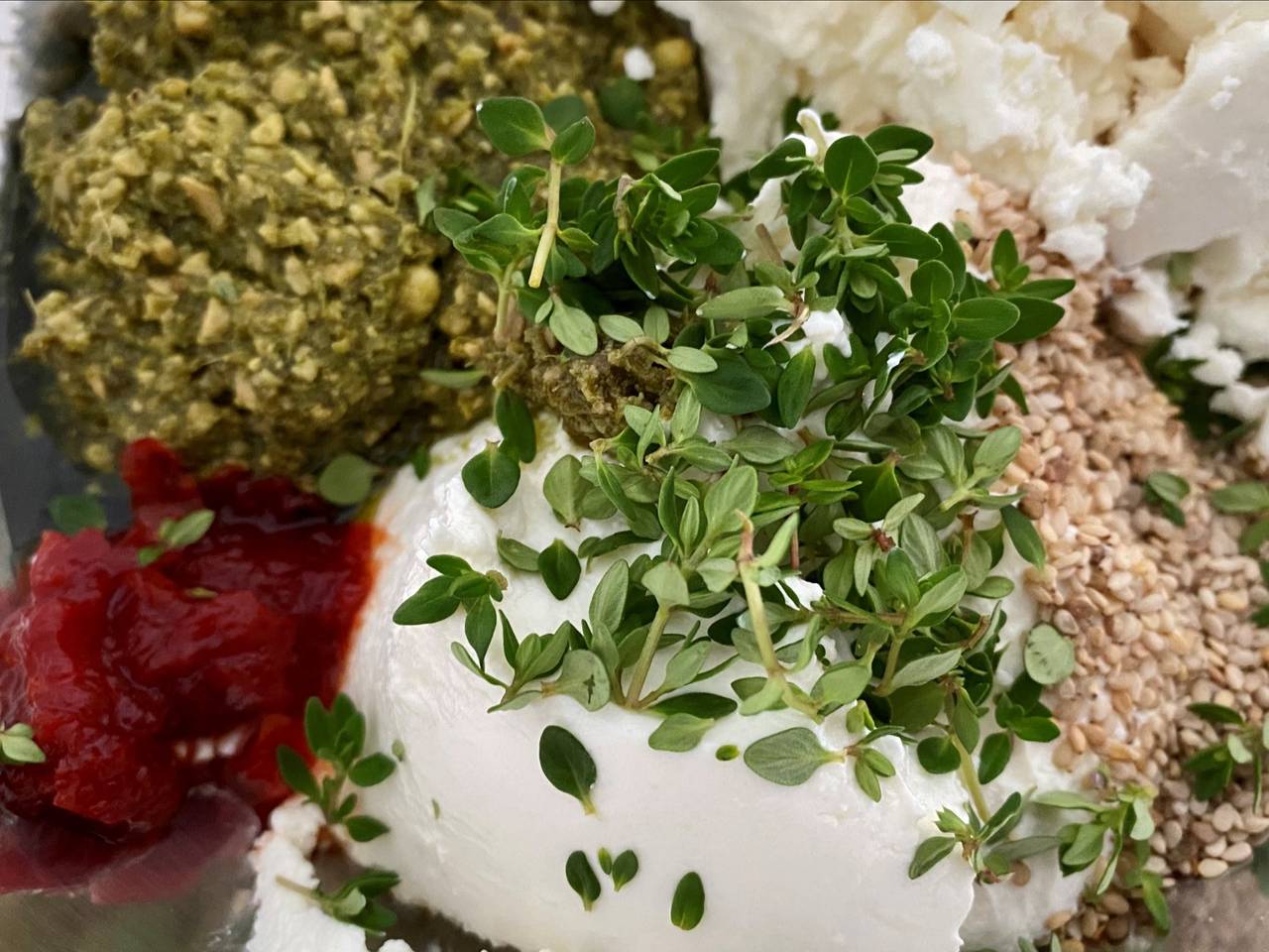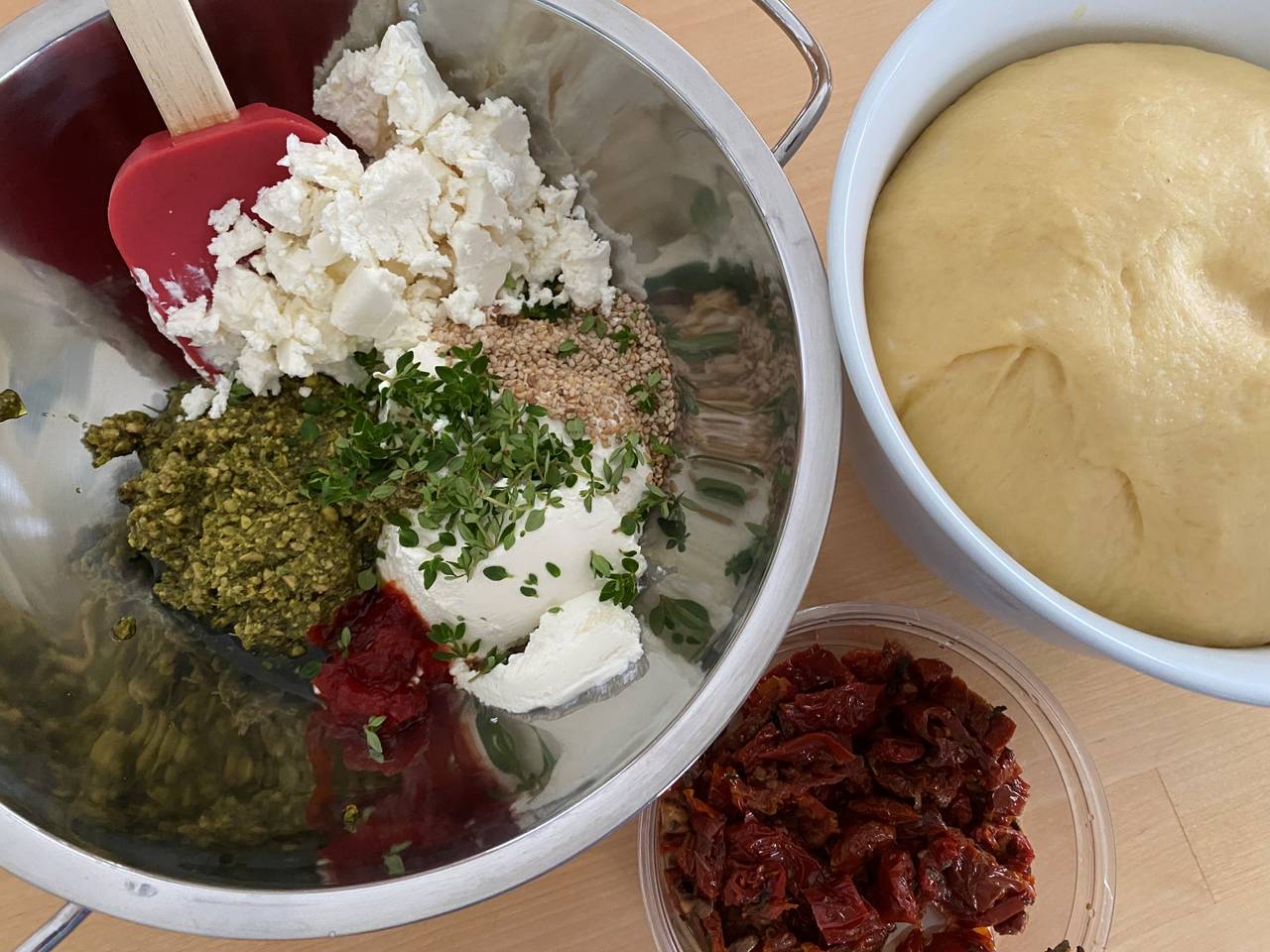 Bei der Füllung könnt ihr etwas variieren und auch ein paar Zutaten aussuchen, die ihr am liebsten mögt. Die Basis besteht aus 250 Gramm Ricotta, 3 Esslöffel Pesto, mind. ein Teelöffel Chili (Harissa oder Peperoni Confit), Salz, Pfeffer, mehrere Zweige frischer Thymian, mindestens 10 getrocknete Tomaten (eingelegt in Öl) und 100 Gramm Feta-Käse. Dazu passt zum Beispiel noch etwas Ziegenfrischkäse oder schwarze Oliven. Das alles wird miteinander vermischt.