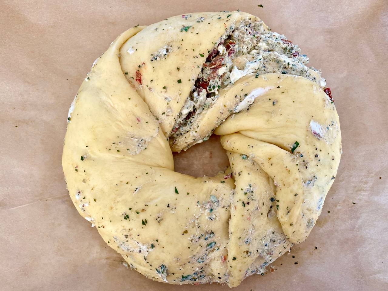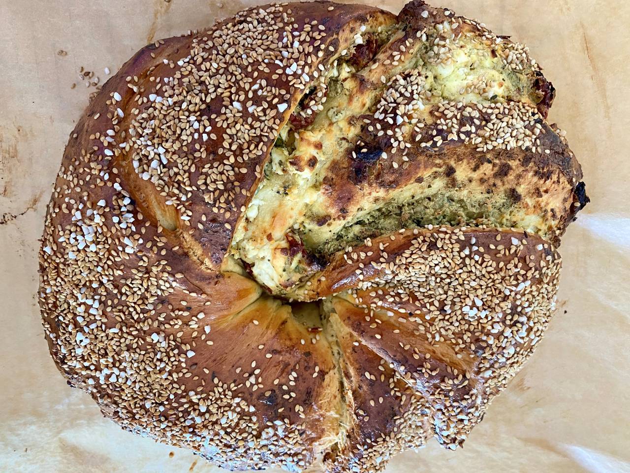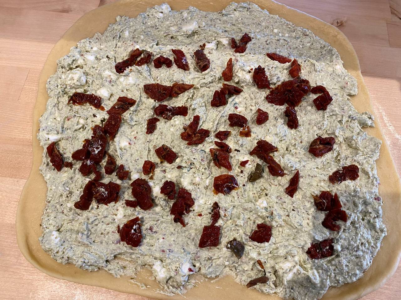 So wird aus all dem ein schönes herzhaftes Brot. Den Teig zu einem Rechteck ausrollen. Die Füllung darauf gleichmäßig verteilen, dabei an einem langen Ende eine etwa 3 cm breiten Rand lassen. Die gehackten getrockneten Tomaten, den Feta-Käse, die Oliven darauf verteilen. Den Teig vom langen Rand zu einer Rolle zusammen rollen, das leere Stück über die Rolle ziehen und diese damit verschließen. Die Rolle umdrehen und mit der Naht nach unten auf ein Stück Backpapier legen. Jetzt die Rolle längs einschneiden und in sich verdrehen und dabei zu einem runden Kranz formen. Wenn etwas Füllung rauskommt, einfach wieder reindrücken. Es kann sein, dass ein Teil der Füllung jetzt auch außen liegt, aber das ist so gewollt. Die Rolle mit Ei bestreichen und mit Sesamkörnern und groben Salz bestreuen. Danach noch mal 1 Stunde gehen lassen und bei 180 bis 200 Grad rund 40 Minuten backen. Etwas auskühlen lassen und genießen.