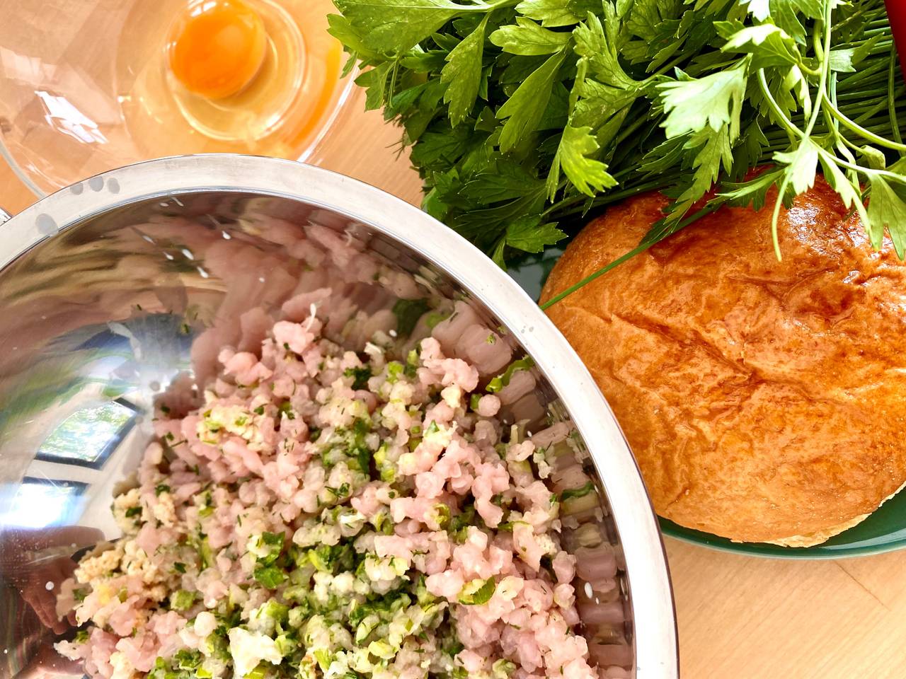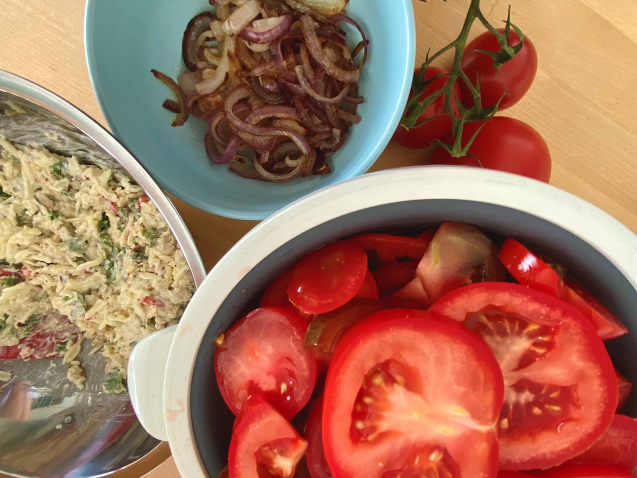 Für die Füllung: 1 rote Zwiebel in etwas Olivenöl andünsten bis sie goldbraun ist. 6 - 8 unterschiedliche Tomaten wie Ochsenherz-Tomaten, kleine süße Tomaten und Roma-Tomaten, in Scheiben schneiden und in einem Sieb für mindestens eine halbe Stunde abtropfen lassen, vorher gut salzen. 2 Esslöffel Mayonnaise mit Salz, Pfeffer, Chiliflocken, gehackten Kräutern wie Oregano, Basilikum, Thymian und Minze vermischen, dazu 3/4 Cup geriebener Mozzarella und 3/4 Cup geriebener Parmesan.
