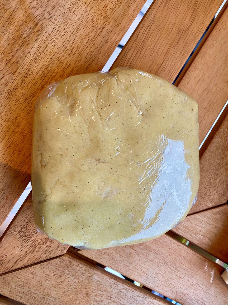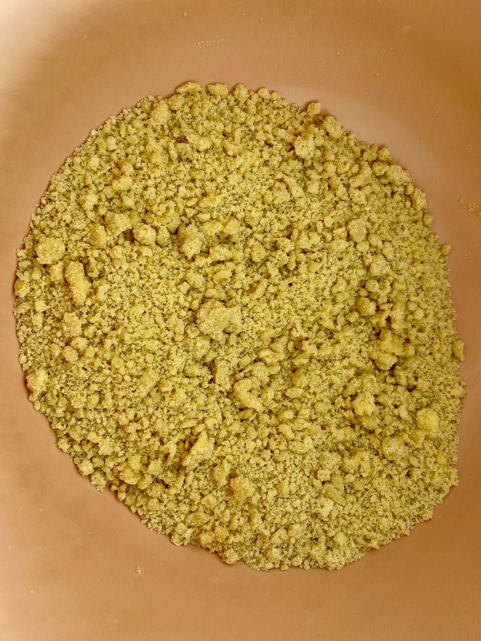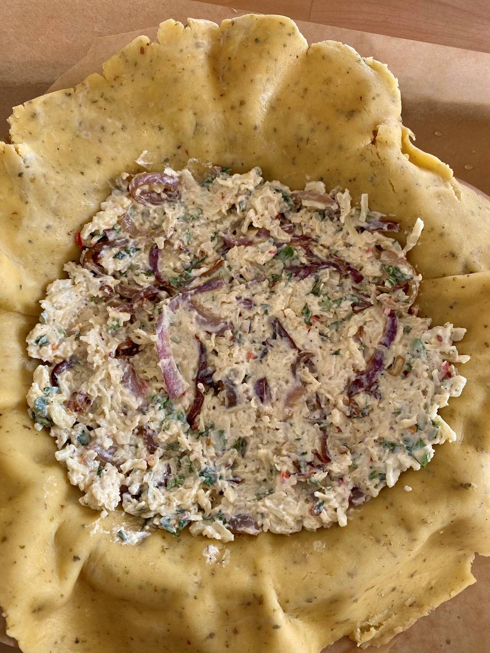 Für den Teig: 2 Cups Mehl (z. Bsp. 550), 2 Teelöffel getrockneter Oregano, 1/2 Teelöffel Salz, 10 Esslöffel Butter, 3 Esslöffel Sauerrahm, 1 Esslöffel Fruchtessig, das alles schnell zu einem Mürbeteig verarbeiten und für mindestens eine Stunde im Kühlschrank kalt stellen.