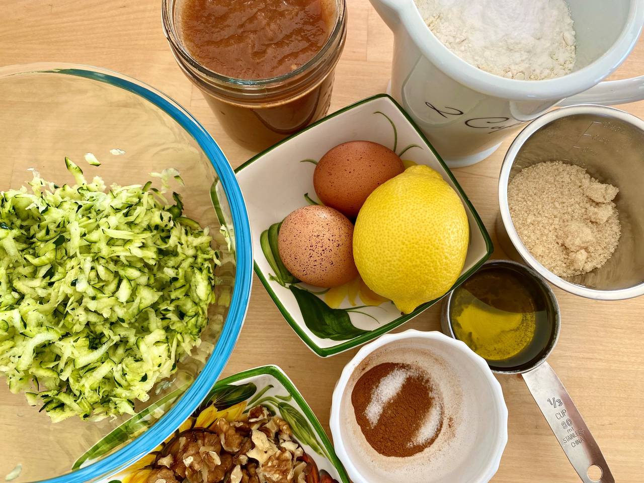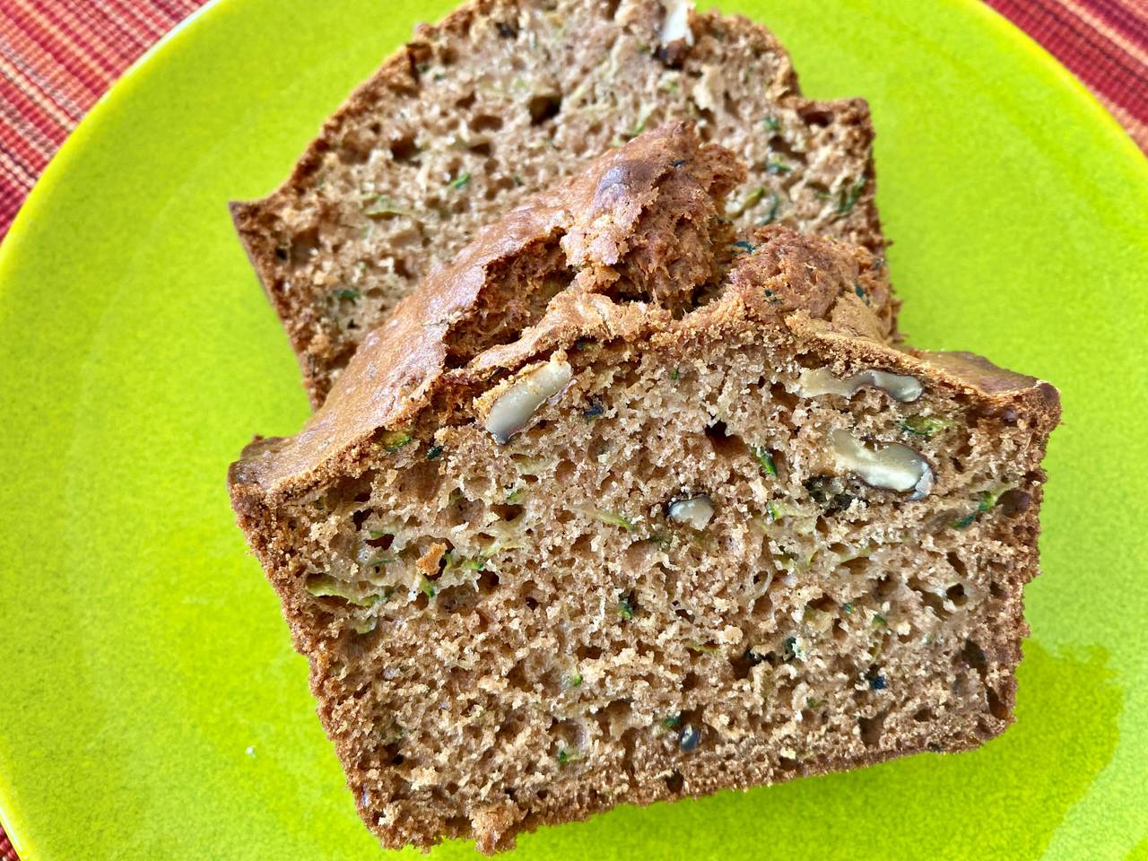 Für das Zucchini Brot braucht ihr: 1 1/2 Cup Mehl (auch Vollkorn geht gut), 1 Teelöffel Zimt, 1 1/2 Teelöffel Backpulver, 1/2 Teelöffel Natron, 1/2 Teelöffel Salz, 1 Teelöffel abgeriebene Zitronenschale, 1/3 Cup Walnüsse, 2 Eier, 1/2 Cup Zucker, 1/3 Cup Pflanzenöl, 1 Teelöffel Vanille-Extrakt, 3 Esslöffel konzentriertes Apfelmus (Apfelbutter). Das fertige Brot kommt für 45 bis 50 Minuten bei 180 Grad in den Ofen.