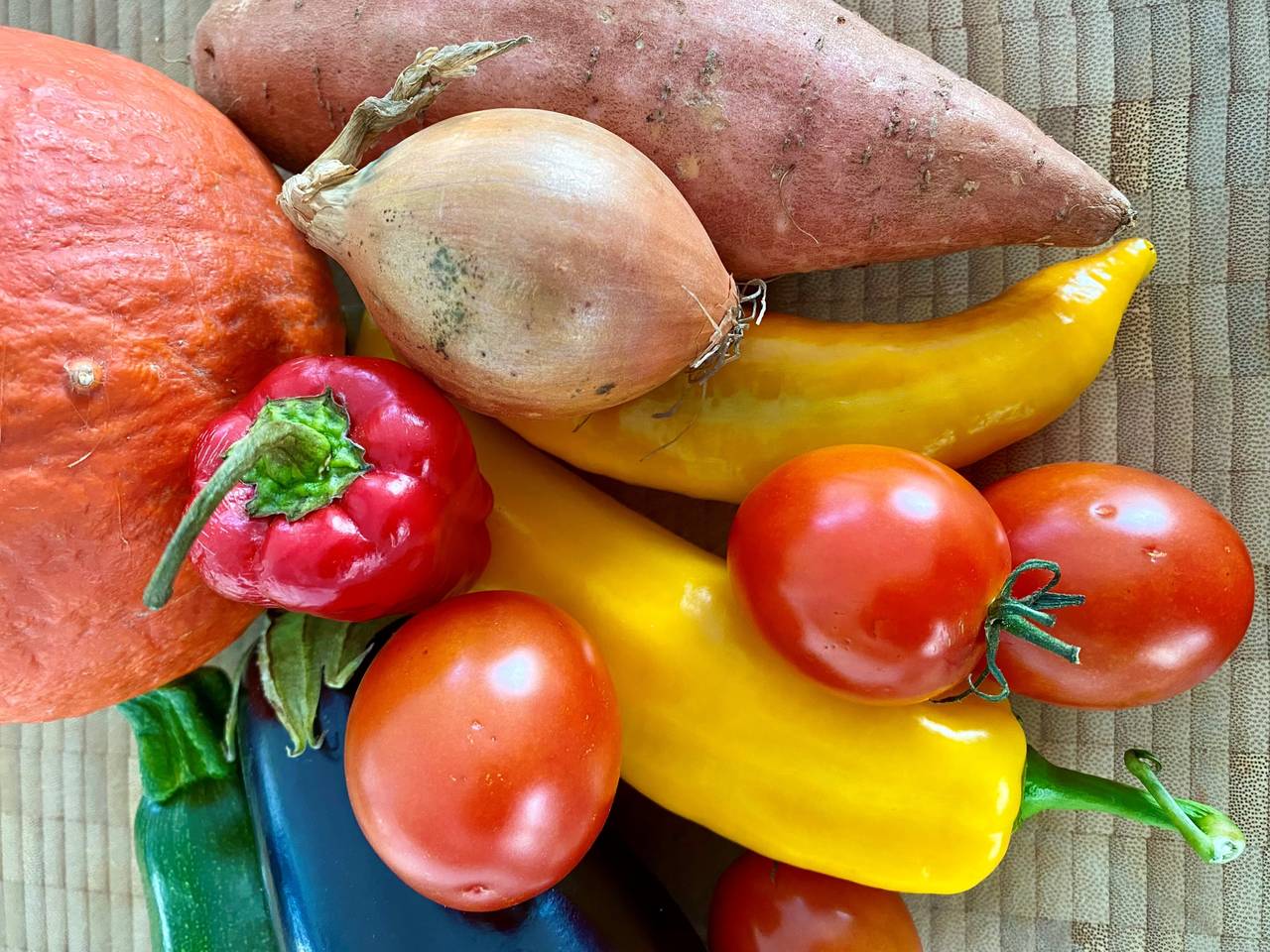 Im Herbst gibt es überall noch ganz viele Gemüsesorten, die frisch aus dem Garten oder vom Feld kommen. Da können wir noch mal aus dem Vollen schöpfen. Deshalb habe ich bei meinem Samstagseinkauf im Hofladen in Schuir alles eingepackt, was gut aussah und daraus wird jetzt ein rustikales Herbstgemüse aus dem Ofen à la Ratatouille.