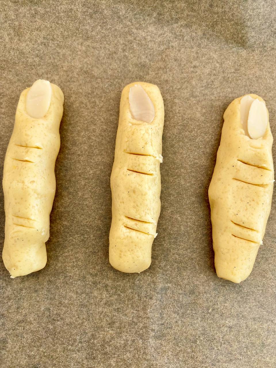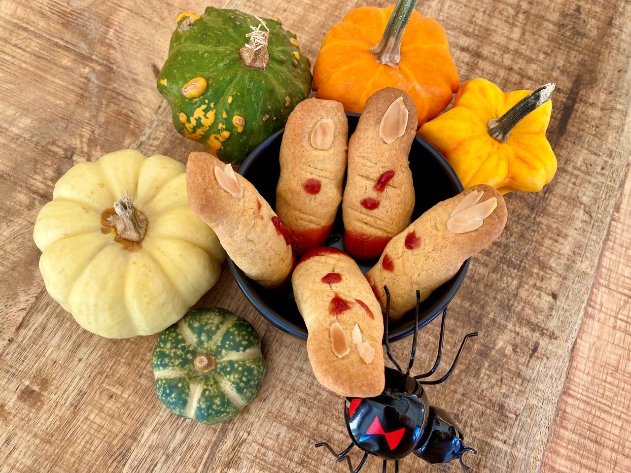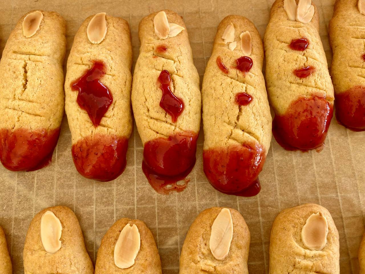 Für die blutigen Hexenfinger braucht ihr 240 Gramm Mehl (550), einen halben Teelöffel Backpulver, einen viertel Teelöffel Salz, 115 Gramm Butter, 100 Gramm Zucker, 1 Ei, den Abrieb der Schale von einer halben Zitrone, einen Teelöffel Vanille-Paste, rund 30 Mandelblättchen und ein halbes Glas Erdbeermarmelade. Alles zu einem Teig verarbeiten und so werden daraus dann blutige Hexenfinger. Die kommen bei 180 Grad für 16 bis 18 Minuten in den Ofen.