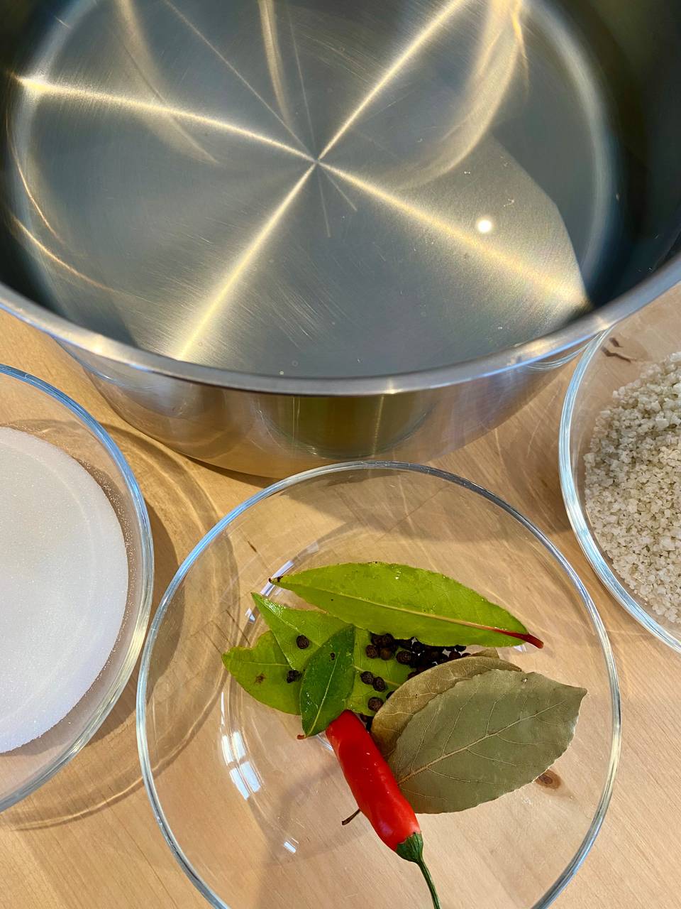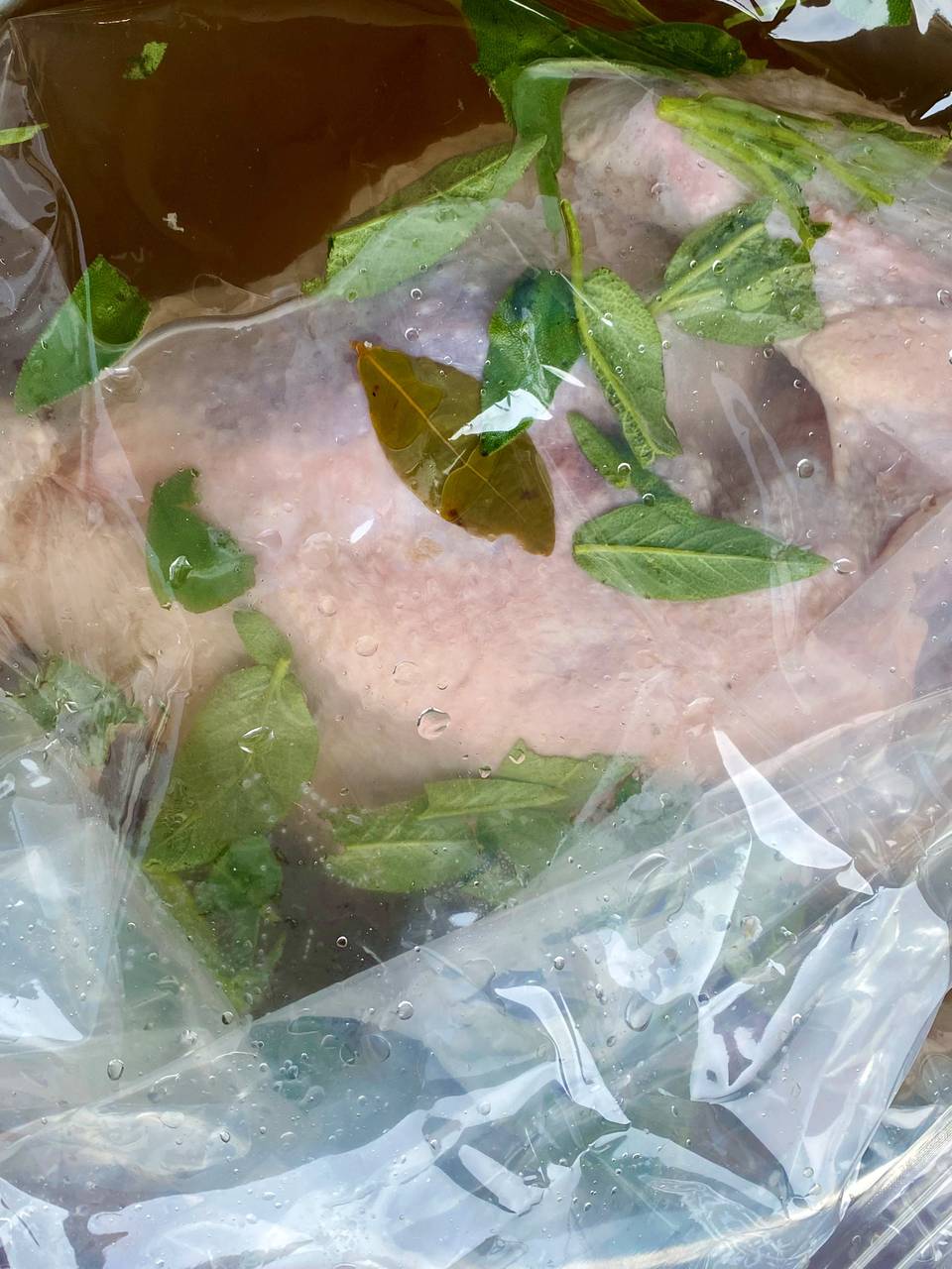 Zuerst lege ich die Pute für 24 Stunden ein. Dafür braucht ihr zuerst die Flüssigkeit, das sind 4,5 Liter Wasser mit einem 3/4 Cup Salz, einem 3/4 Cup Zucker, dazu 8 Lorbeerblätter, eine halbe Chilischote, 10 Pfefferkörner und ein Bund Salbei. Das reicht für eine 4 Kilo Pute, die ich am liebsten frisch kaufe. So geht es los mit dem Putenbraten.