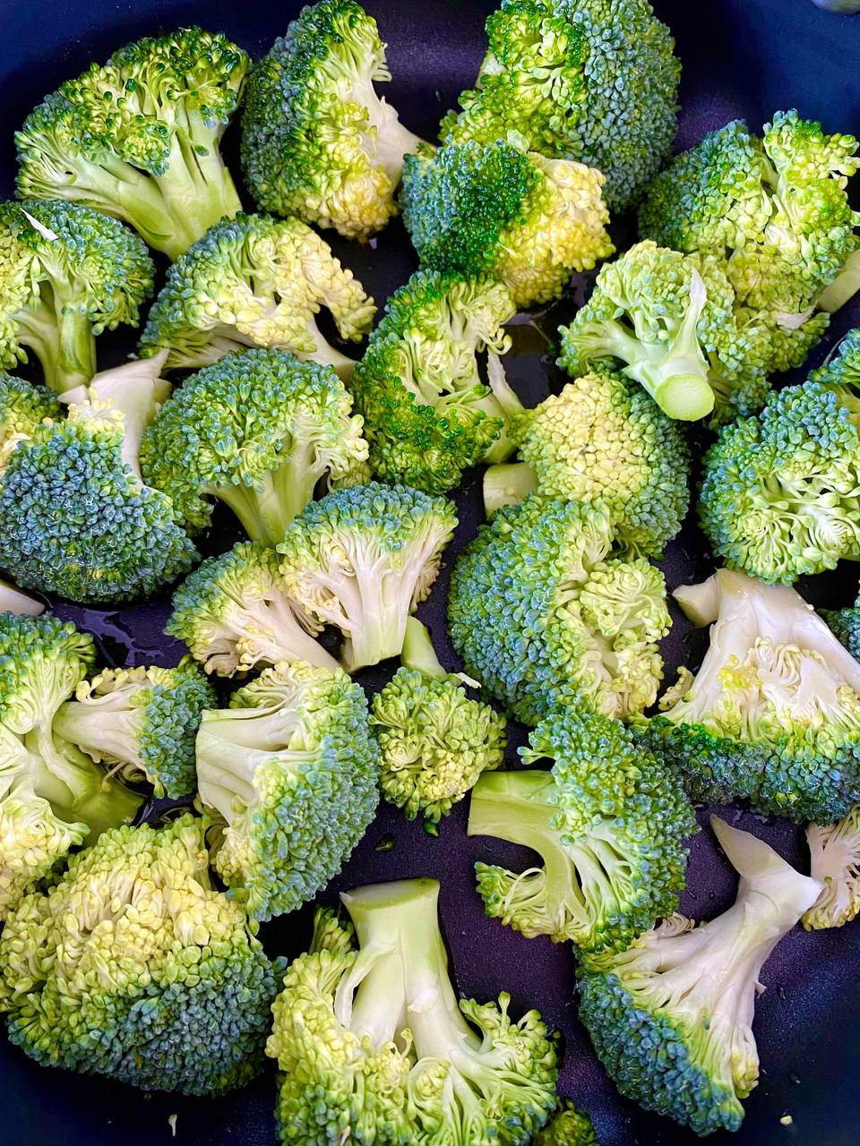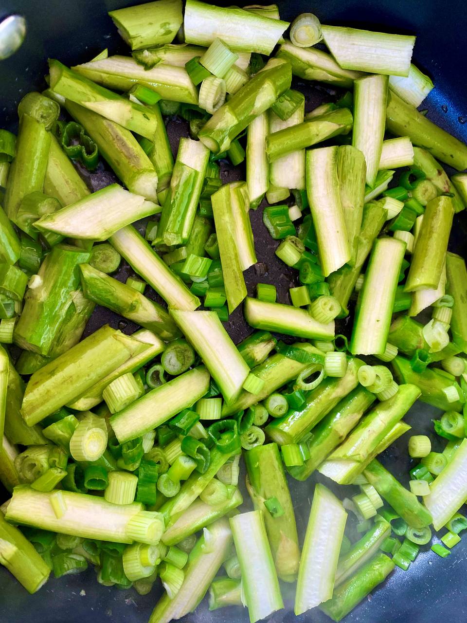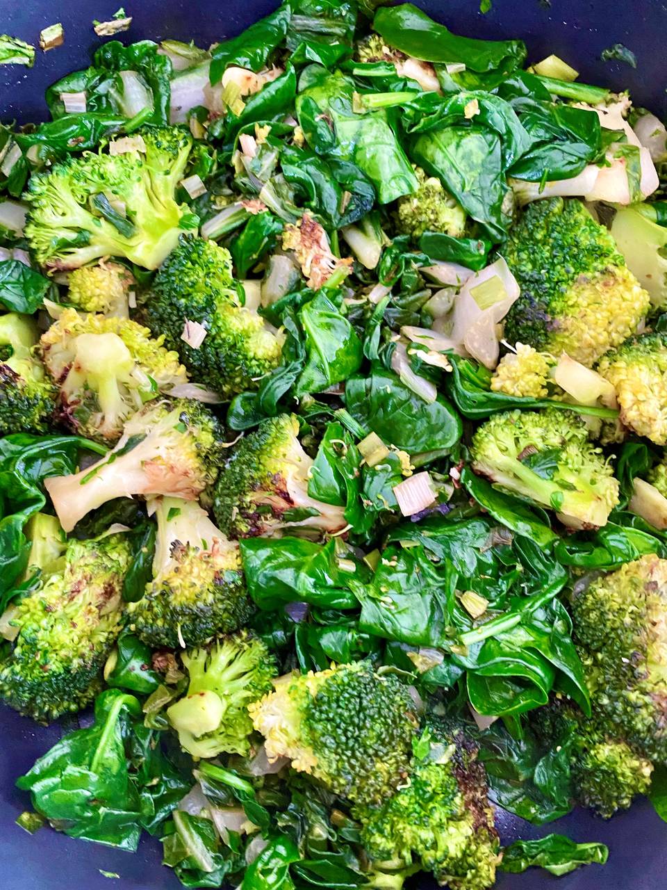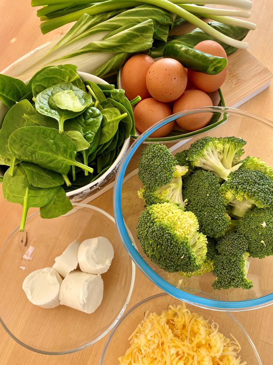 Dafür braucht ihr: Einen Broccoli (500 Gramm), einen Mangold (400 Gramm oder mehr), 250 Gramm jungen Blattspinat, 5 Frühlingszwiebeln, 6 Eier, 100 Gramm geriebenen Käse (gemischte Sorten), 1 kleine Rolle Ziegenkäse (5 Taler), etwas fein gehackte Petersilie, 200 ml Milch oder Kochsahne. Zum Würzen: Eine grüne Chilischote (je nach Größe und Schärfe nicht komplett verwenden), Salz, Pfeffer, evtl. ein halber Teelöffel Chiliflocken. Das Gemüse wird bei dieser Variante nicht blanchiert, sondern nach und nach in der Pfanne mit etwas Olivenöl angebraten. Am besten in dieser Reihenfolge, dann ist am Ende alles durch, aber noch knackig.