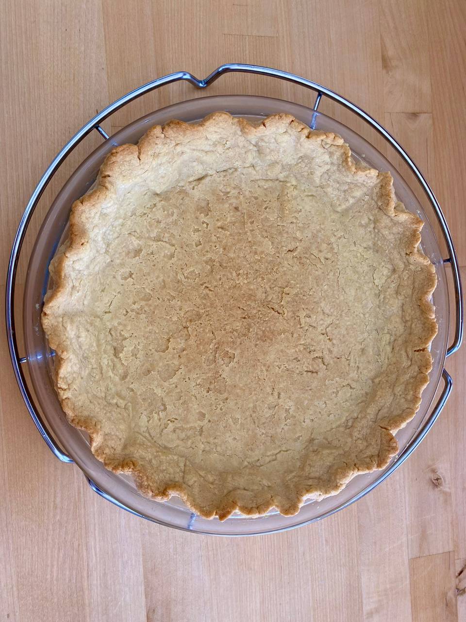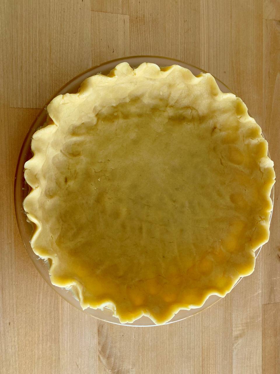 Für den Boden könnt ihr entweder euren eigenen Lieblingsmürbeteig zubereiten oder ihr nehmt 150 Gramm Mehl (550), 1 Prise Salz, 120 Gramm Butter, 1 Teelöffel Apfelessig und 3 bis 4 Teelöffel kaltes Wasser. Die Butter mit dem Mehl vermengen bis Erbsengroße Brösel entstanden sind, möglichst schnell arbeiten, damit der Teig nicht zu warm wird. Den Apfelessig zugeben und 2 Teelöffel Wasser, alles zu einem glatten verarbeiten, wenn er zu trocken ist, noch mehr Wasser zugeben. Den Teig ausrollen, in eine Tarte-Form geben und abgedeckt für mindestens eine halbe Stunde in den Kühlschrank stellen. Danach mit Backpapier auslegen, beschweren mit Linsen oder Backgewichten, 20 bis 25 Minuten bei 180 Grad backen. Das Backpapier entfernen und 15 Minuten weiter backen bis der Teig goldbraun ist.