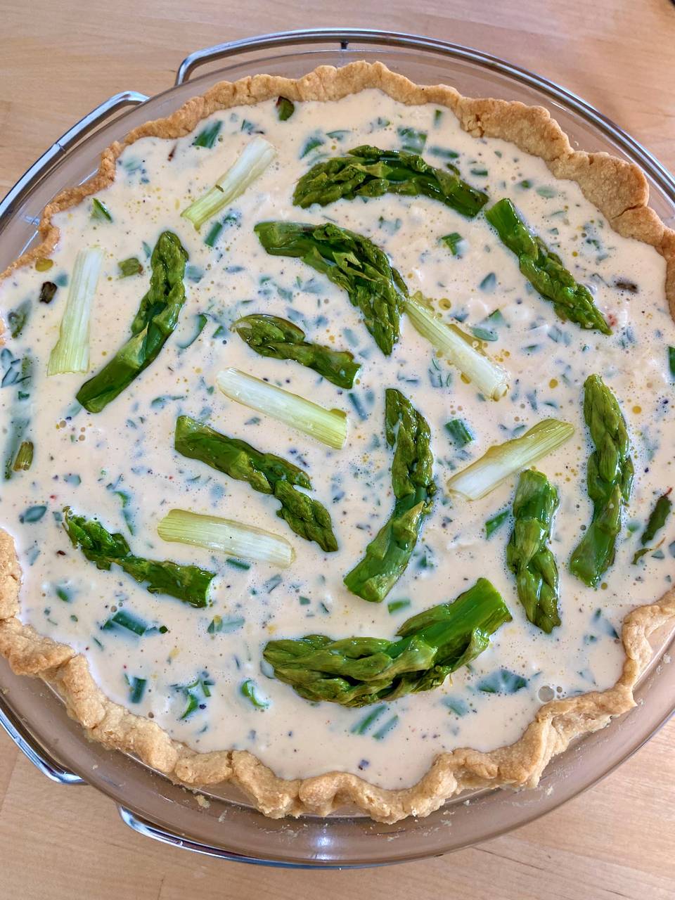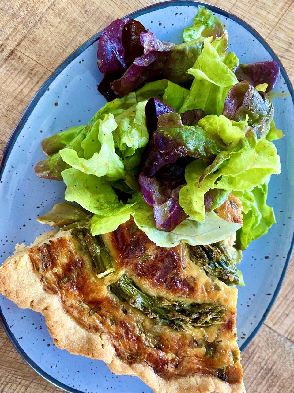 Es ist Spargelzeit. Das Gemüse ist nicht jedermanns Sache, aber wir schlagen eine Spargel-Tarte mit grünem Spargel und Frühlingszwiebeln vor. Das ist ein schnelles Gericht, wenn ihr den Boden schon mal vorbereitet und lässt sich auch gut mitnehmen oder einfrieren. Ich nehme gern grünen Spargel, weil der robuster ist als weißer Spargel. Grüner Spargel lässt sich zum Beispiel prima anbraten und das mache ich auch hier für meine Spargel-Tarte.