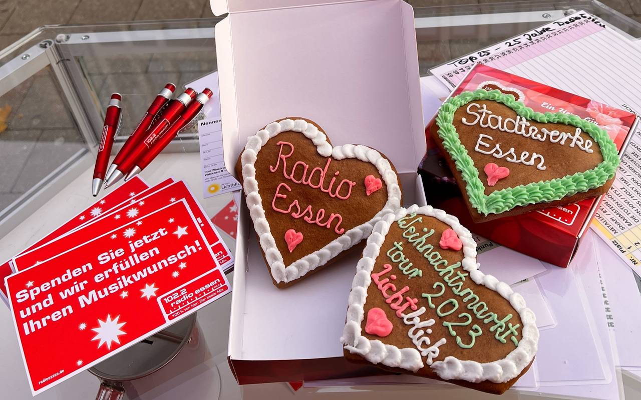 Die Radio Essen Lichtblicke-Weihnachtsmarkt-Tour hat wieder Spenden auf Weihnachtsmärkten in Essen gesammelt. Dafür gab es für Euch Musikwünsche und beschriftete Lebkuchenherzen.