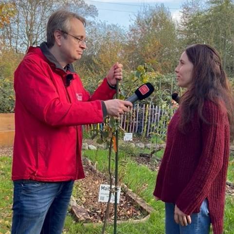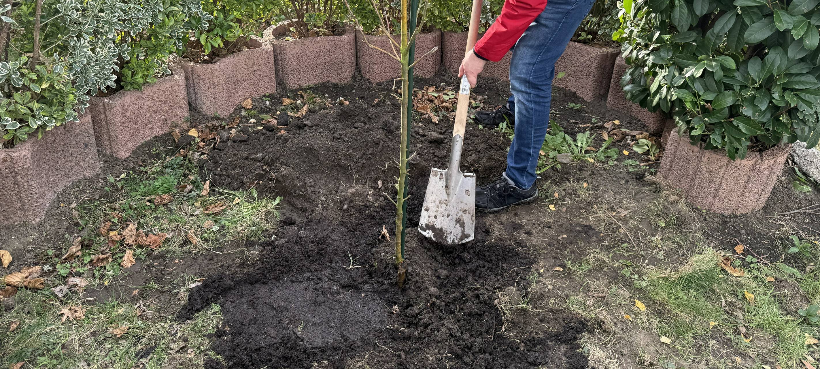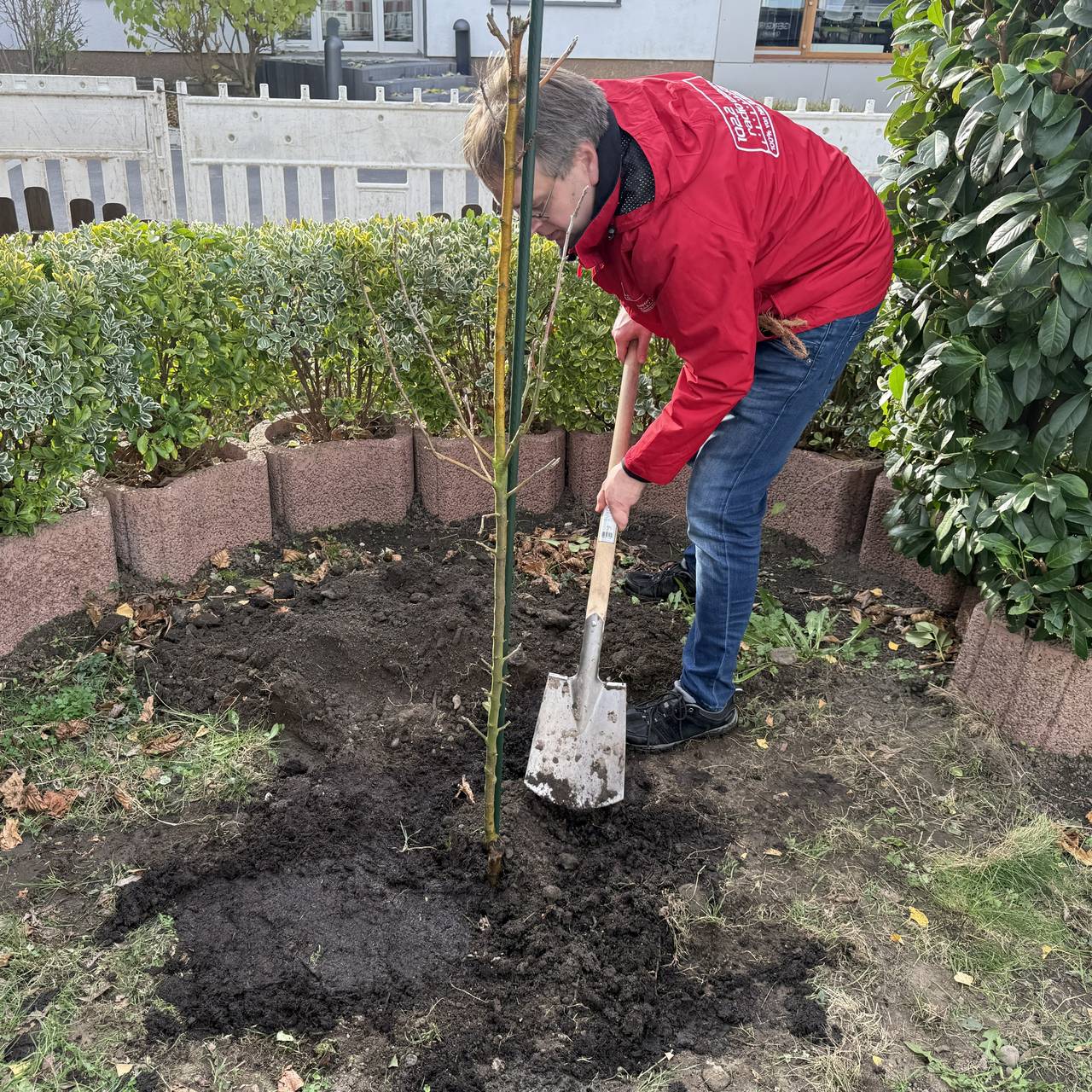 Also: Die Veredelungsstelle bleibt über der Erde, wir bringen gute Pflanzerde und einen Stab als kleine Baumstütze mit. Für Wasser und Spaten sorgt die Caritas. Am Donnerstag (13.11.2025) haben unsere Frühschicht-Moderatoren Larissa Schmitz und Christian Bannier dann den Apfelbaum gepflanzt, einen "Cox Columna“, eine Säulenform des beliebten Cox Orange. Vorteil: Der Baum wird maximal drei Meter groß und passt prima in den Vorgarten. Außerdem ist er leicht zu pflegen. Bald gibt es dort also leckere süße rot-gelbe Äpfel. Danke auch für die Unterstützung an das ganze Team der Caritas, besonders an Vivien und Marius!