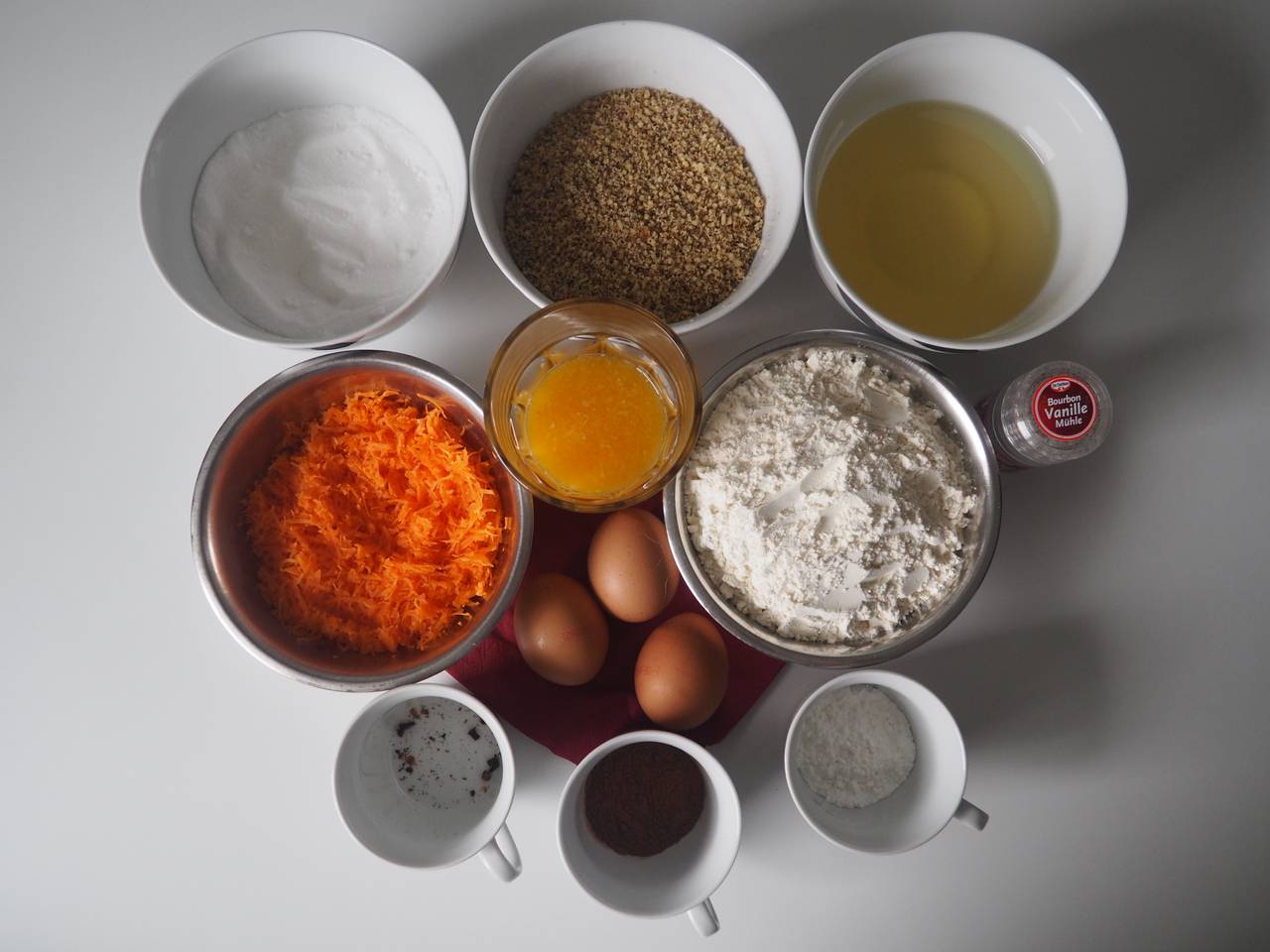 Für den Karotten-Walnusskuchen brauchen wir folgende Zutaten: