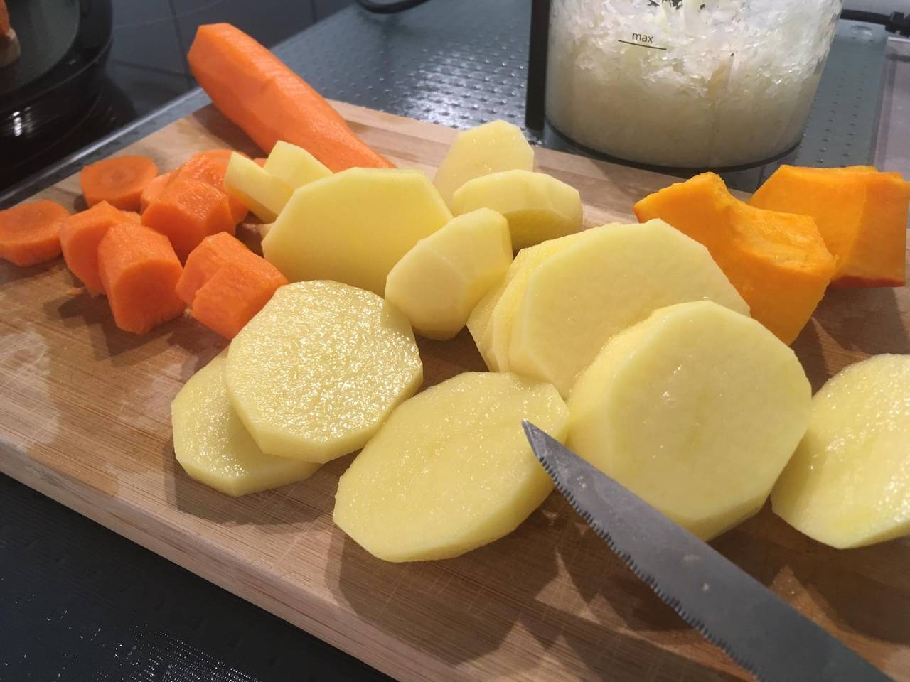 - Schritt 1: Die Zutaten waschen, schälen, schneiden. Also, Zwiebeln, Knoblauch, Ingwer, Kürbis, Kartoffeln und Karotten. Den Kürbis von oben nach unten in Scheiben schneiden. Die Kürbiskerne von innen mit einem Löffel entfernen und anschließend den Kürbis in mundgerechte Stücke schneiden (nicht schälen).