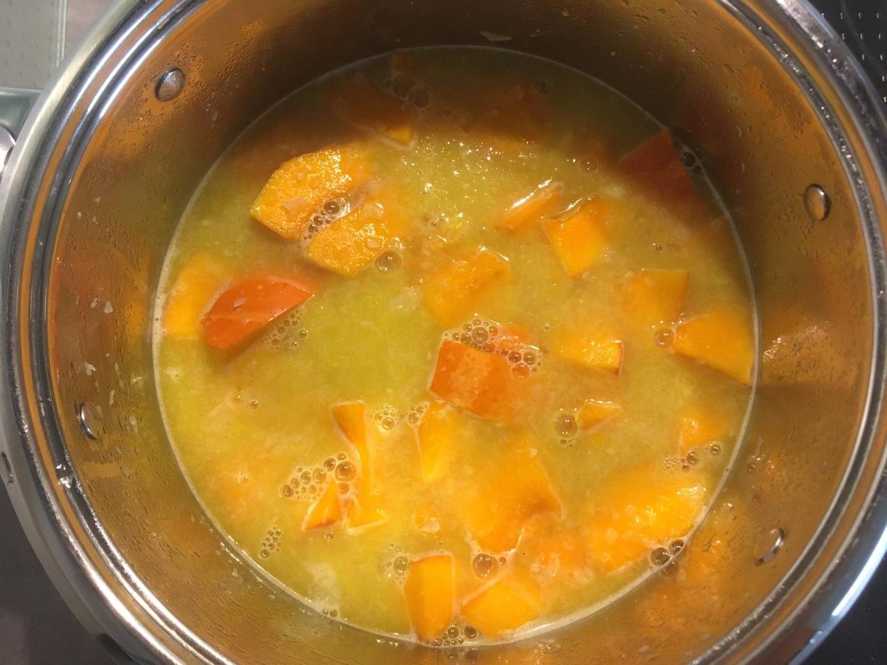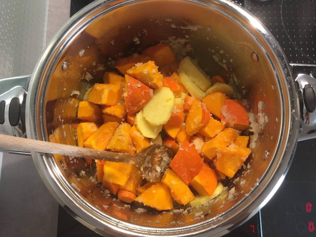 - Schritt 2: Rapsöl in einen Topf gießen. Anschließend Zwiebeln, Knoblauch, Ingwer, Kürbis, Kartoffeln und Karotten gemeinsam in den Topf geben und für 2 bis 3 Minuten anbraten. Umrühren dabei nicht vergessen!