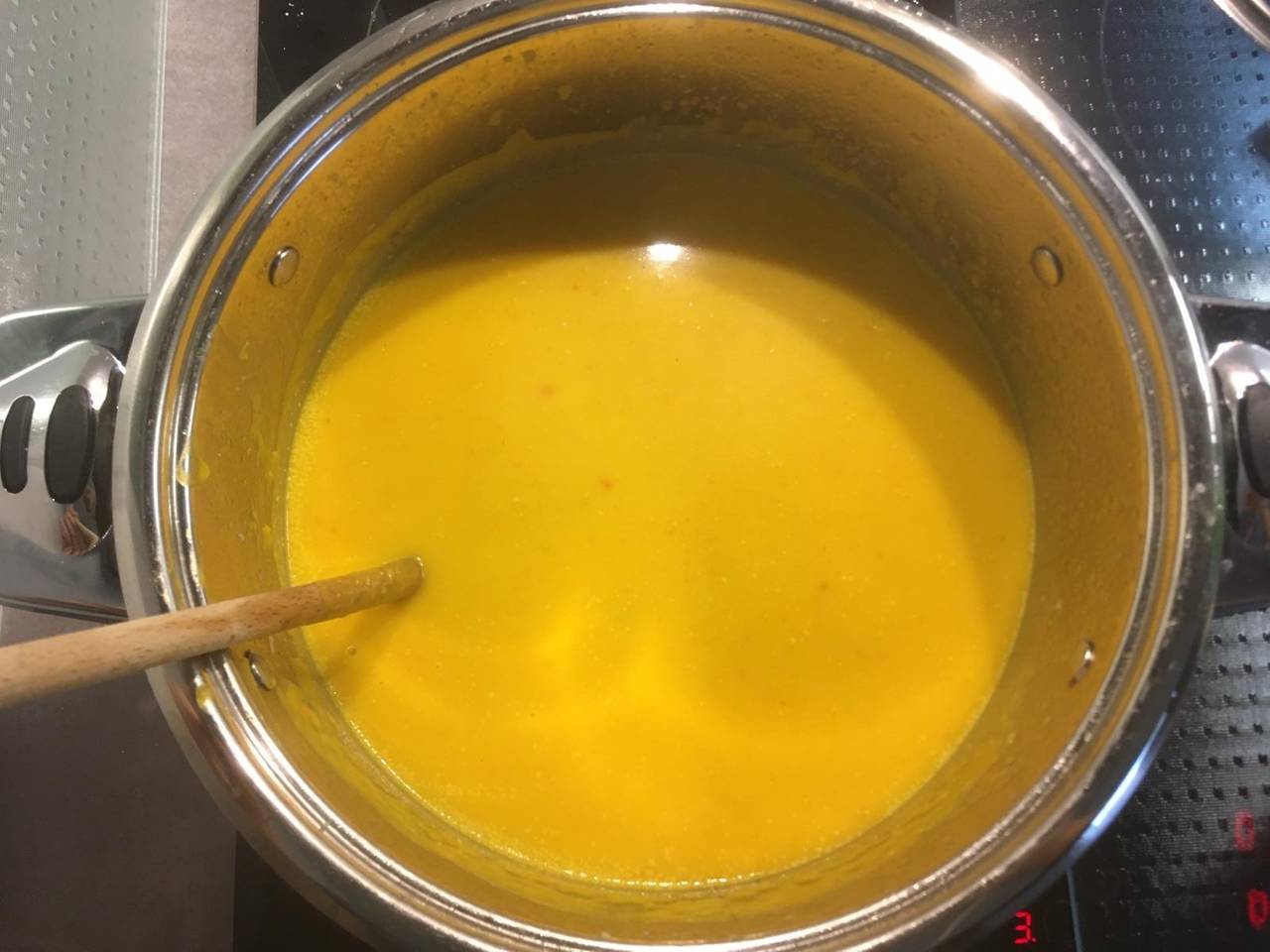 - Schritt 5: Die Kokosmilch langsam dazugeben und rühren, dann würzen und noch mal 1 Minute auf niedriger Stufe kochen lassen. Fertig!