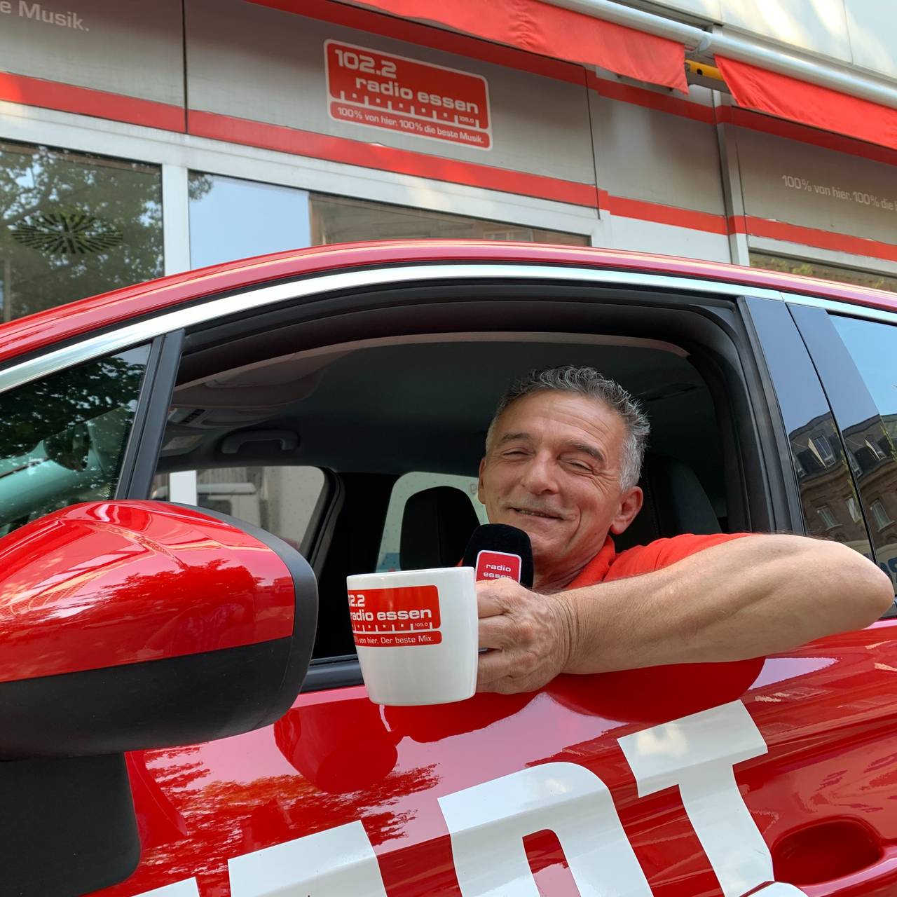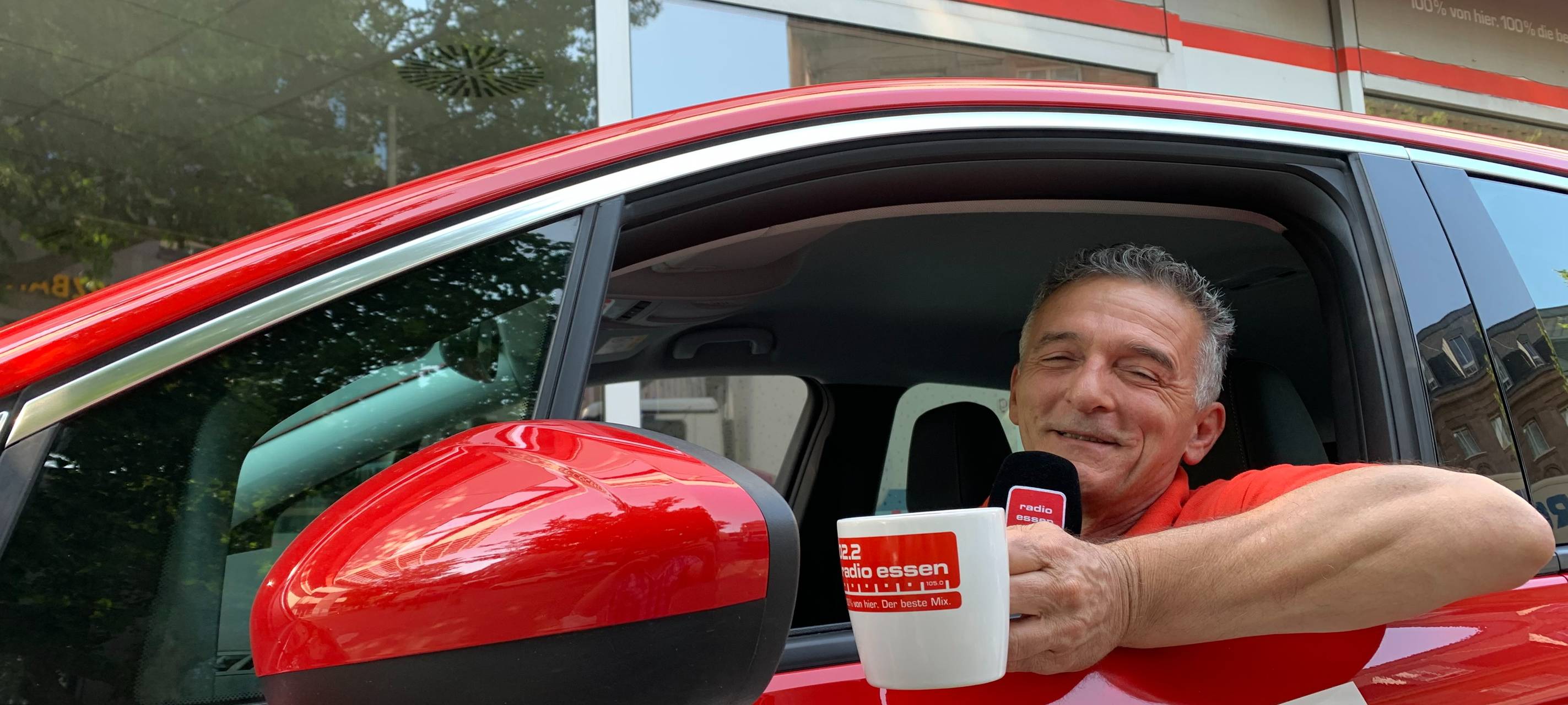 Beim Radio Essen-Tauschgeschäft haben wir mit unserer Radio Essen-Tasse angefangen. Unser Stadtreporter Kostas Mitsalis wollte am Ende ein Auto ertauscht haben. Das hat er geschafft. Naja.. fast :-) Er hat VIP-Fahrstunden bekommen. Die haben wir verlost. Silke aus Freisenbruch hat gewonnen und ihre VIP-Fahrstunden im E-Auto eingelöst. Unser Radio Essen-Stadtreporter hat es sich auf der Rücksitzbank gemütlich gemacht.