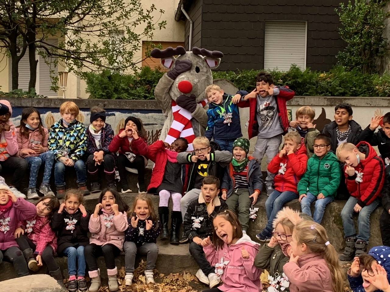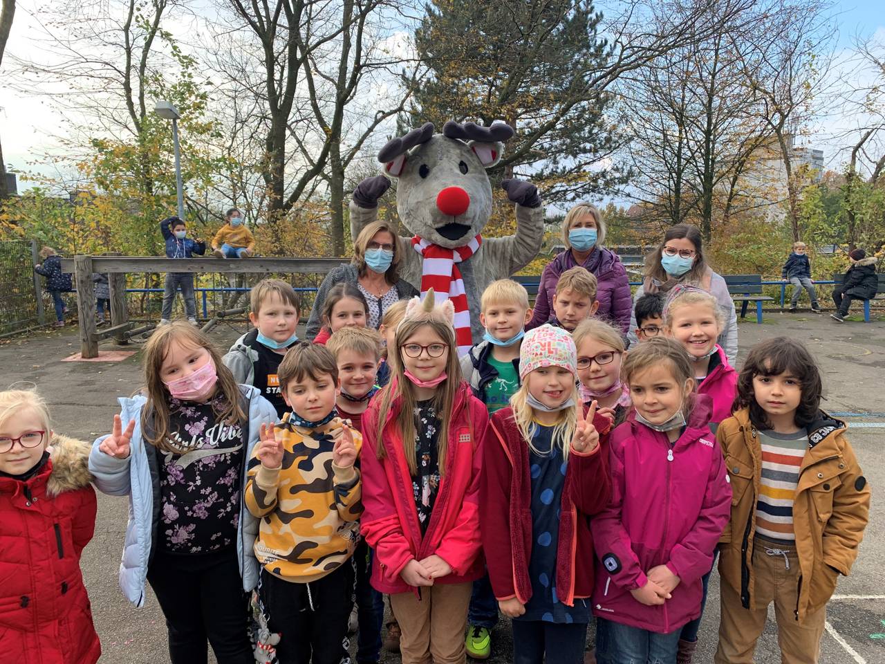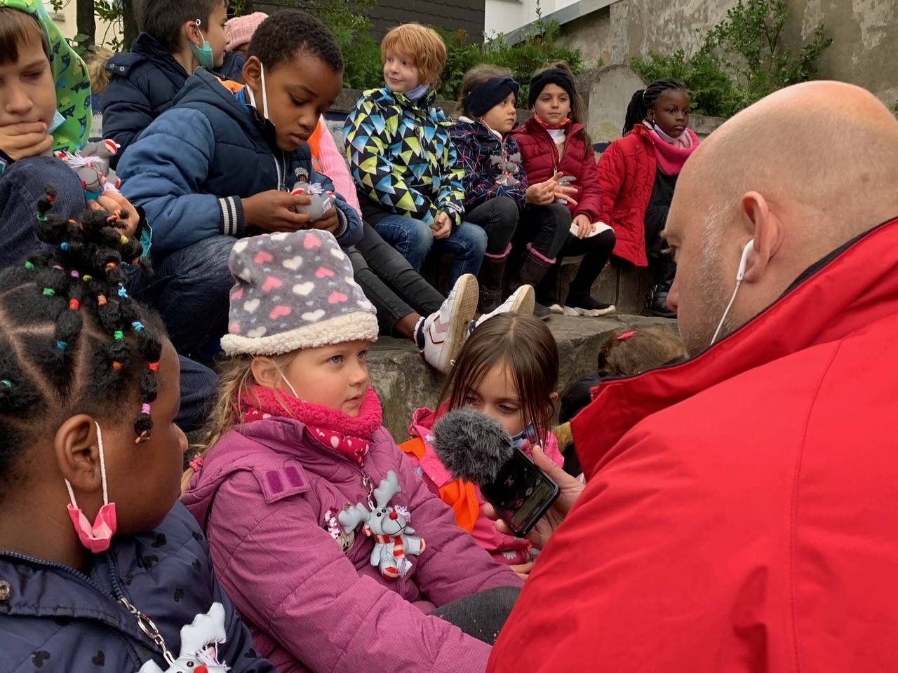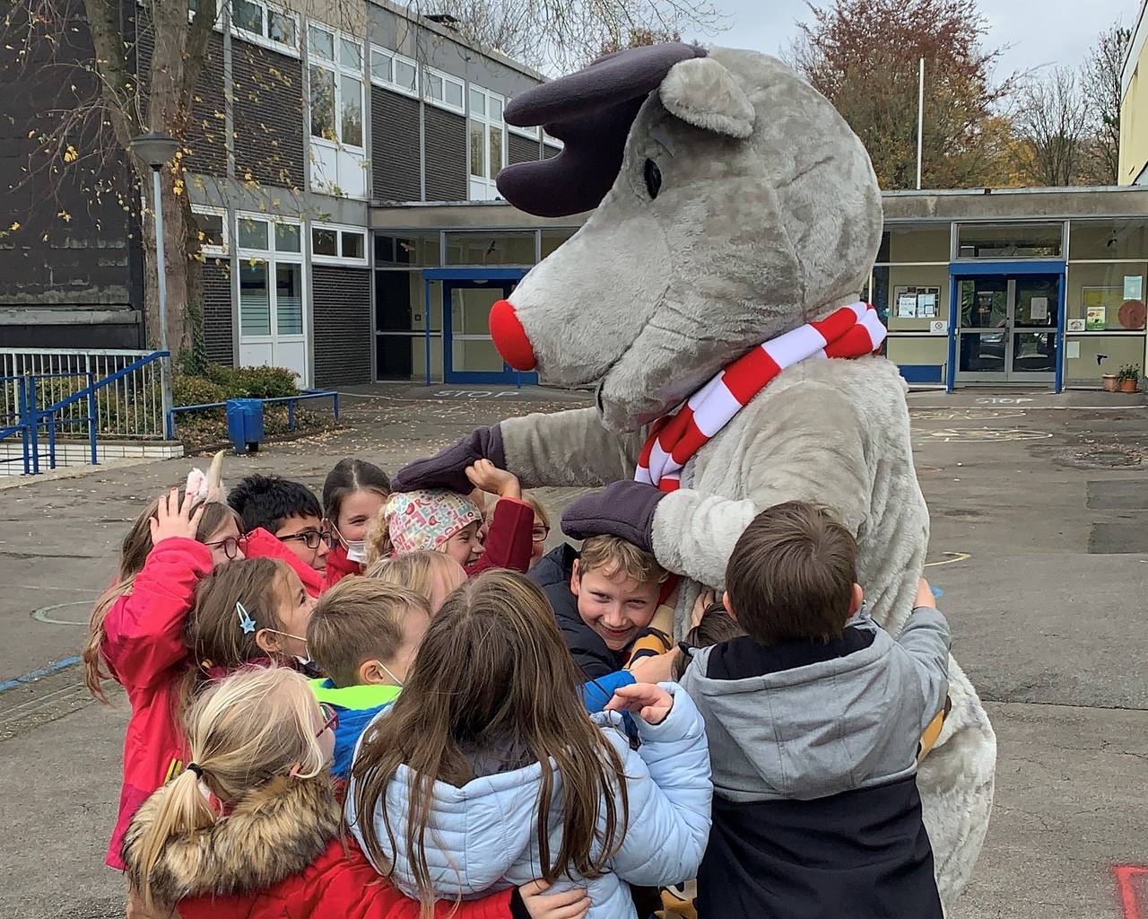 Los ging es mit der Elisabethschule in Essen-Frohnhausen. Hier haben sich die Kinder eine Stunde Verkehrsunterricht mit der Essener Polizei und Radio Essen-Maskottchen Elch Emil gewünscht. Aber zuerst haben die Kinder Radio Essen-Moderator Timm Schröder verraten, was ihnen schon Gefährliches auf dem Schulweg passiert ist und, welche Regeln für den Straßenverkehr sie schon kennen.
