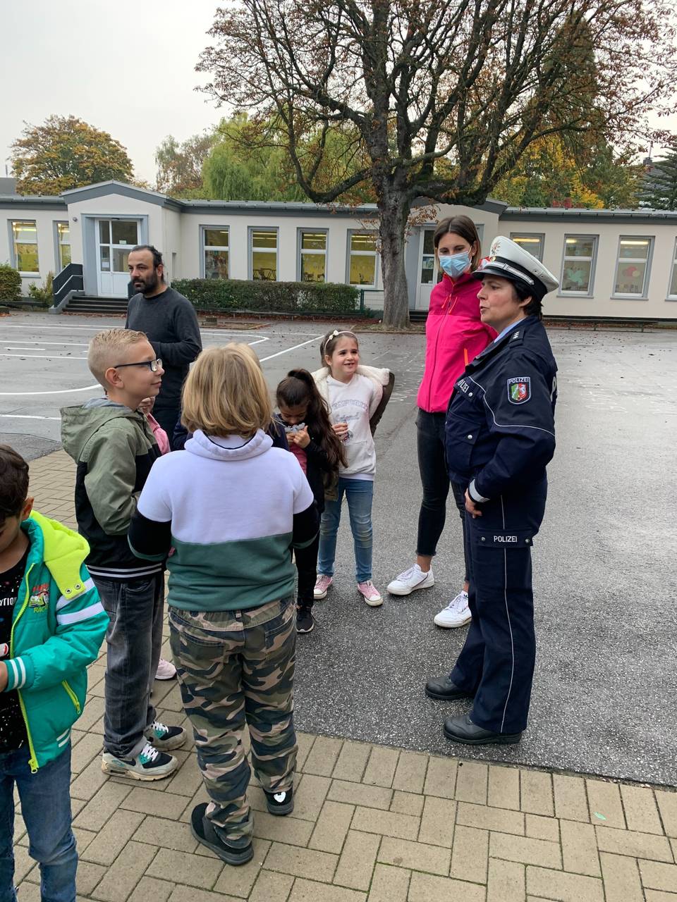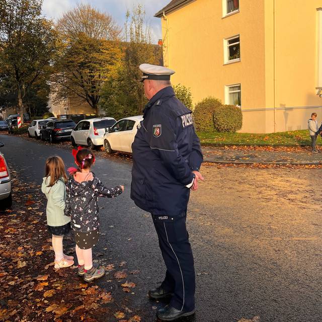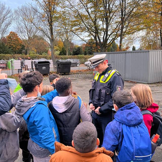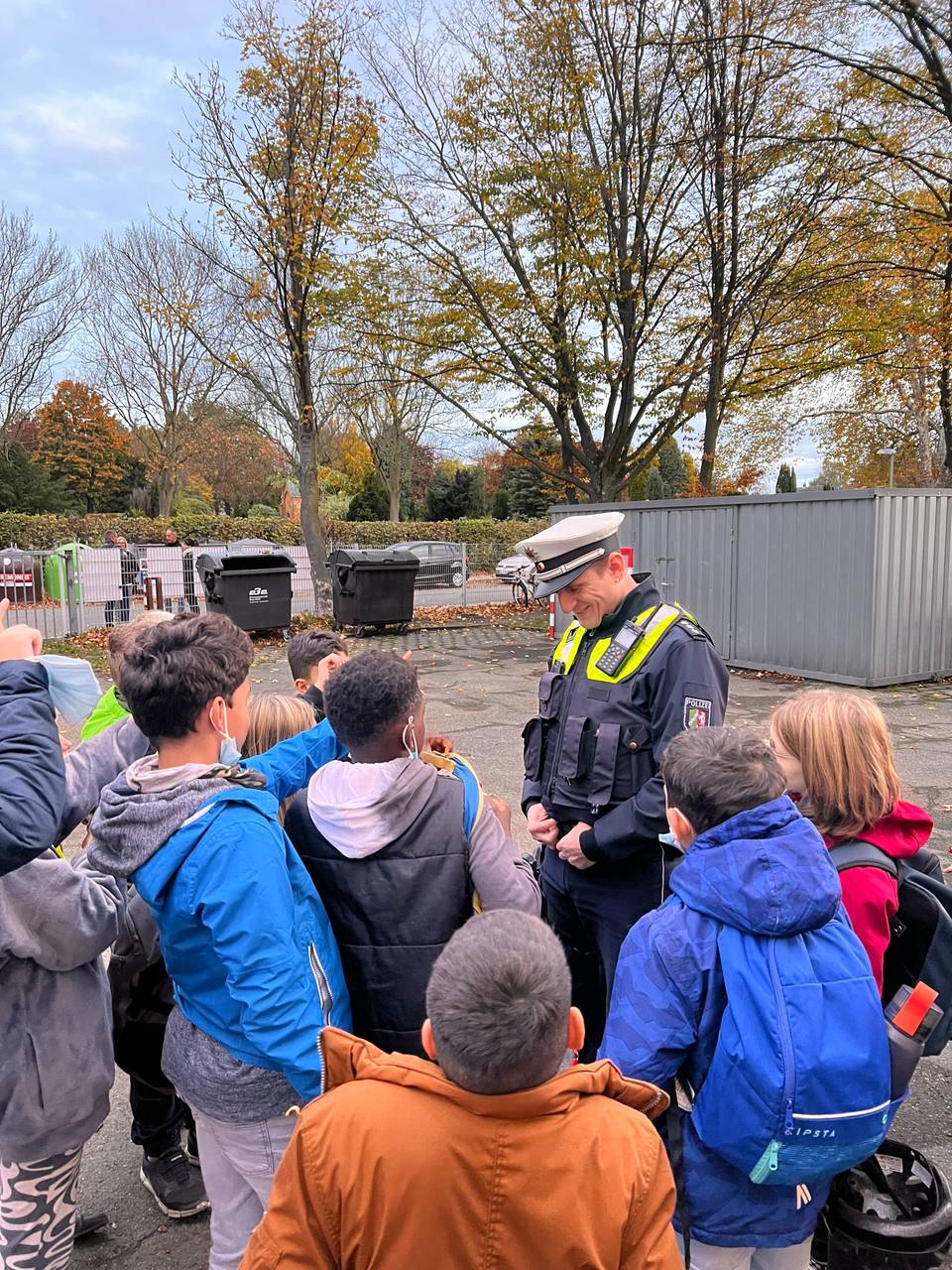 Polizist Markus Robusch von der Polizei Essen hat den Kindern nochmal die Verkehrssituation erklärt: "Besonders wichtig ist es auch an diesem Zebrastreifen wieder genau zu gucken. Oftmals können die LKW-Fahrer die Kinder auf der Straße nicht richtig sehen, weil das Führerhaus so hoch ist", erzählt er.