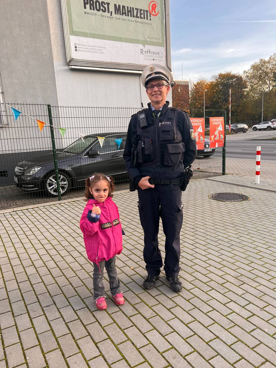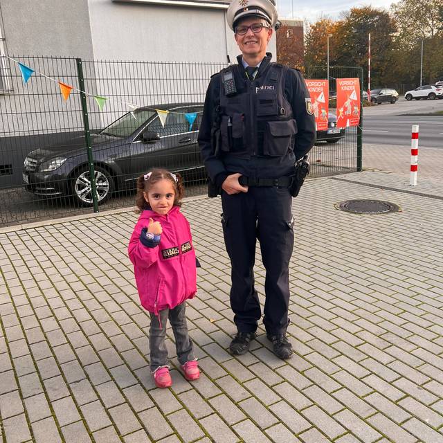 In Karnap hatten wir - wie auch schon in Frohnhausen, Freisenbruch und Horst - tatkräftige Unterstützung von der Polizei Essen. Die hat sich von den Kindern ausfragen lassen. Am häufigsten kam die Fragen, die Pistolen denn auch wirklich echt seien. Die Polizistinnen und Polozisten haben den Kindern auch einiges über den Straßenverkehr beigebracht. Polizei-Hauptkomissarin Sabine Grothos hat den Kindern an der Ampel nochmal genau erklärt, was zu tun ist: Auch wenn die Ampel grün ist sollen alle Kinder nochmal schauen ob die Autos auch wirklich anhalten, sagt sie.