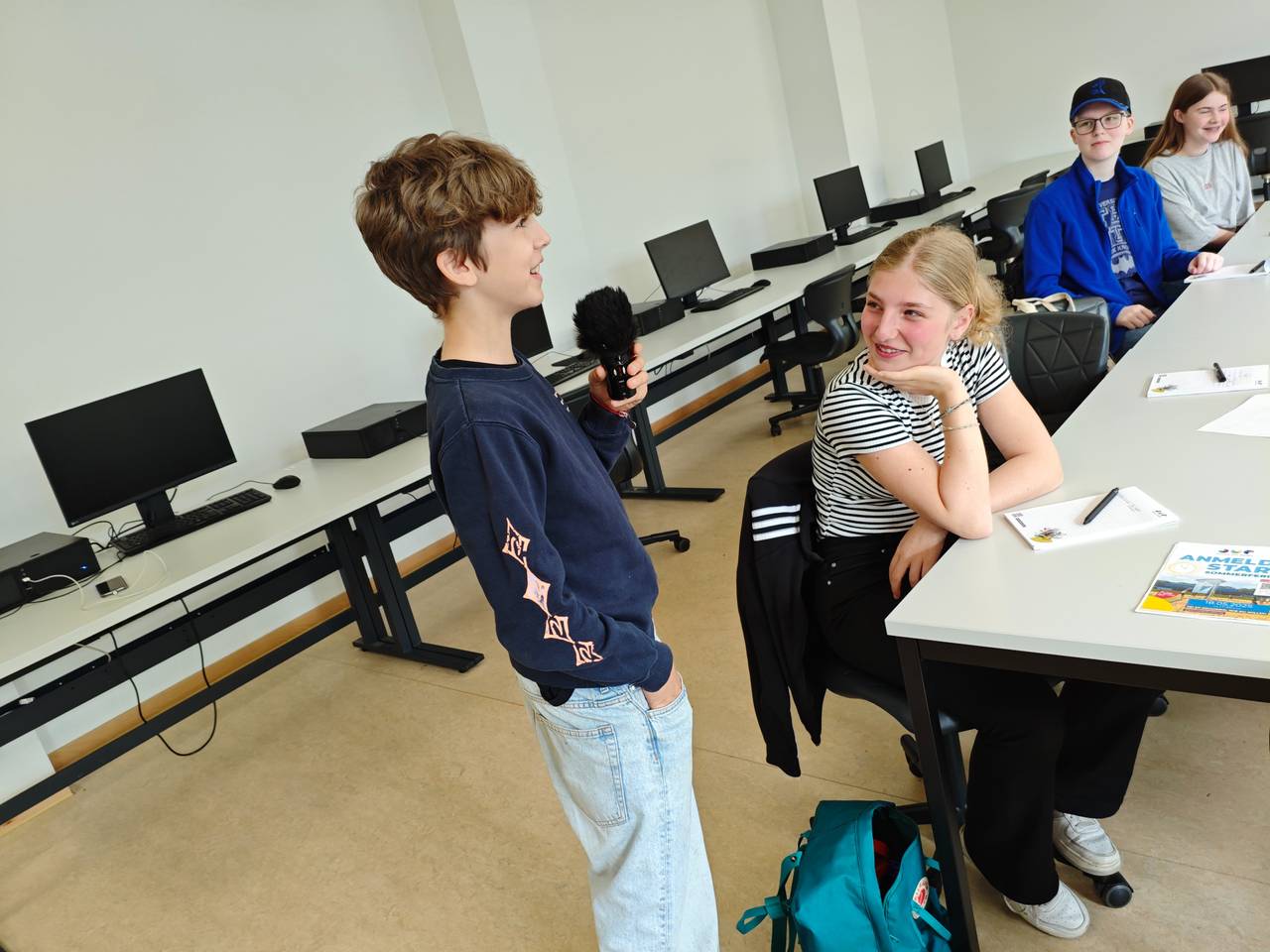 Nach der Mittagspause kamen dann zwei echte Schornsteinfegerinnen zum Interview vorbei. Felicia Springer und Auszubildende Jana Kahlert. Radiocamper Liam durfte die gesammelten Fragen der Gruppe stellen. Zur Belohnung hatten die beiden Schornsteinfegerinnen sogar Glücksbringer für alle dabei.