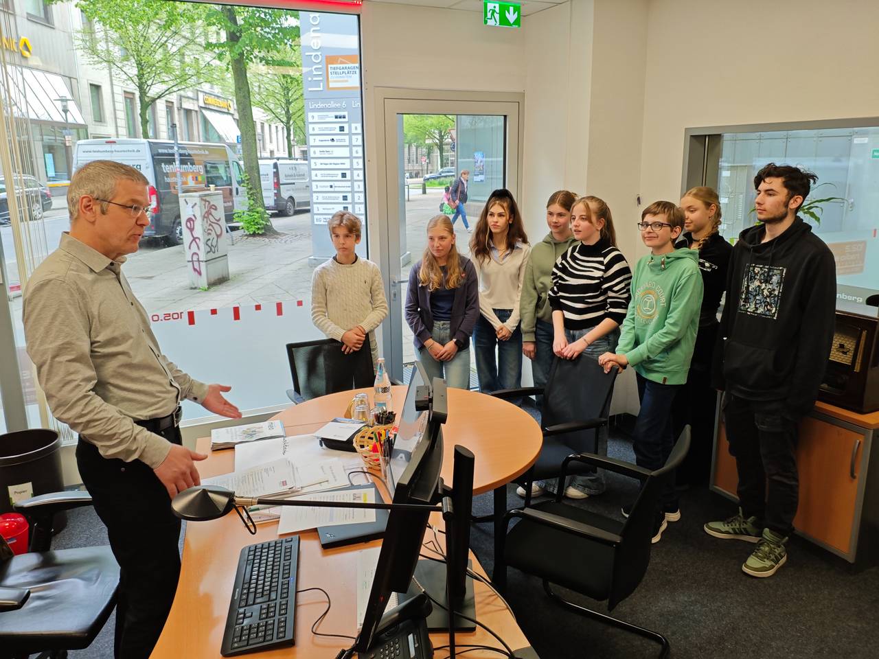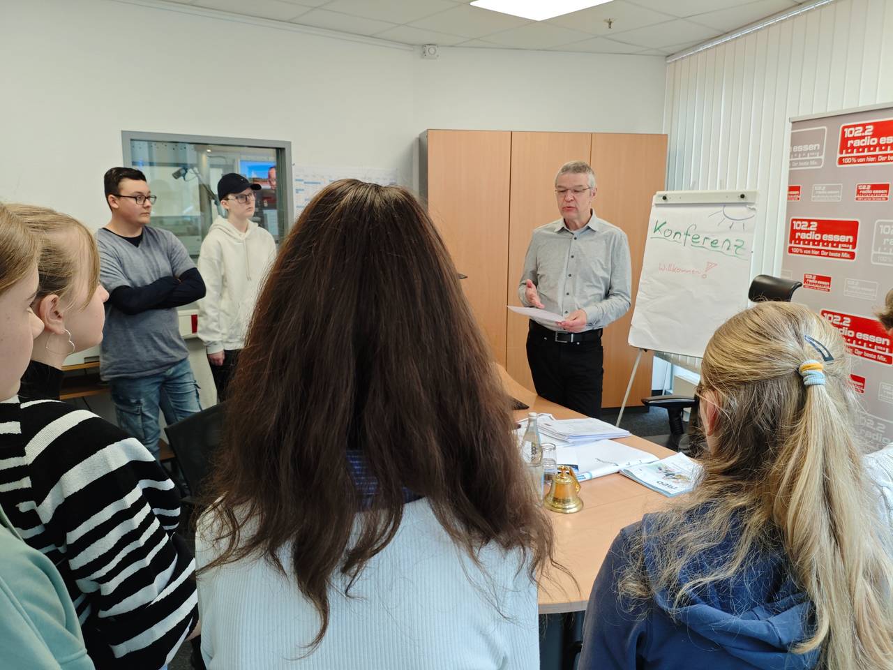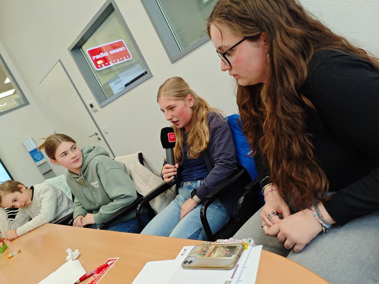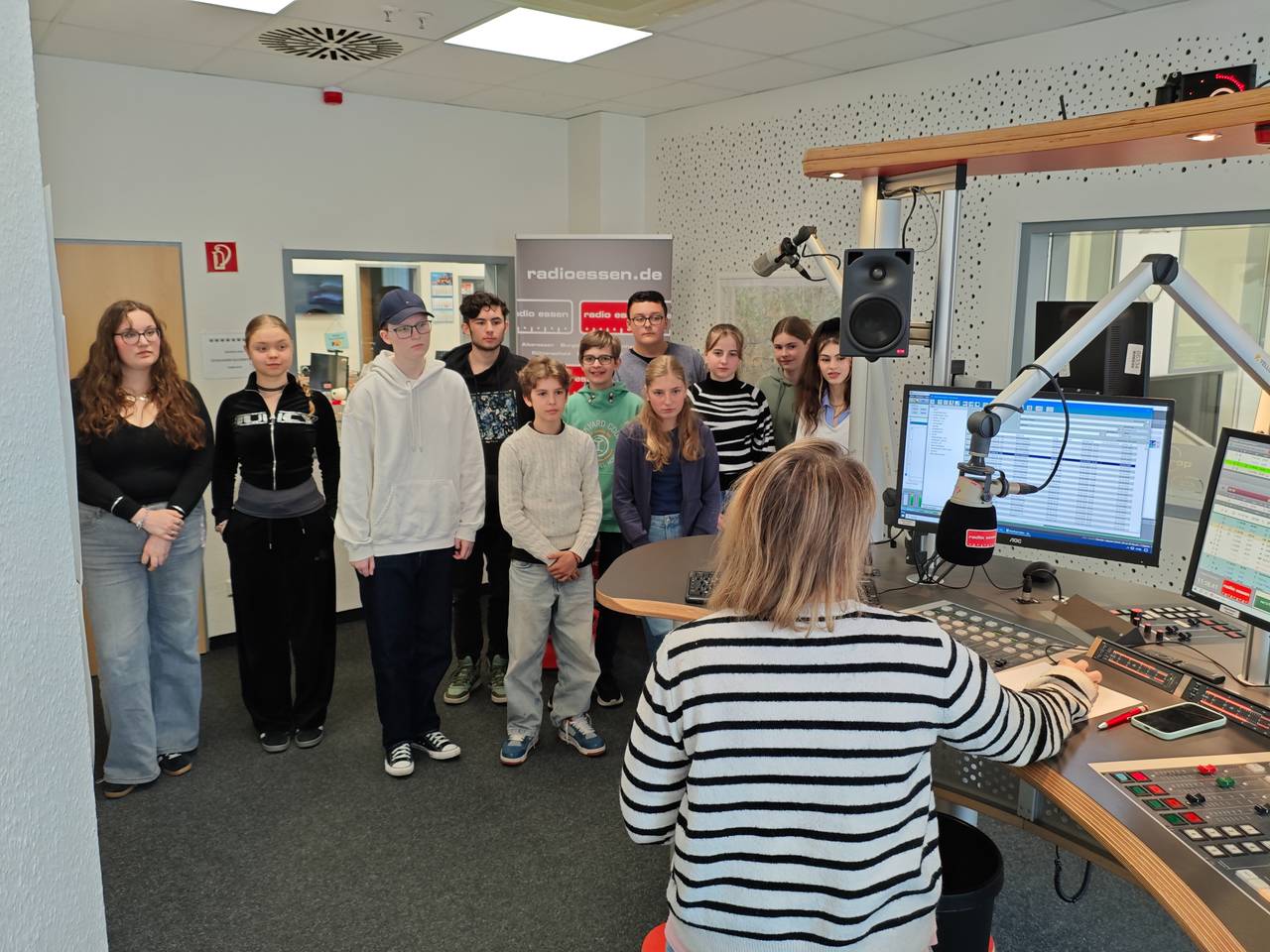 Der letzte Tag beim Radiocamp ist traditionell bei Radio Essen in der Radioredaktion. Die Radiocamperinnen und Radiocamper haben einen Einblick in die Redaktionsarbeit bekommen, viele Kolleginnen und Kollegen bei Radio Essen kennengelernt, durften den Chefredakteur Christian Pflug mit Fragen löchern, ein Reel für Instagram aufnehmen, um für die eigene Sendung Werbung zu machen, live in die Musikwunschsendung von Teresa Ledabyl und sie waren zu Gast im Podcast Redebedarf 2.0.