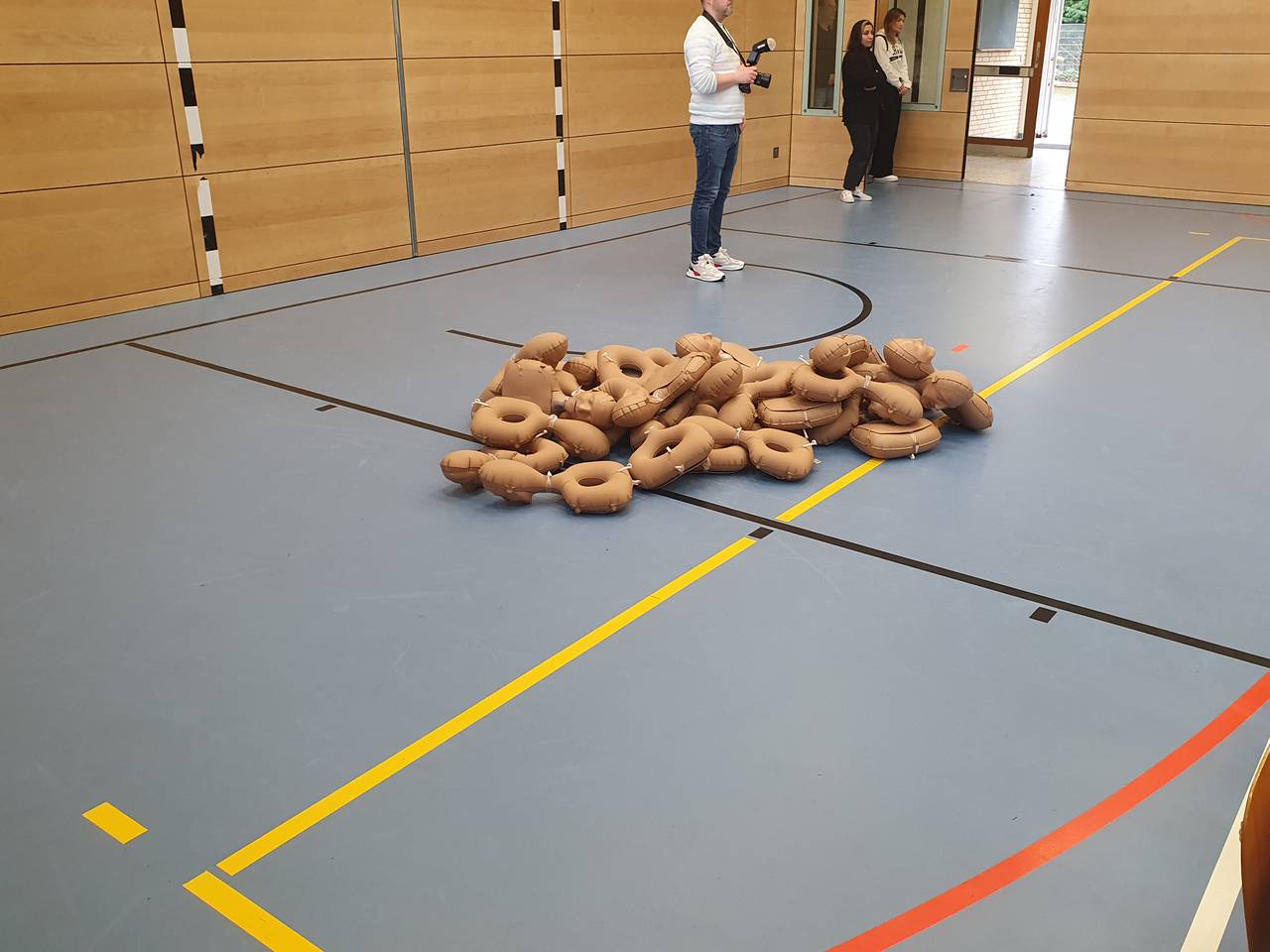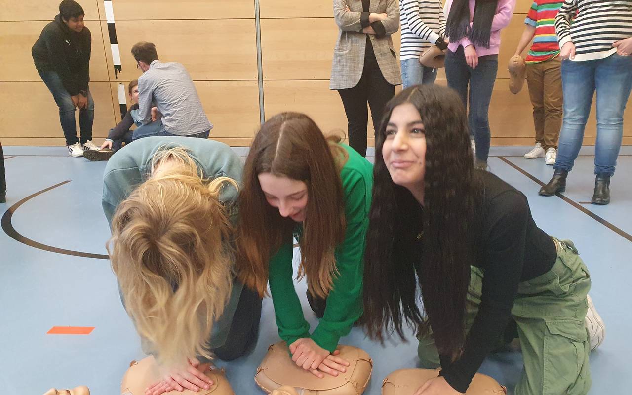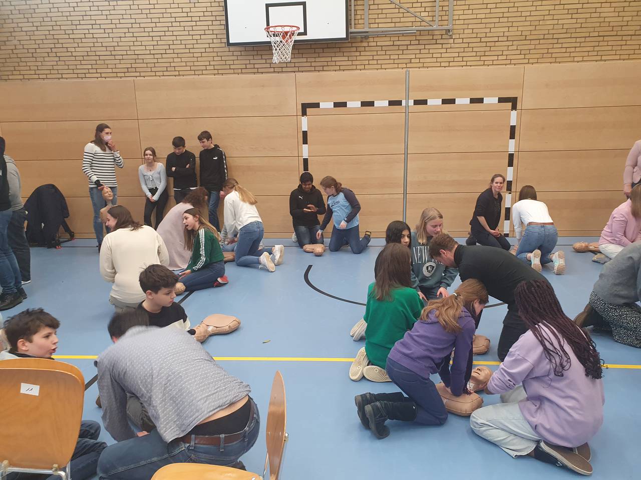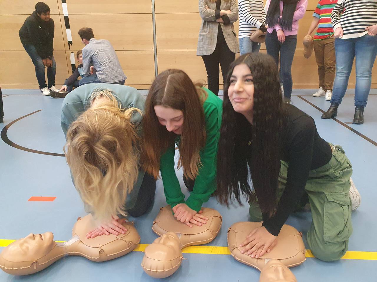 An der Elsa-Brandström-Realschule in Bergerhausen haben am Montagnachmittag (13.03) die Schülerinnen und Schüler trainiert, einen Menschen wiederzubeleben. Dazu haben sie Puppen benutzt, die so ausgestattet waren, dass sie bei genug Kraft während der Herzdruckmassage auch geknackt haben. Die Schülerinnen und Schüler mussten sich ziemlich abmühen, um stark genug dafür zu drücken. Für die Lehrer war das Training ein voller Erfolg, da die Kinder dabei auch gut vorbereitet werden auf eine reale Notsituation. Solche Übungen werden an der Realschule ab der sechsten Klasse jährlich praktiziert.