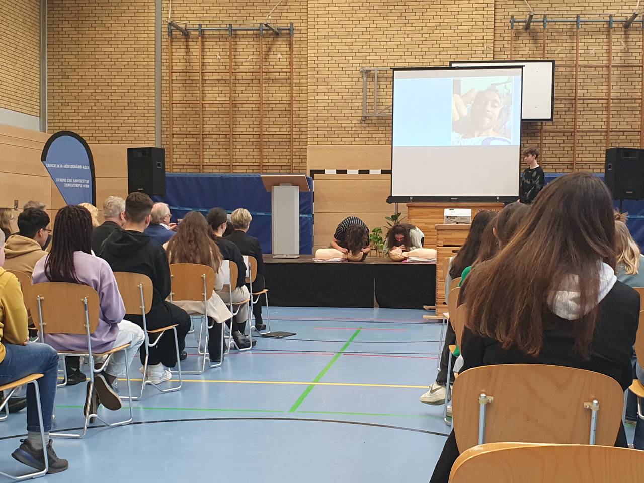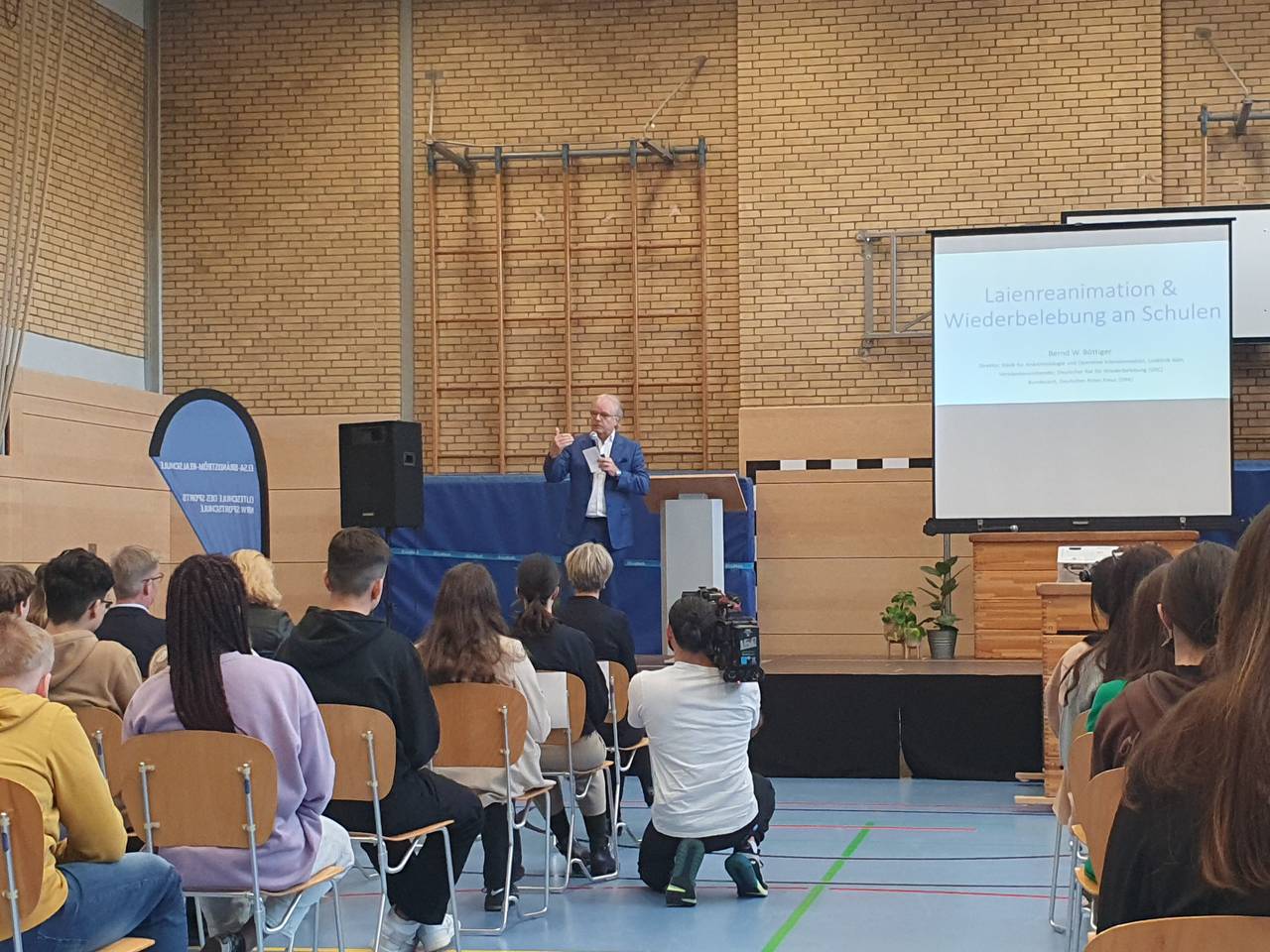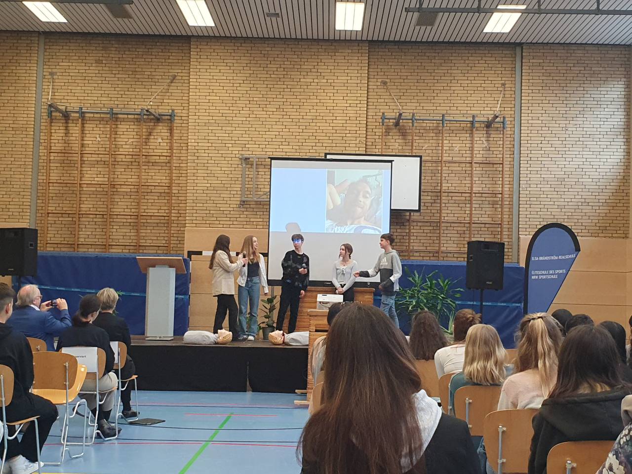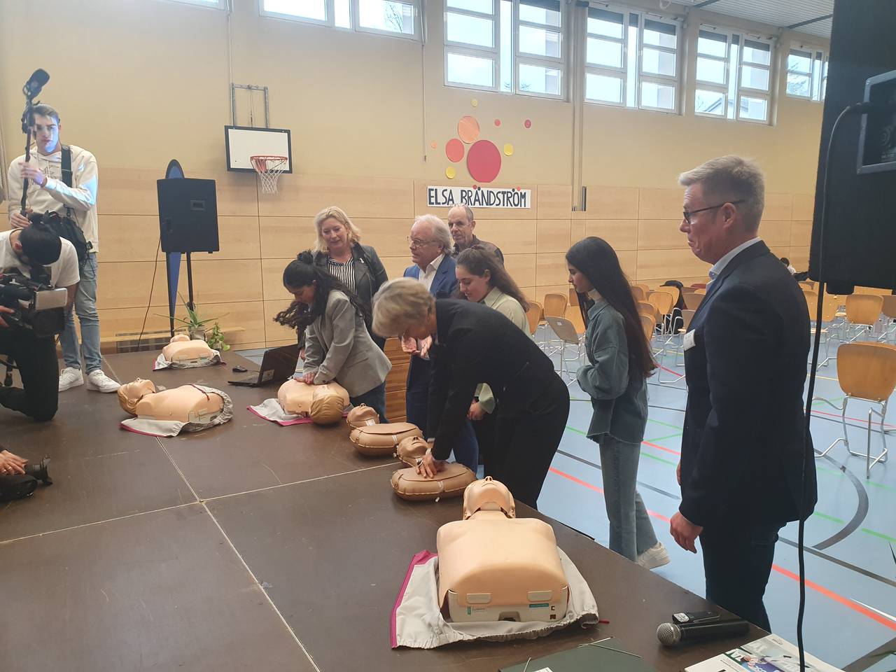 Das Reanimationstraining hatte sogar ein eigenes Rahmenprogramm. Schulministerin Dorothee Feller begann die Veranstaltung mit einer kurzen Rede, in der sie die Aktion lobte und deutlich machte, dass sie sich dafür einsetzen will, dass es an mehr Schulen in Deutschland regelmäßige Reanimationsübungen gibt. Auch der Vorsitzende des deutschen Rates für Wiederbelebung, Prof. Dr. Bernd Böttinger forderte in seiner Präsentation über die Reanimation eine Verpflichtung der Schulen, regelmäßige Workshops zu diesem Thema einzuführen. Das Rahmenprogramm fand seinen Abschluss in der Präsentation der 8c der Elsa-Brandström-Realschule, die aus einer Diskussionsrunde und einer praktischen Demonstration bestand.