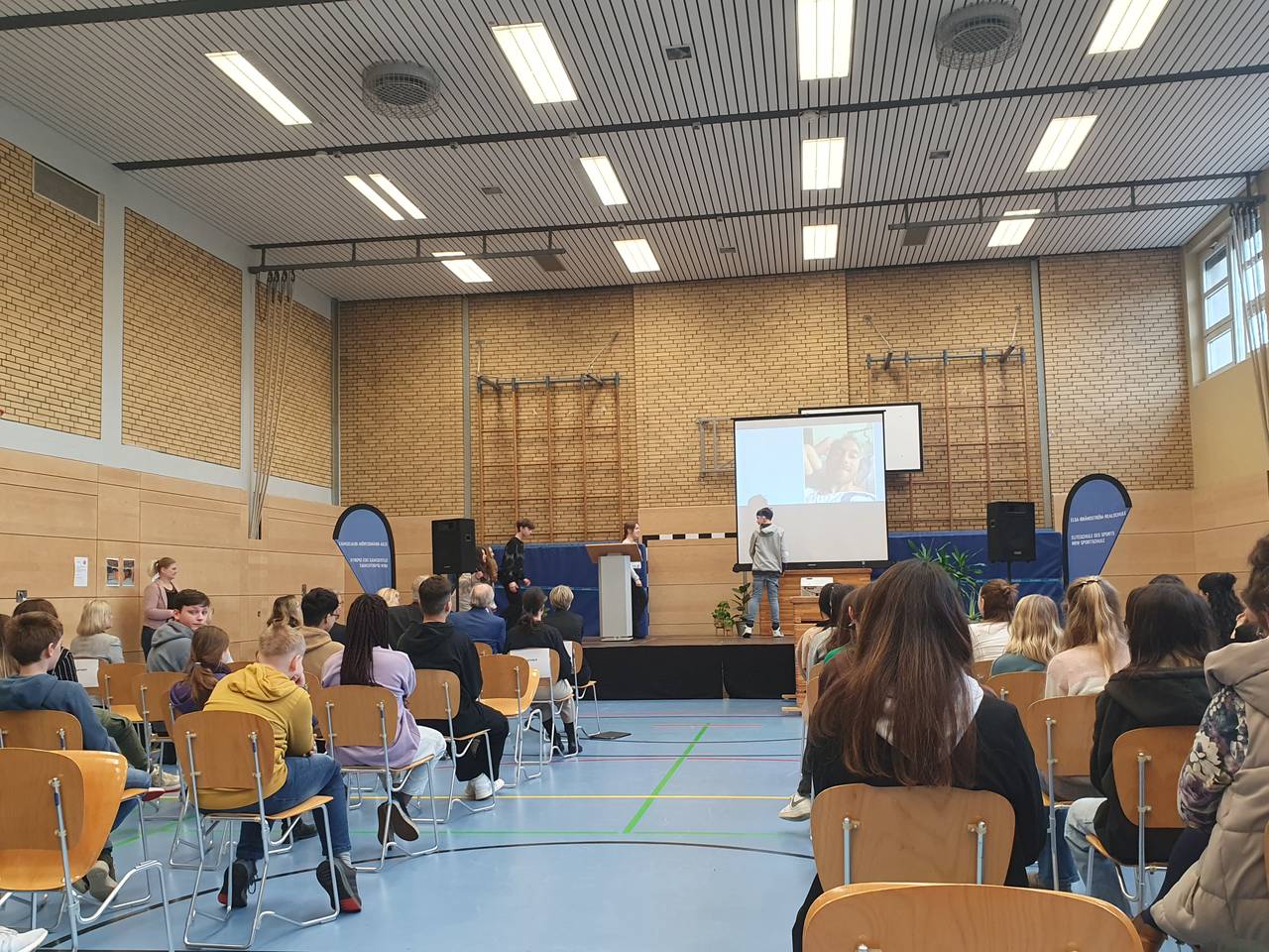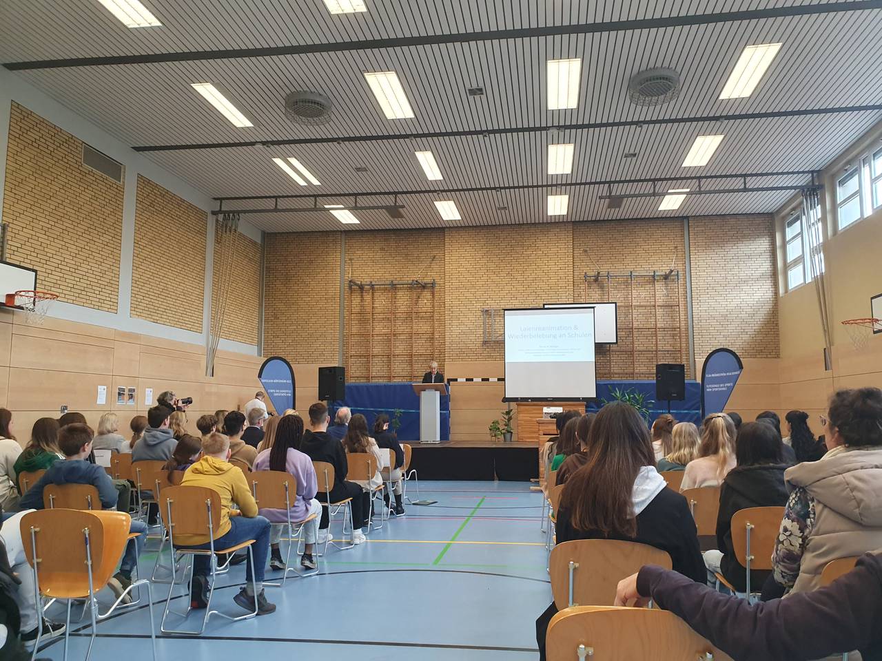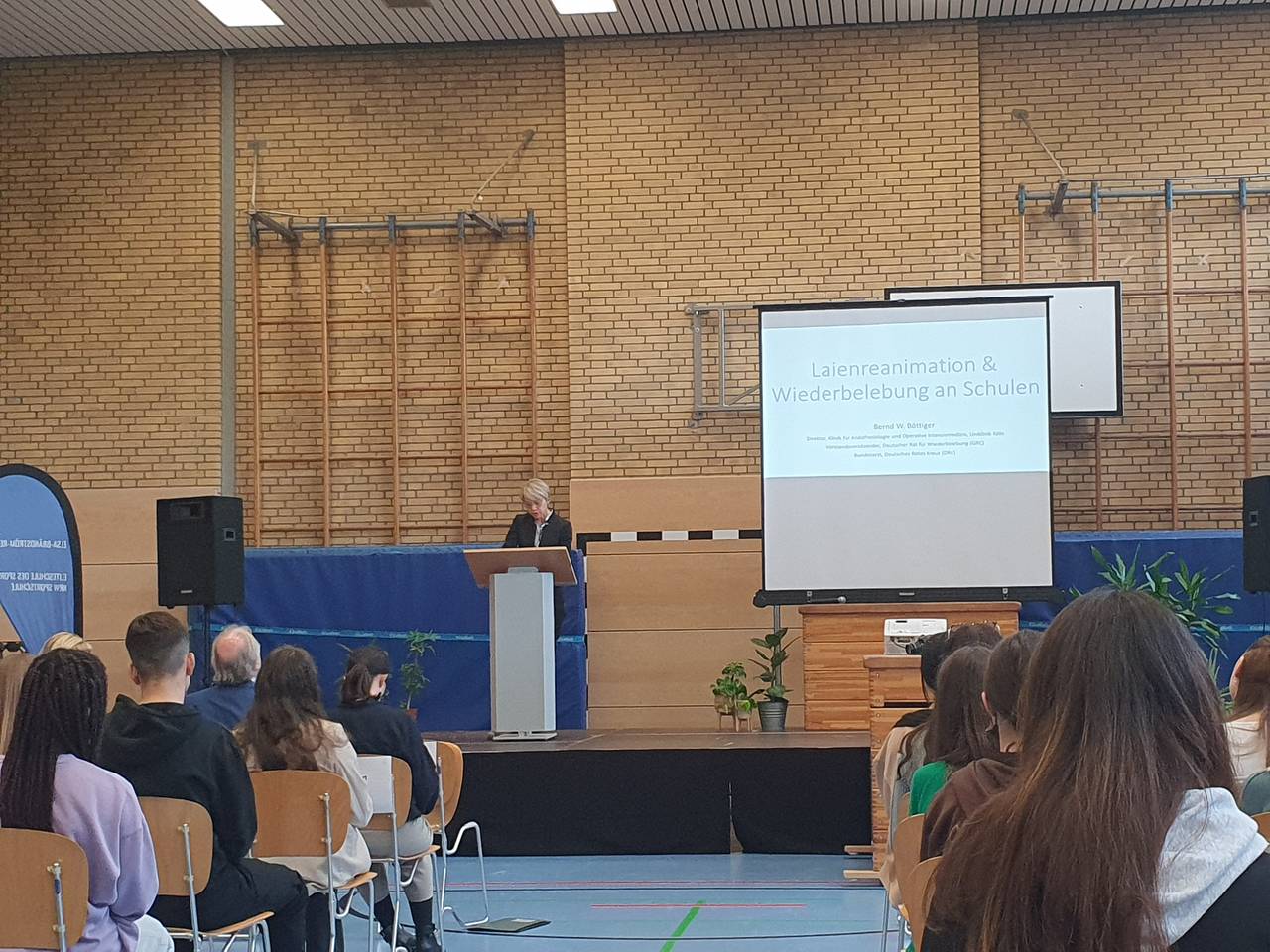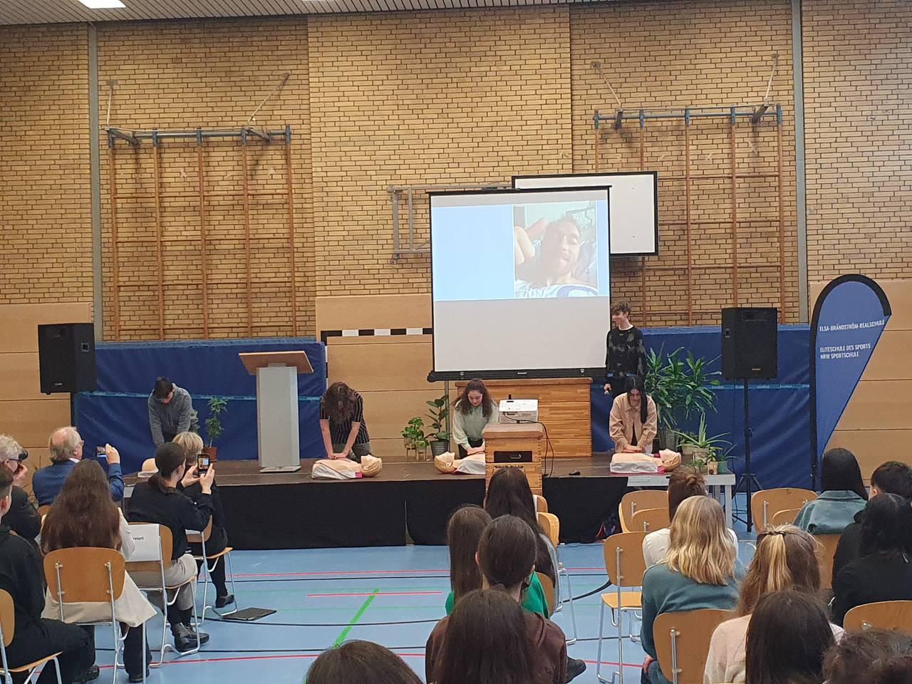 Das Reanimationstraining hatte sogar ein eigenes Rahmenprogramm. Schulministerin Dorothee Feller begann die Veranstaltung mit einer kurzen Rede, in der sie die Aktion lobte und deutlich machte, dass sie sich dafür einsetzen will, dass es an mehr Schulen in Deutschland regelmäßige Reanimationsübungen gibt. Auch der Vorsitzende des deutschen Rates für Wiederbelebung, Prof. Dr. Bernd Böttinger forderte in seiner Präsentation über die Reanimation eine Verpflichtung der Schulen, regelmäßige Workshops zu diesem Thema einzuführen. Das Rahmenprogramm fand seinen Abschluss in der Präsentation der 8c der Elsa-Brandström-Realschule, die aus einer Diskussionsrunde und einer praktischen Demonstration bestand.