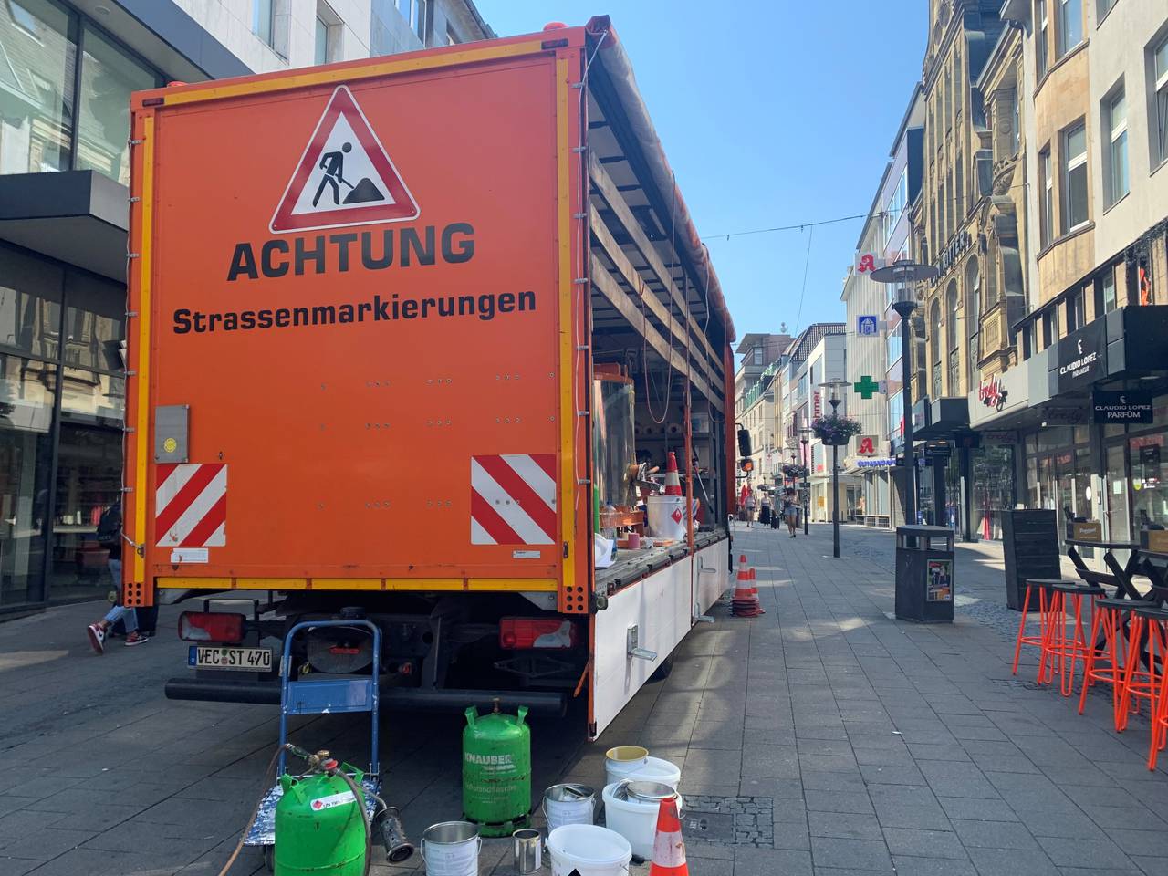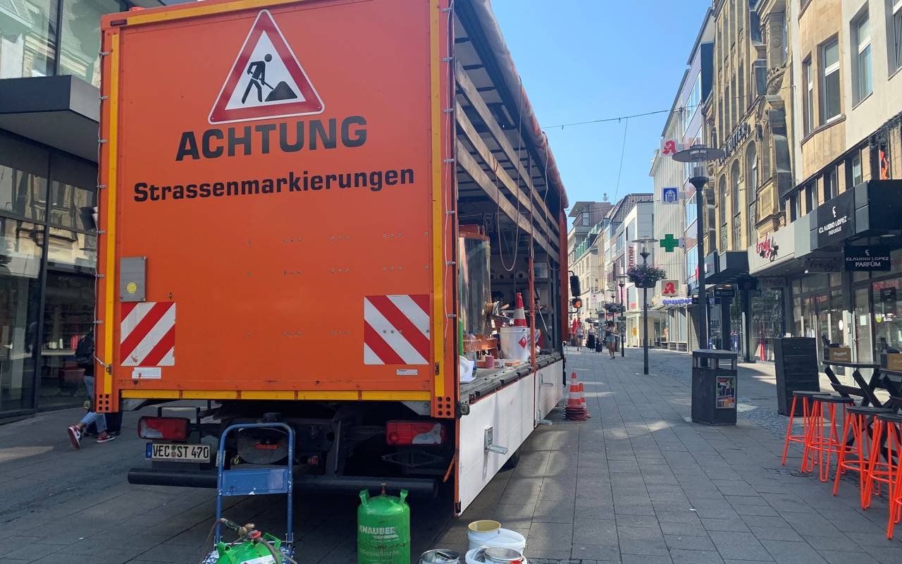 In der Innenstadt in Essen leuchten ab Sonntag (11. Juni) auf dem Boden in der Fußgängerzone drei bunte Regenbogenmarkierungen. Sie sollen ein Zeichen für eine bunte und tolerante Stadtgesellschaft sein. Die größte bunte Fläche gibt es auf der Kettwiger Straße in Höhe der Kreuzung I. Dellbrügge zu sehen. Sie ist acht mal sechs Meter groß. Die jeweiligen bunten Streifen sind jeweils einen Meter breit. Sie bestehen aus Thermoplast und wurden eingebrannt. Das Material wird sonst für gängige Straßenmarkierungen wie zum Beispiel Zebrastreifen verwendet. Es ist damit besonders widerstandfähig. Für die besonderen Flächen mussten die bunten Farben extra aus dem Ausland importiert werden. Das Projekt kostet ca. 10.000 Euro.