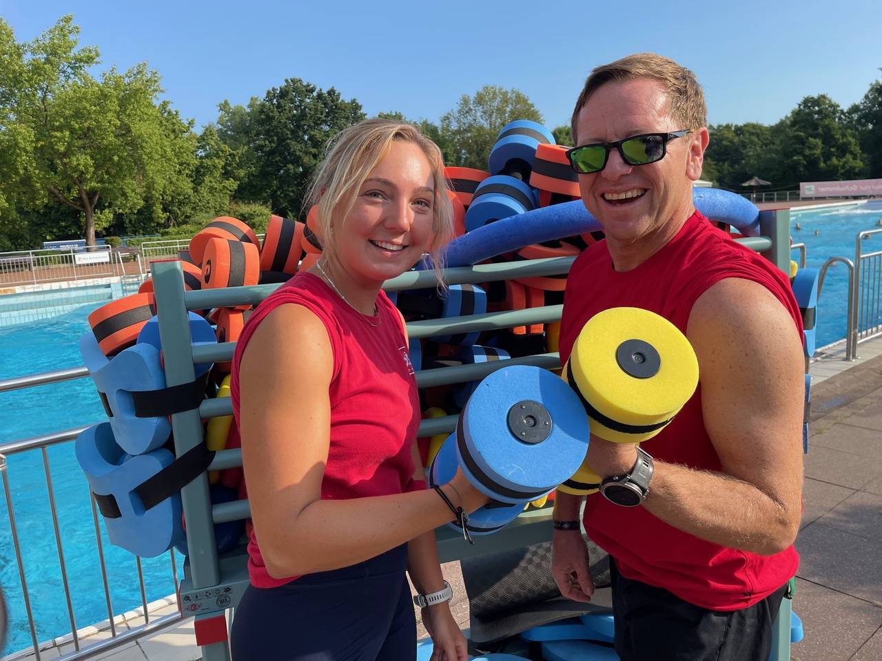 Jetzt, am Mittwoch (6. August) gibt es schon über 70 Anmeldungen für den Rekordversuch. Es ist aber noch mehr Platz für weitere Teilnehmerinnen und Teilnehmer. Für den Rekordversuch wurden extra noch zusätzliche Schwimmnudeln und Hanteln aus dem Schwimmzentrum Rüttenscheid besorgt. Bei der Generalprobe am Mittwoch waren Radio Essen-Stadtreporter Timm Schröder und rund 20 Sportlerinnen und Sportler dabei.