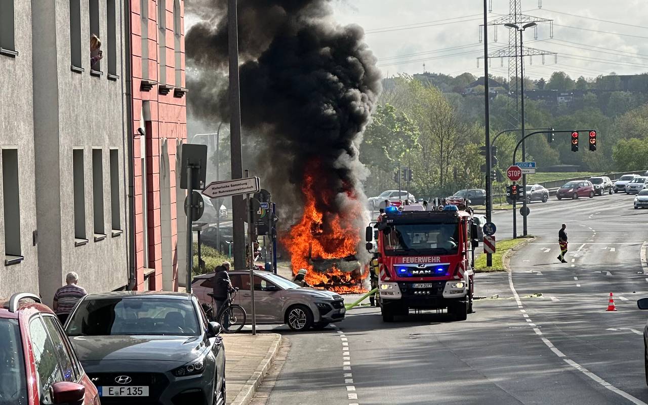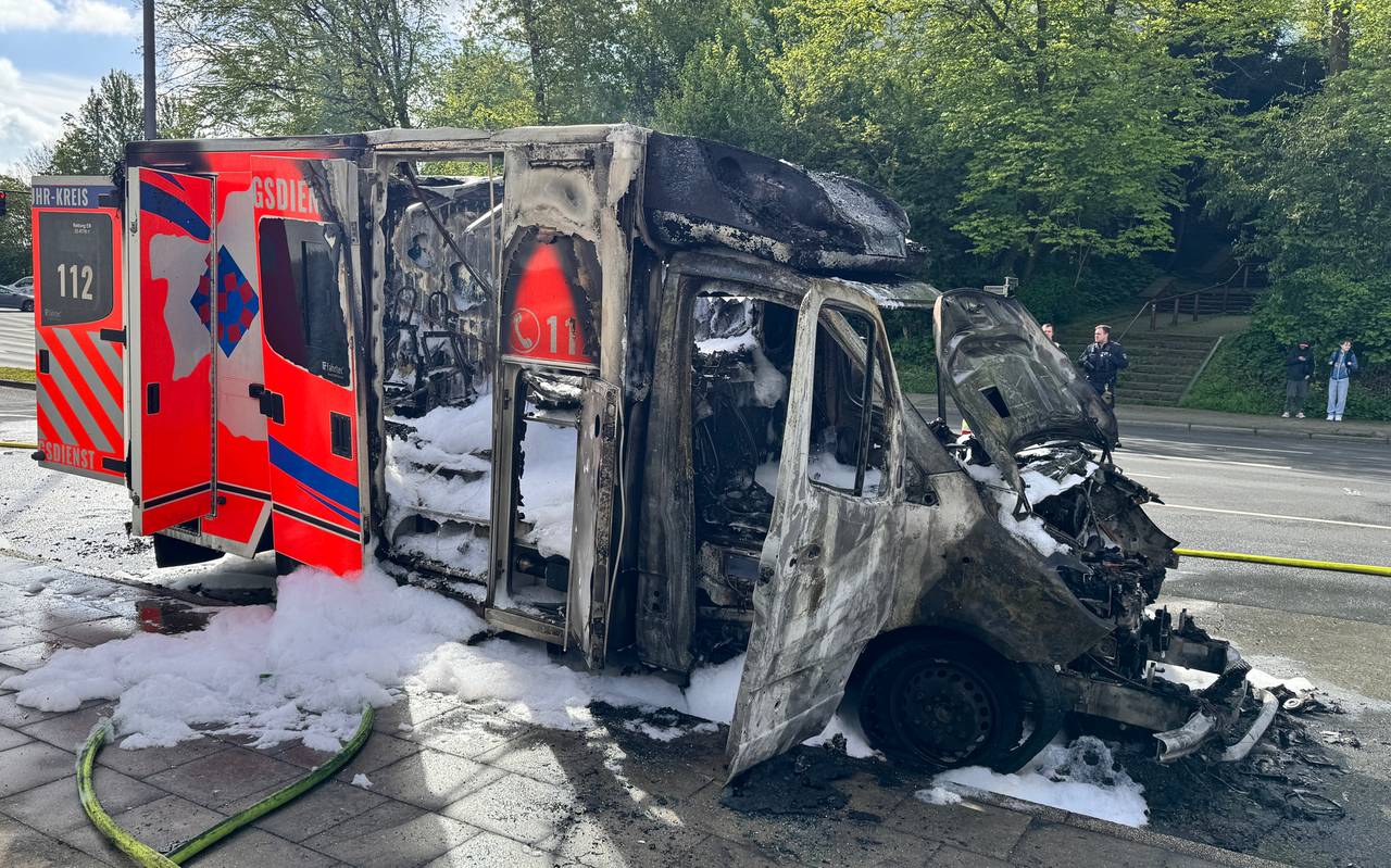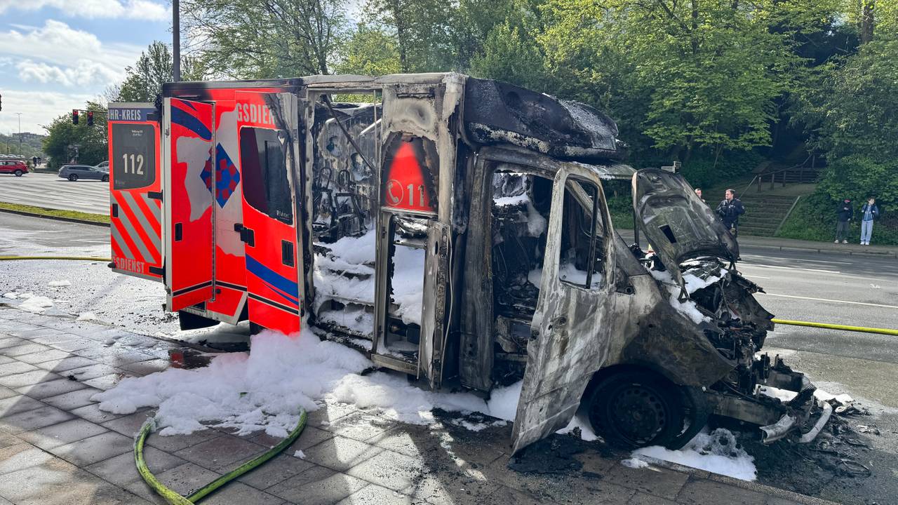 Die Feuerwehr Essen musste am Montagvormittag (15. April) zu einem Einsatz auf der Wuppertaler Straße Ecke Frankenstraße ausrücken. Dort brannte ein Rettungswagen der Feuerwehr Hattingen, der gerade ohne Patienten an Bord in Essen unterwegs war. Die Einsatzkräfte in dem Wagen bemerkten Qualm im Motorbereich. Sie hielten an einer Bushaltestell, brachten die Sauerstoffflaschen und wichtige Technik in Sicherheit. Dann brannte der Wagen auch schon komplett. Die Feuerwehr Essen musste ihn löschen. Die Frankenstraße war Bereich der Bushaltestelle "Annental" komplett gesperrt.